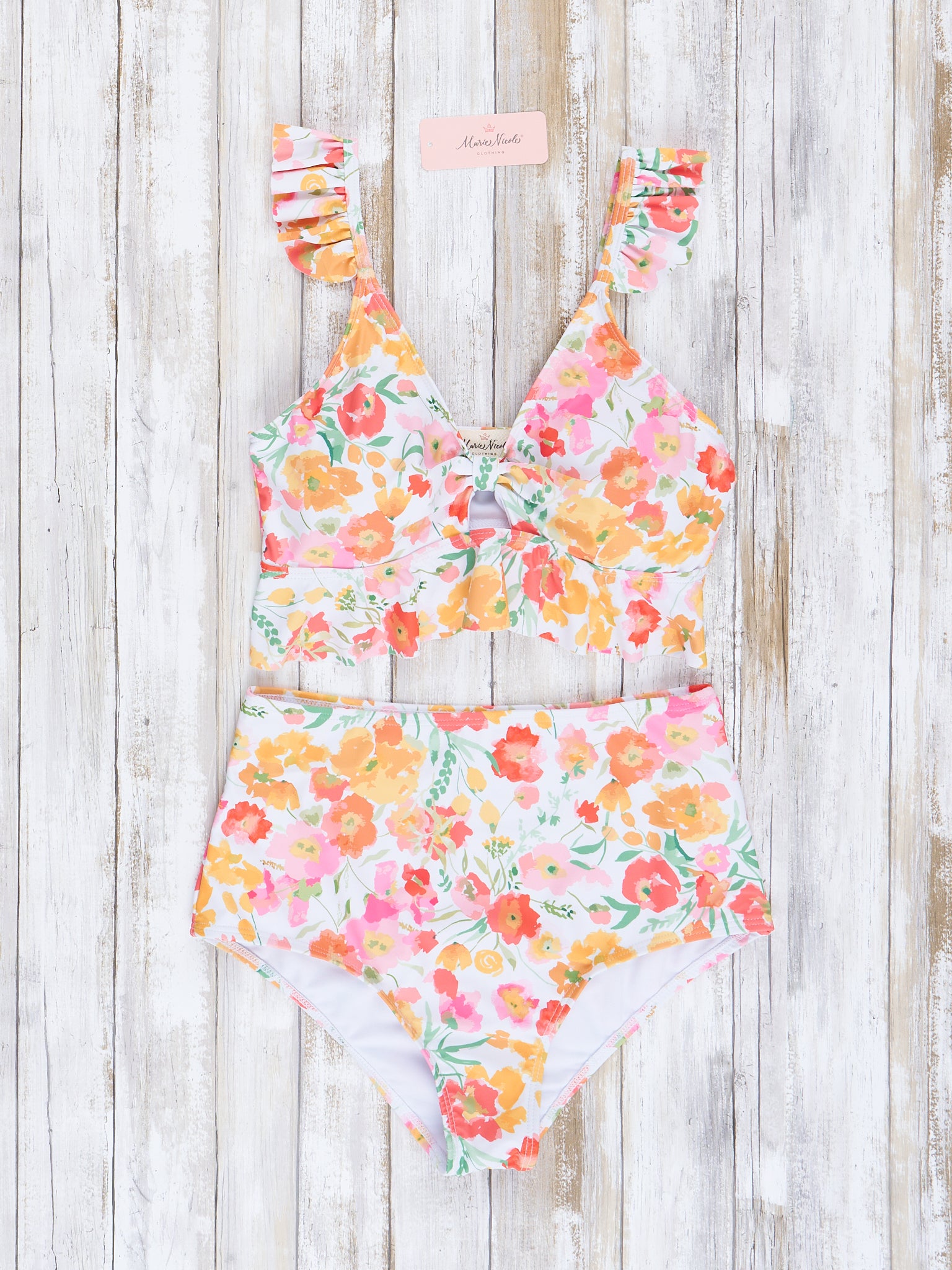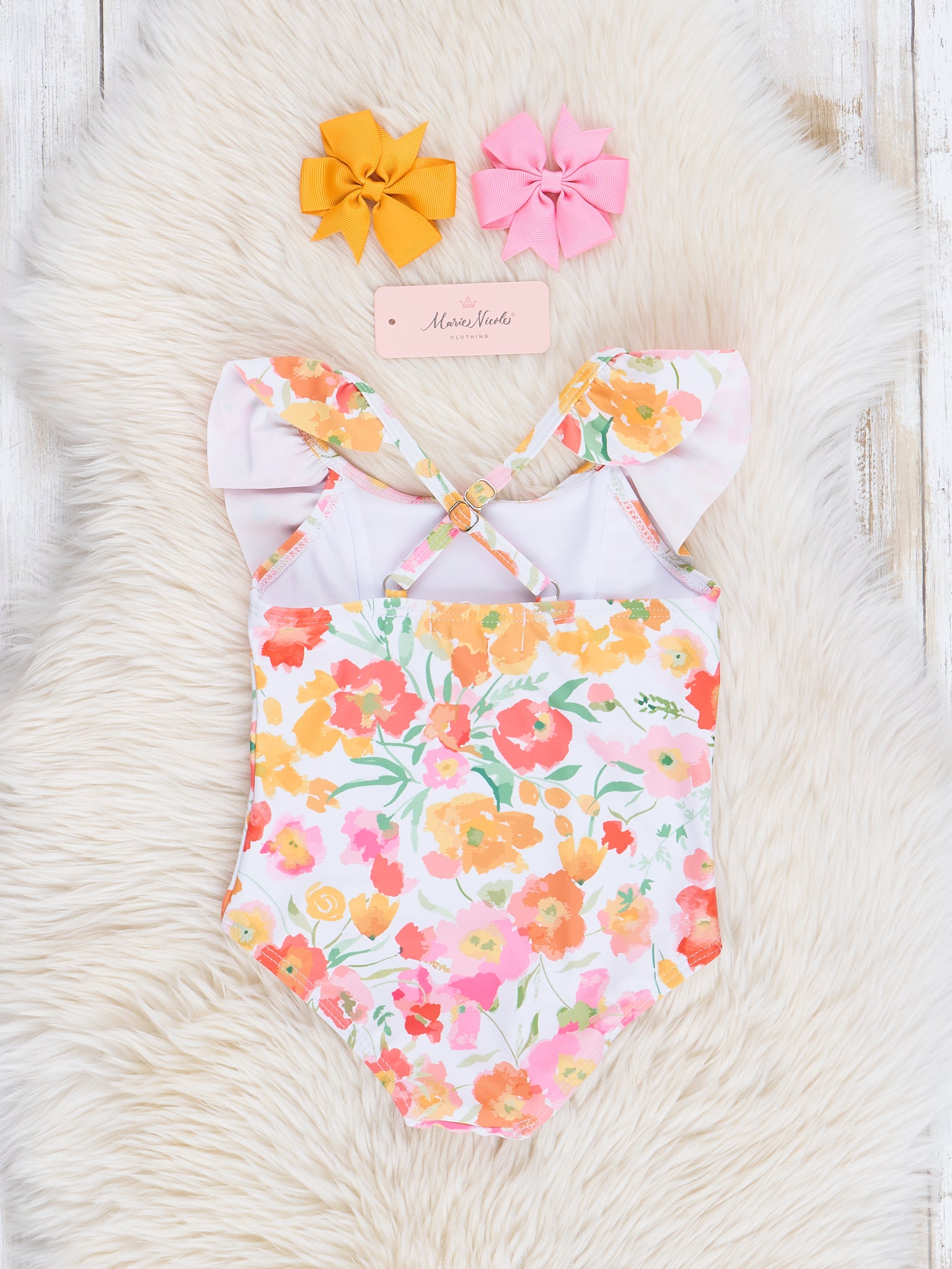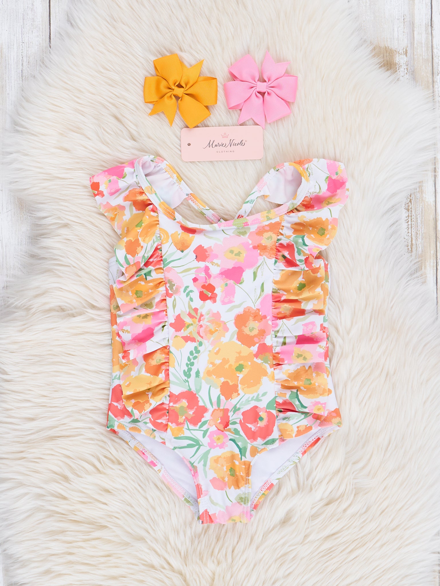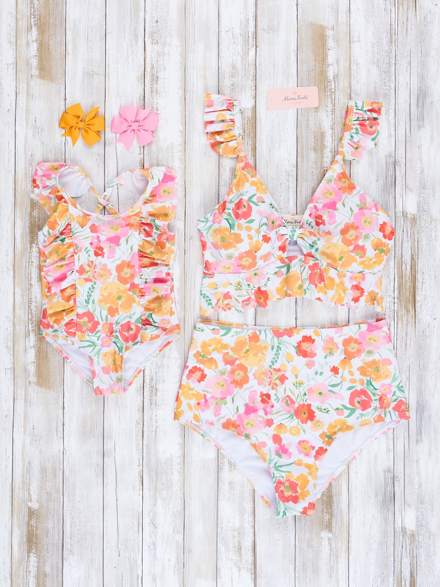 Soak up the sun in style with our Mom & Me Yellow & Orange Watercolor Blooms Ruffle Swimsuit. Featuring a cute and fun floral print and trendy ruffle details, this swimsuit is perfect for twinning with mom. Dive in and make a splash together!