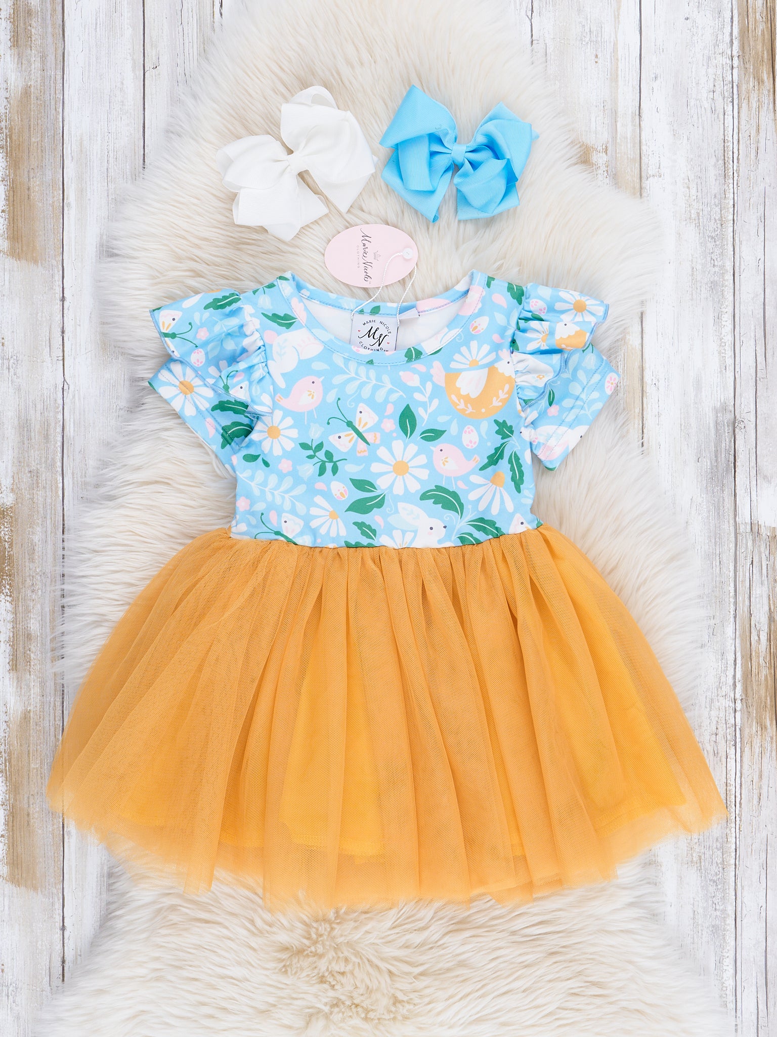 A special sister set for your beautiful girls! This dress features daisies, bunnies, flutter trim, & a fully lined tulle dress skirt.