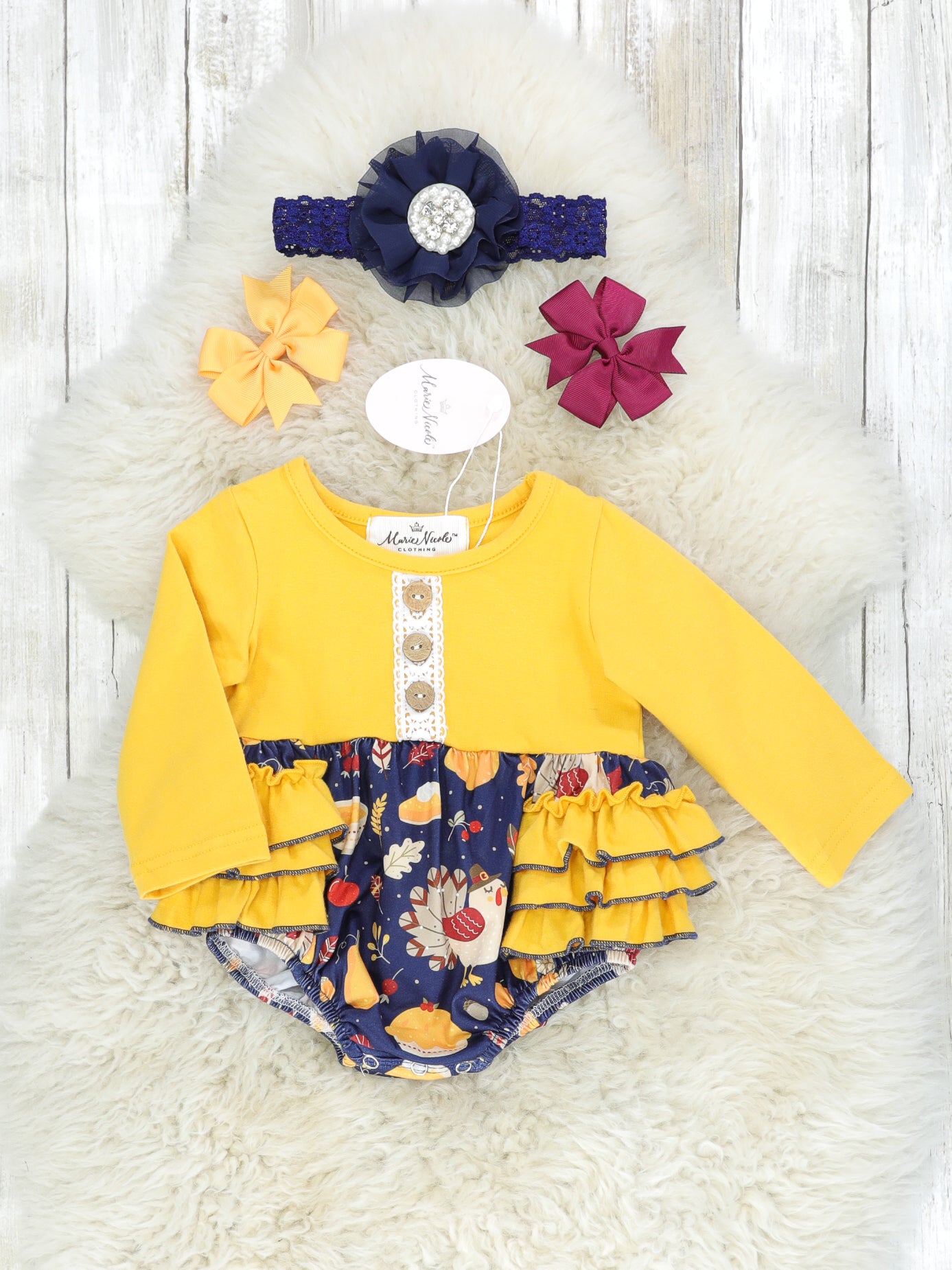 This is a must have turkey sister set! This mustard romper features decorative buttons, navy turkey details, & a ruffle butt.