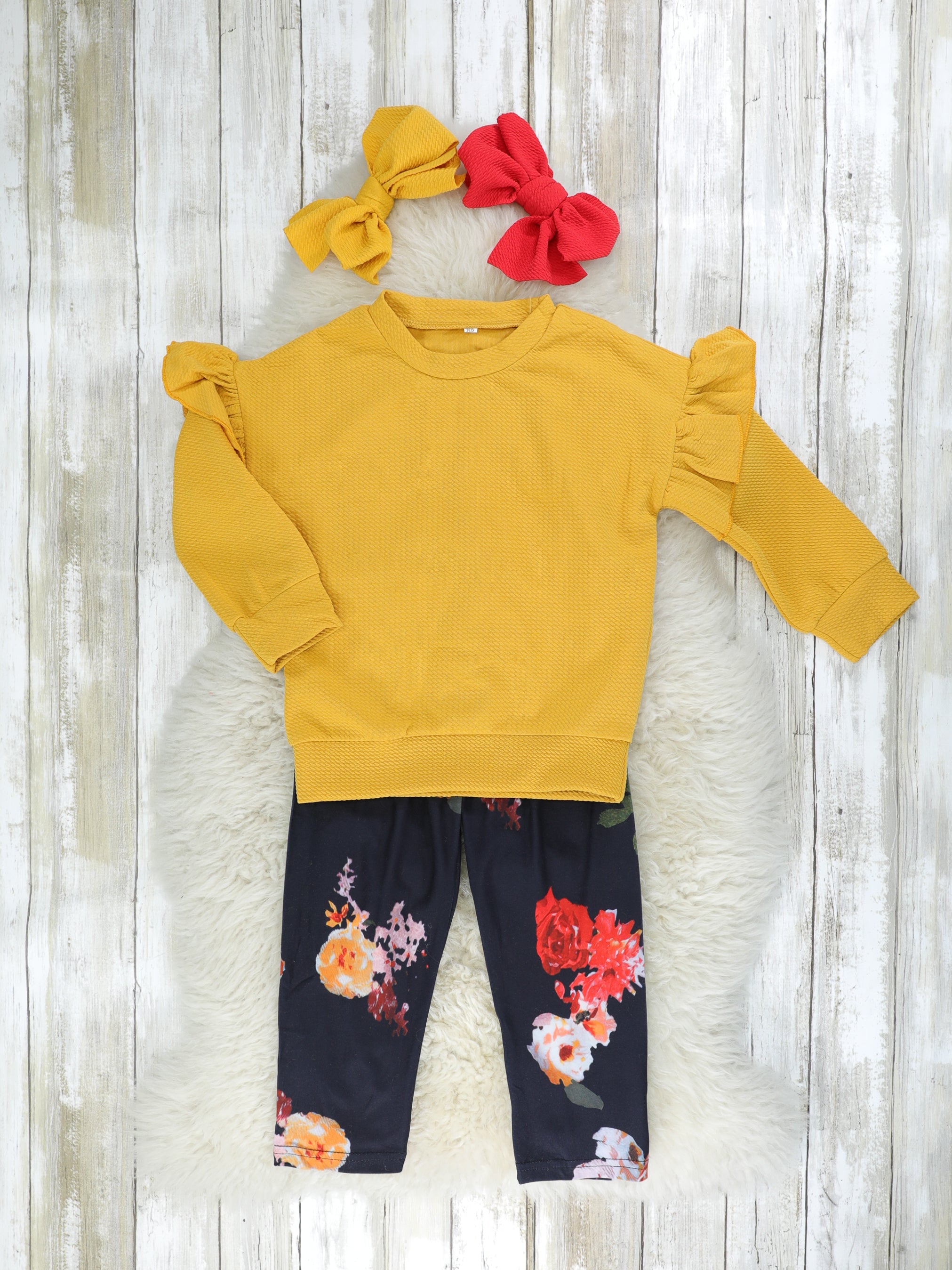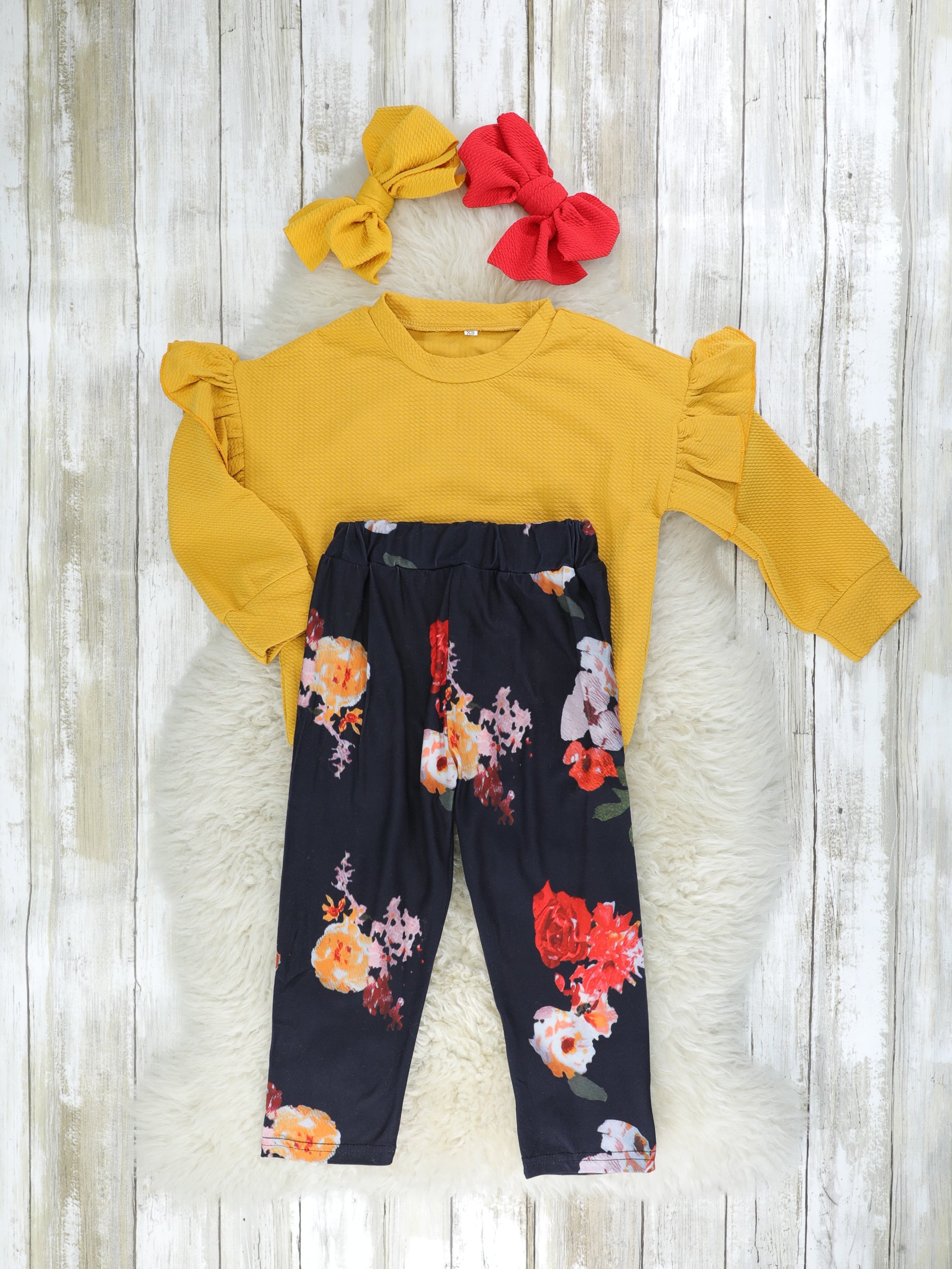 This adorable outfit is a great fall staple! This outfit features a mustard top with ruffle trim & dark floral pants with an elastic waistband.