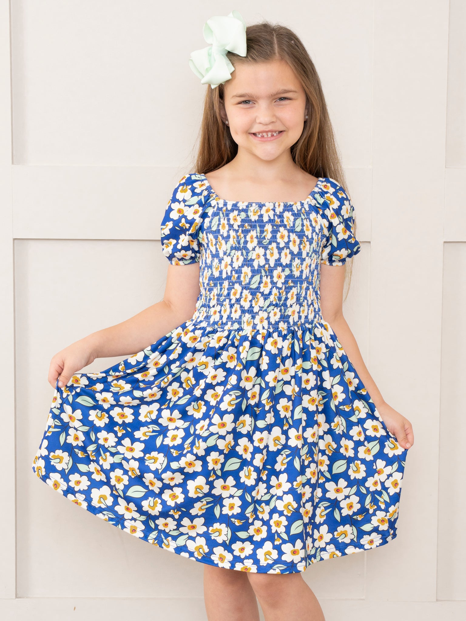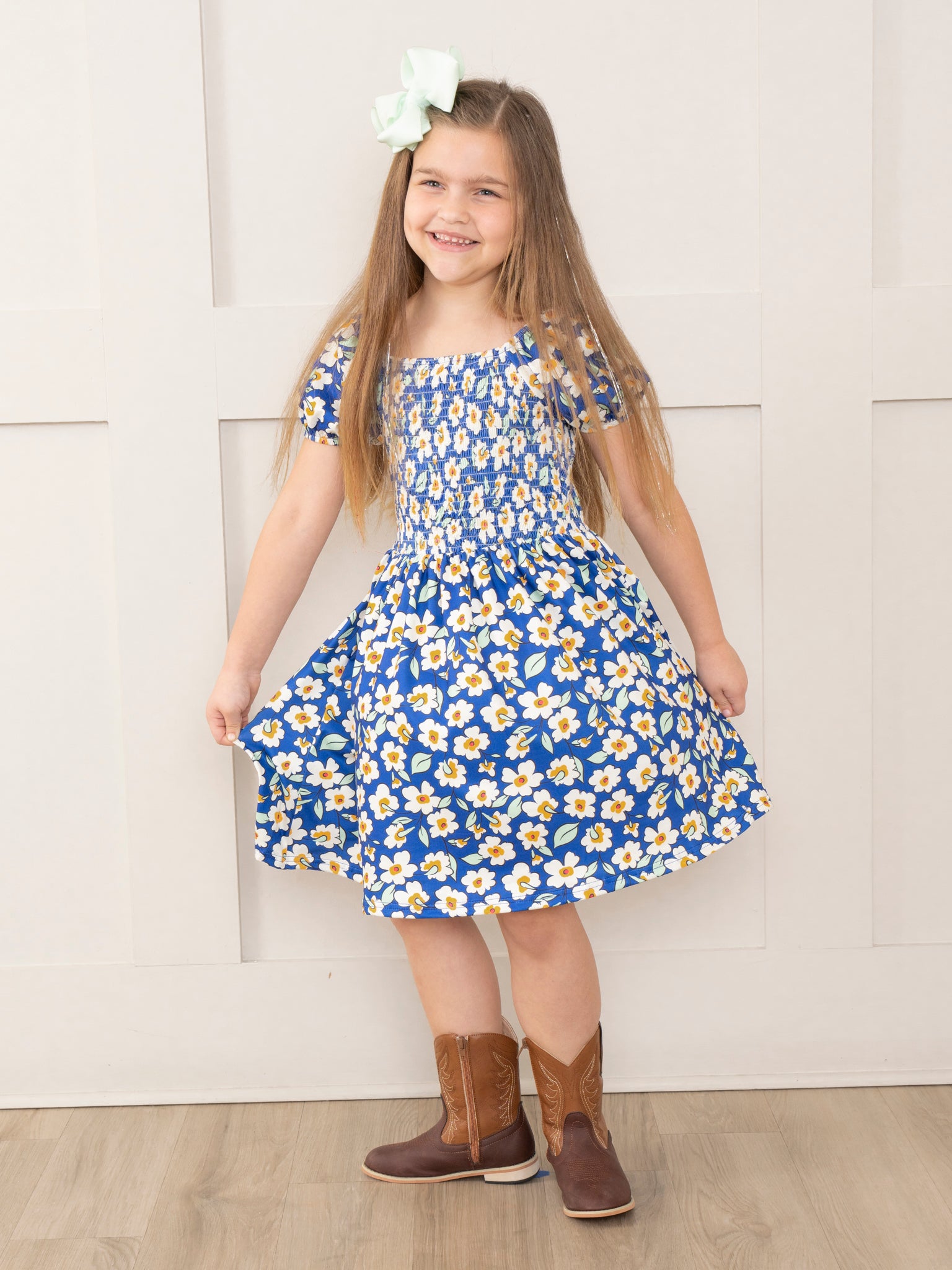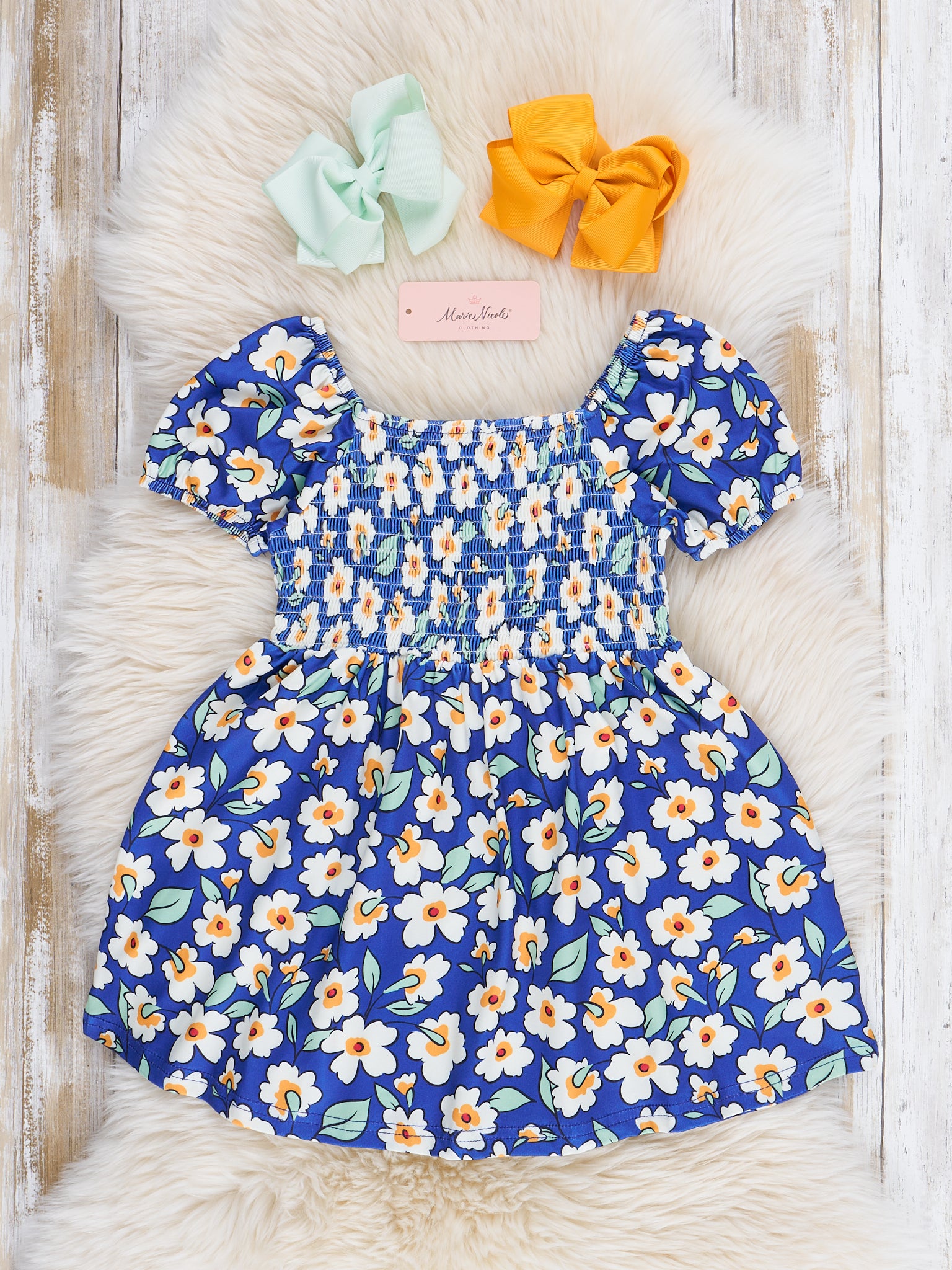 Bloom in style with our Navy Blooms Smocked Ruffle Dress! This adorable sister set features delicate floral prints and playful smocking, perfect for any little fashionista. Let your little one stand out in this unique and charming dress!