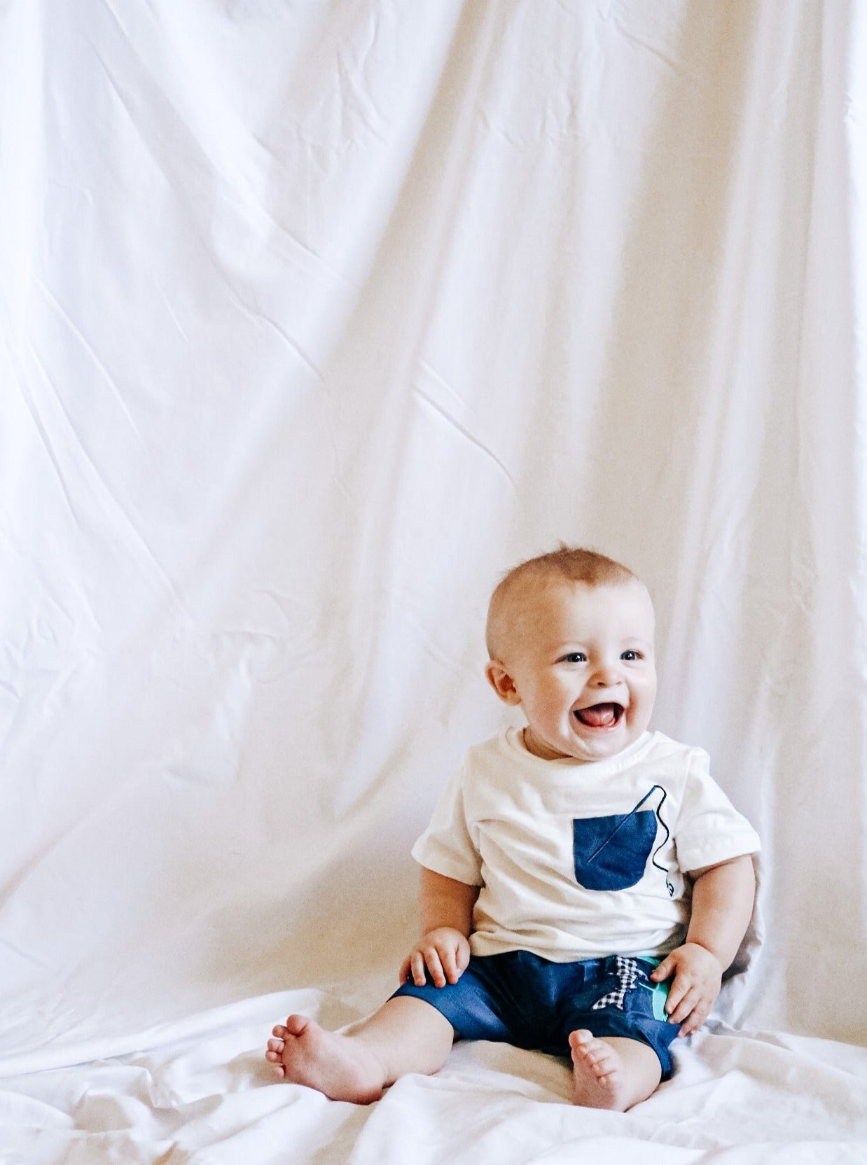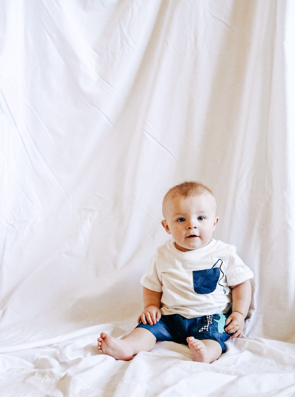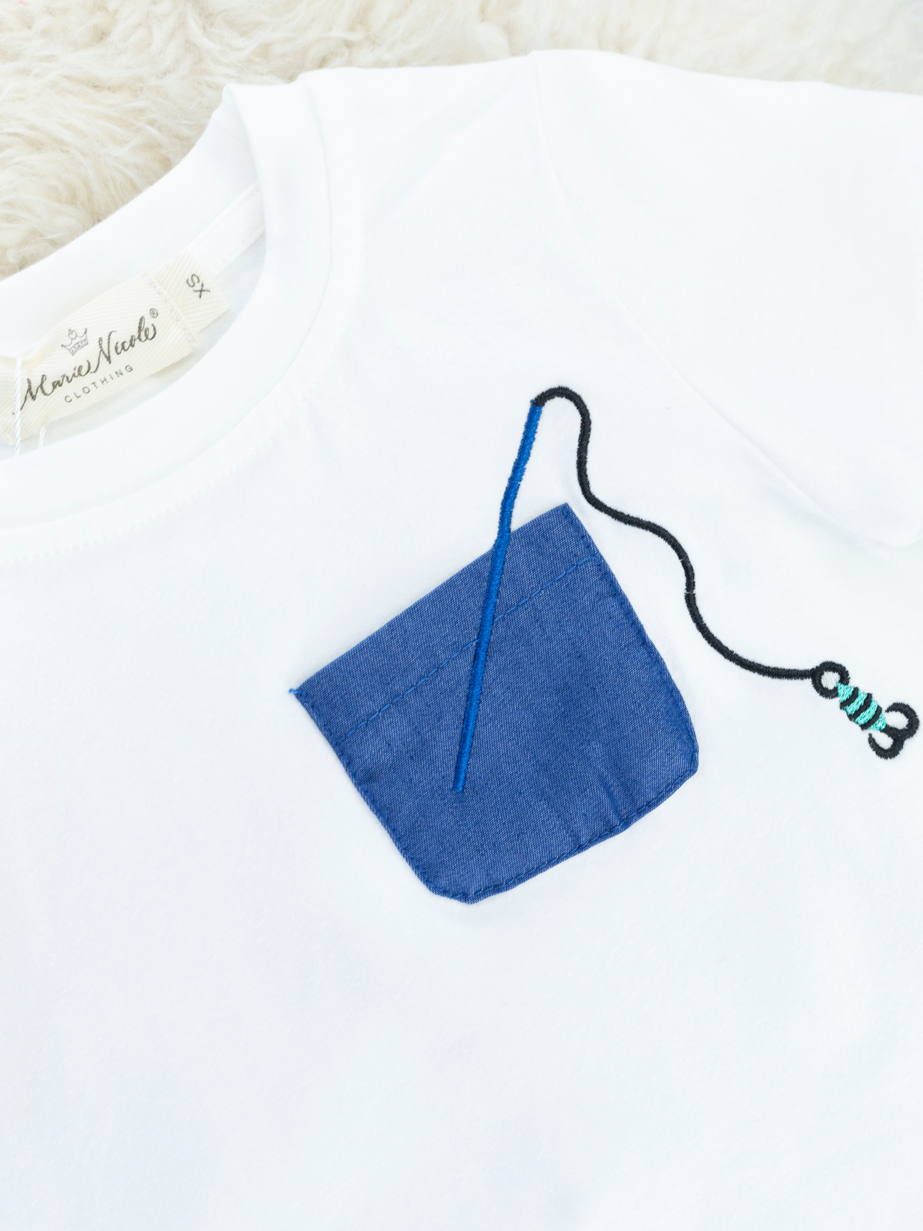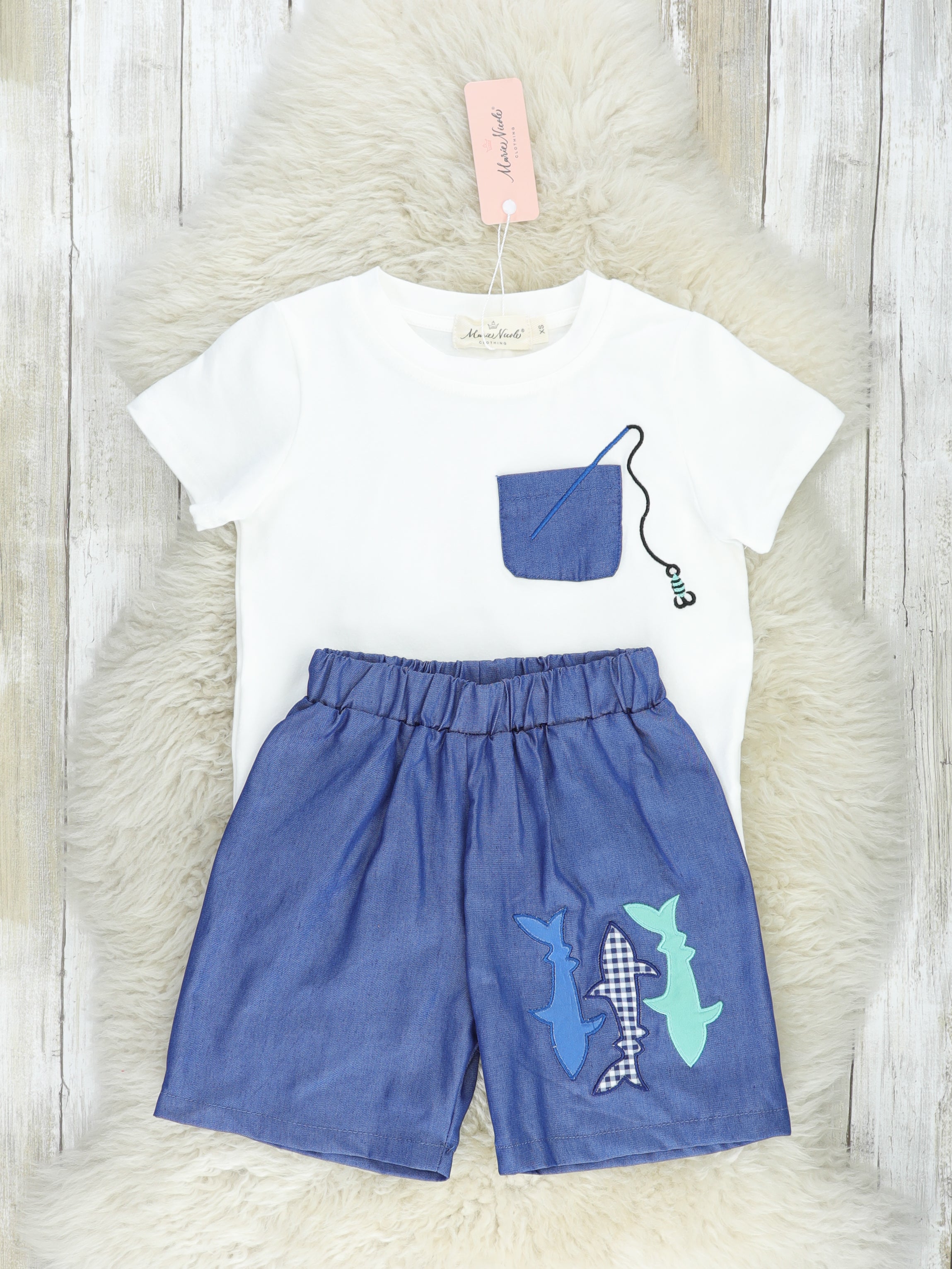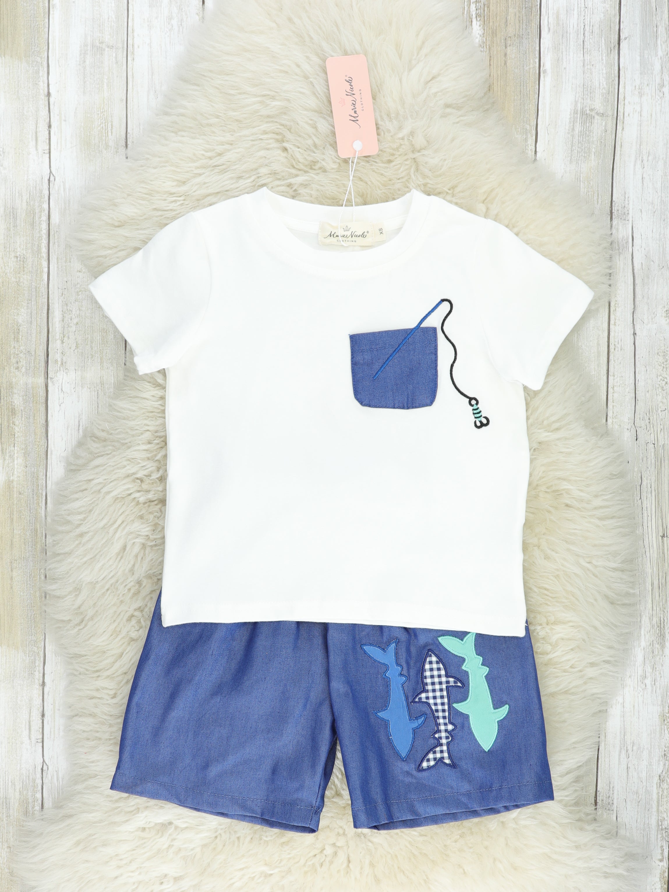 Dress your little one in this playful Navy Fish Pocket Outfit and have a real catch of a day! Show off their fashion-savvy side with this stylish ensemble featuring a white top and navy shorts, plus a patch pocket with a fun fishing detail to reel in the compliments. So comfy they won't want to take it off with its elastic waistband. You might just be netting a new favorite outfit!