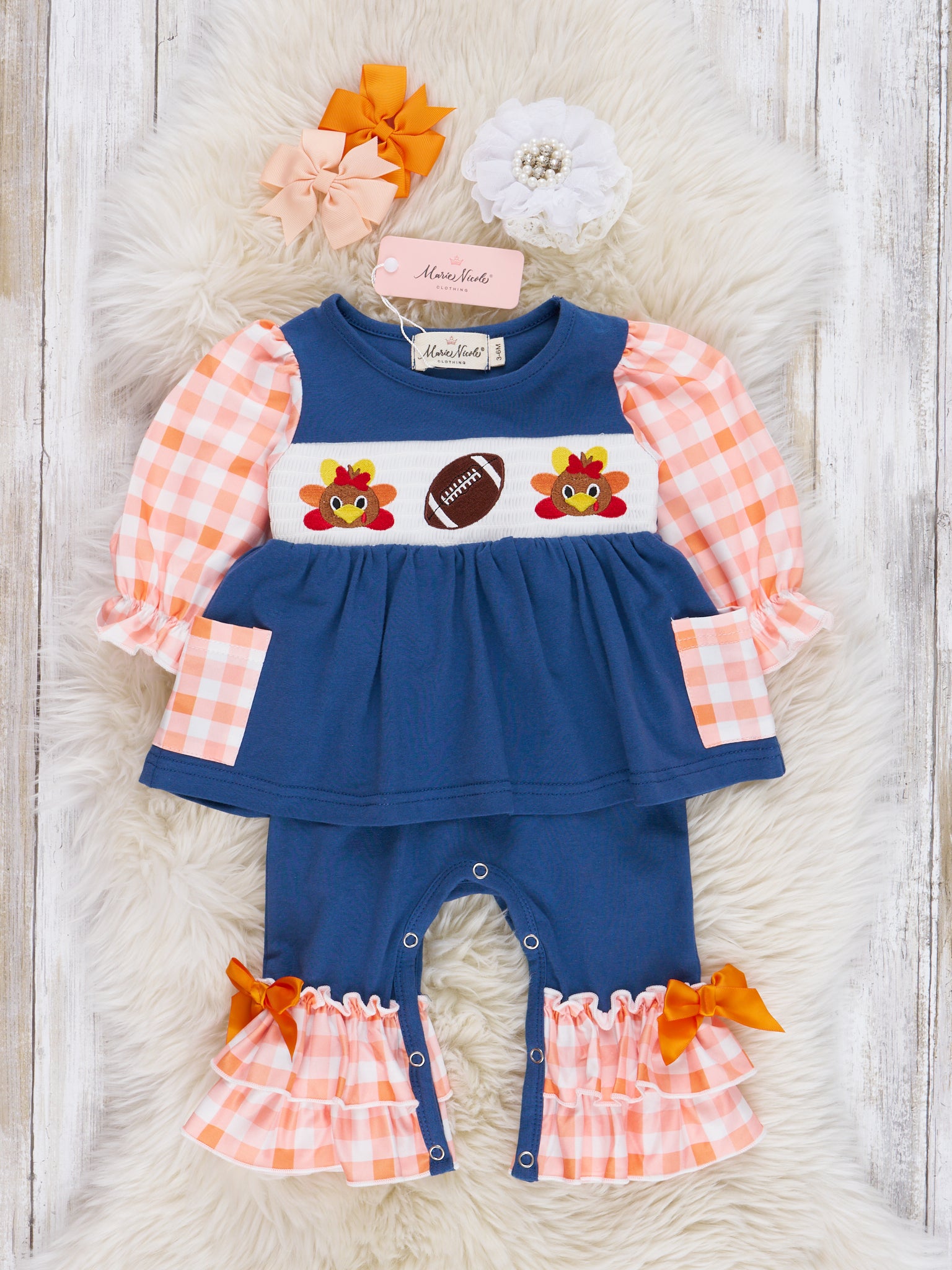 Score a touchdown in style with this Navy & Orange Plaid Smocked Football Sibling set! This fun and fashionable ruffle romper features a cheerful orange plaid print with a smocked scene of a classic football game. Get your little ones ready for game day in the cutest way possible! 🏈