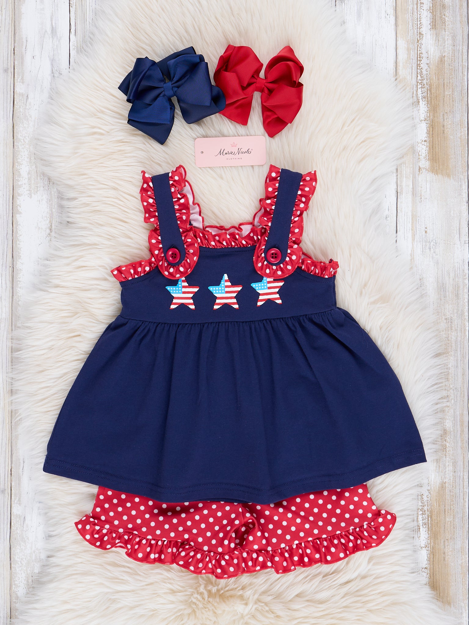 Show your littles' patriotic pride with the Navy Patriotic Stars sibling set. With a stylish navy design and bold patriotic stars, this outfit is perfect for celebrating the 4th of July in style. Plus, the red shorts add a unique touch to this playful and fun ensemble.