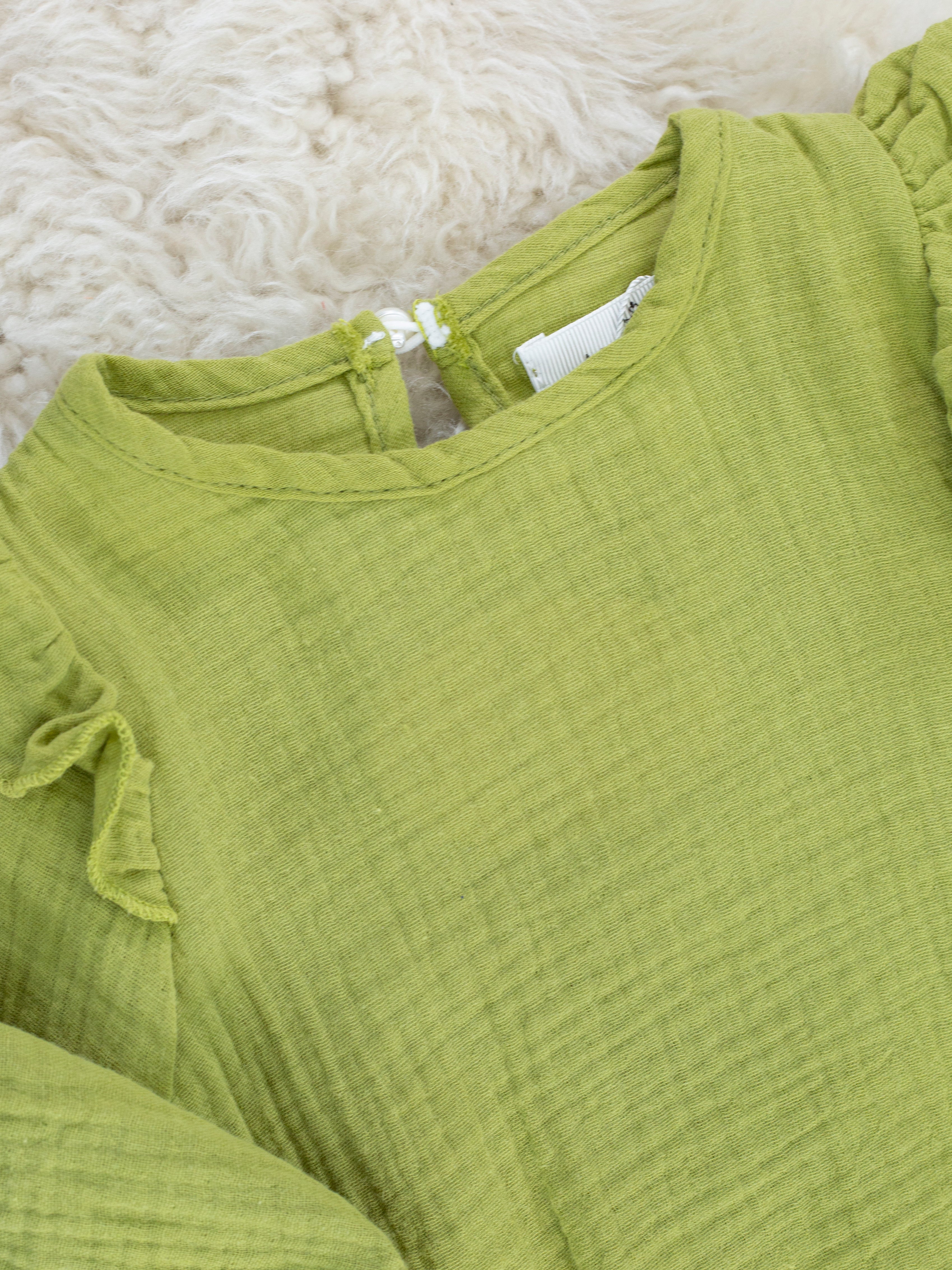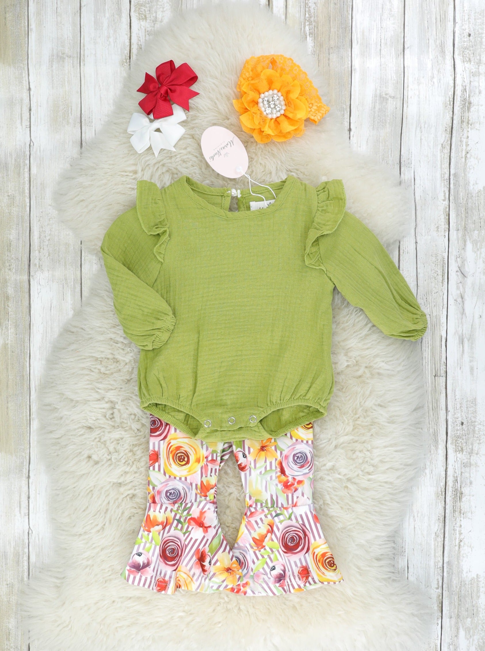 Olive Ruffle Onesie & Bright Rose Bell Bottoms