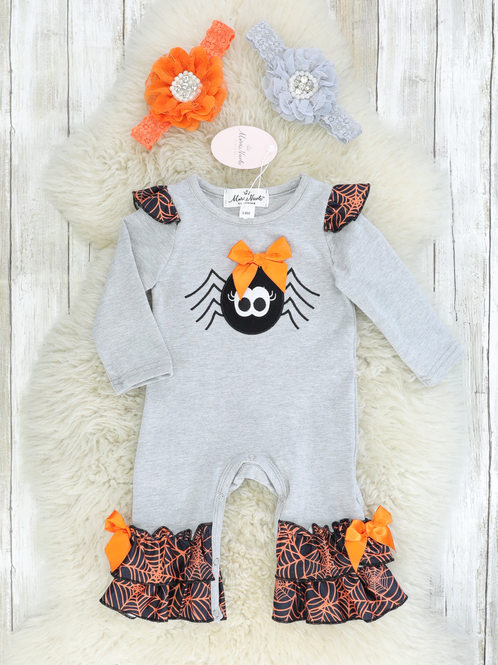 The sweetest sister set for your itsy-bitsys! This grey romper features flutter trim, a spider web design ruffle trim around the ankles, & a sassy spider detail.