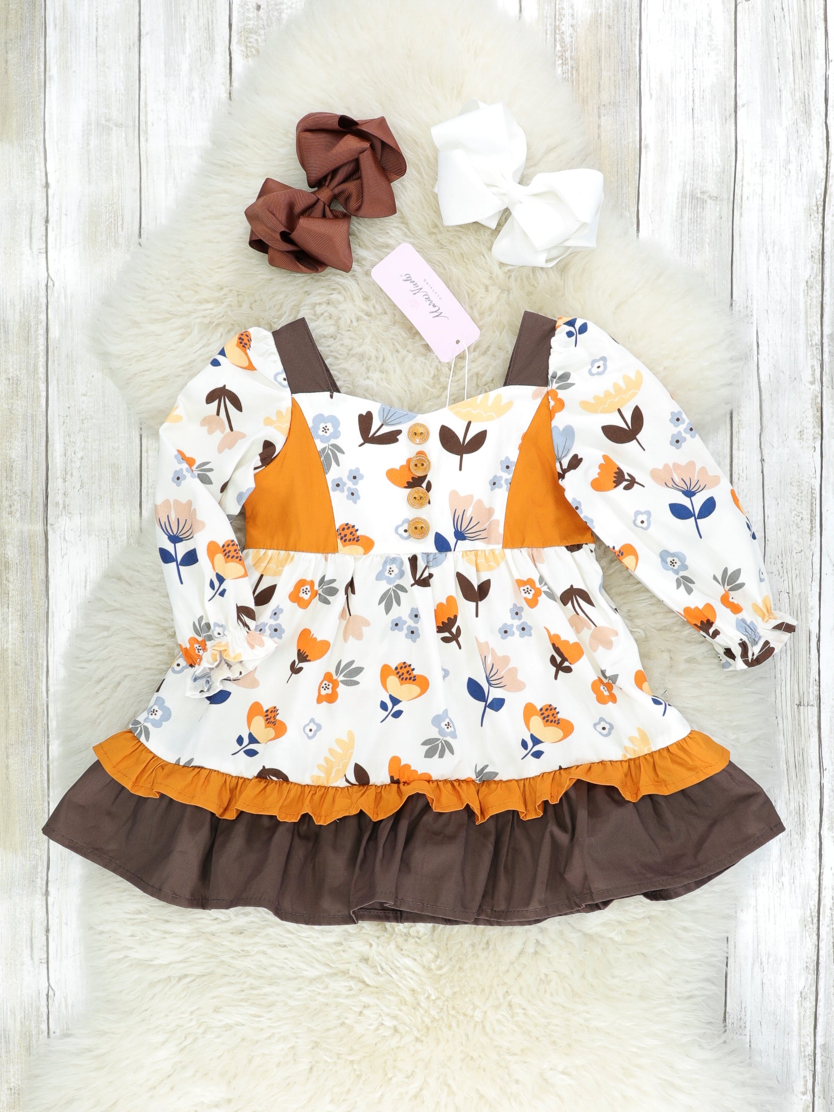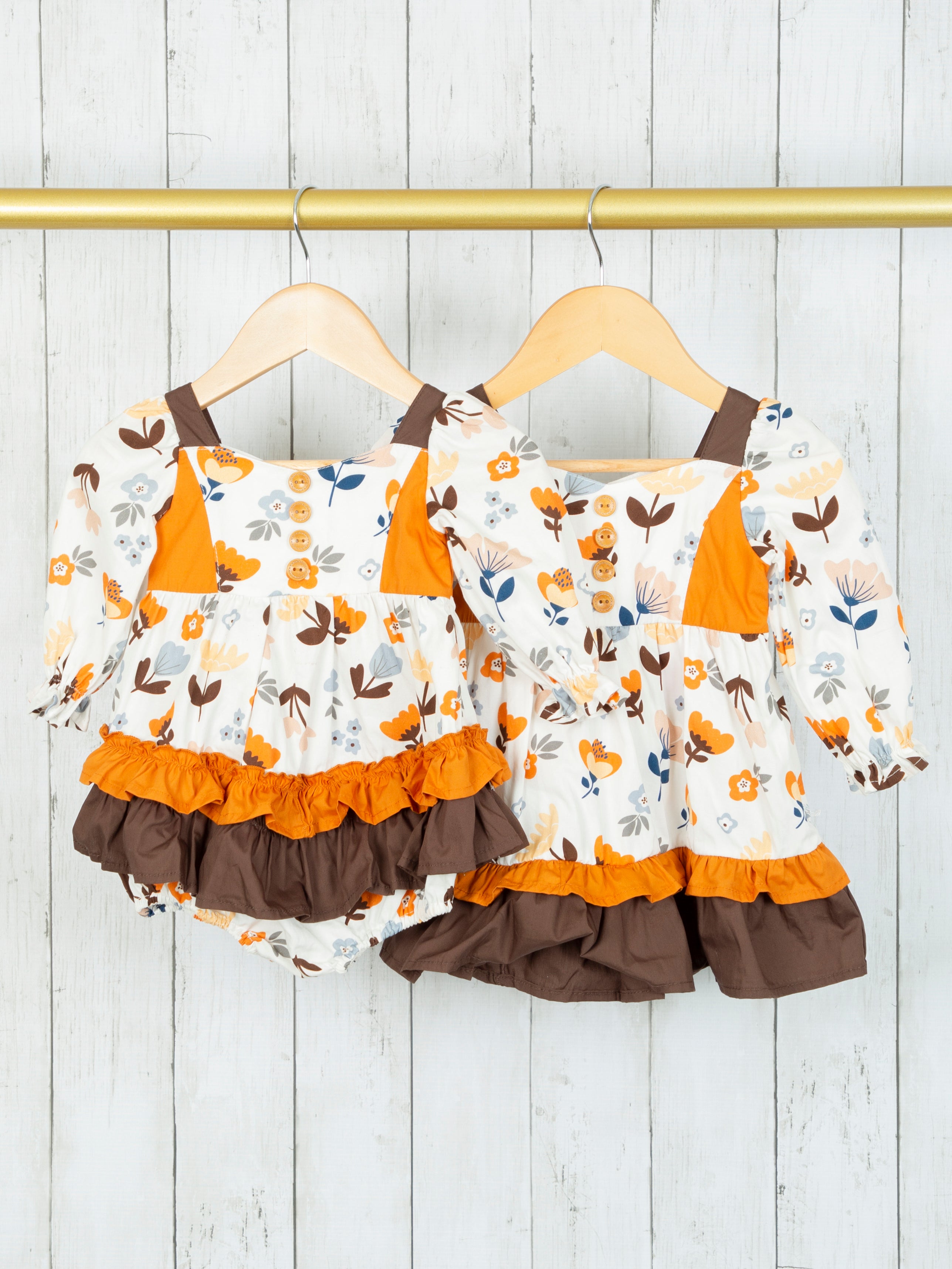 We're FALL-ing for this sister set! This dress features nonfunctional buttons, cinched sleeves, tiered orange & brown ruffles, gorgeous fall floral details, & a zippered back.