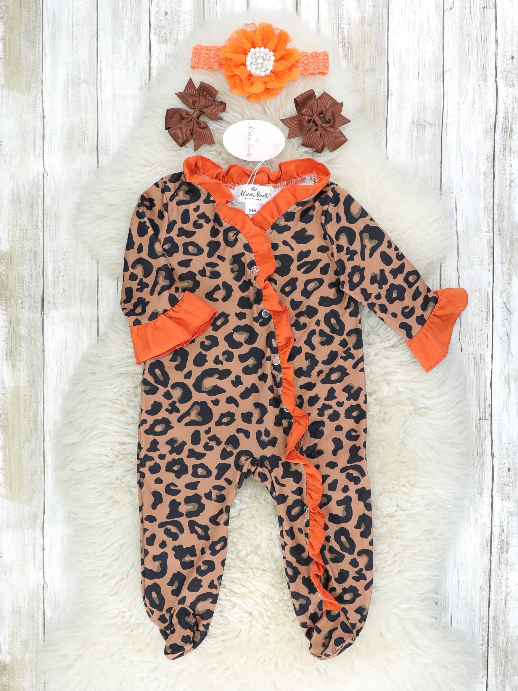 The sweetest leopard pajama set for the best cuddles! This leopard romper features orange ruffle trim & a functioning zipper.