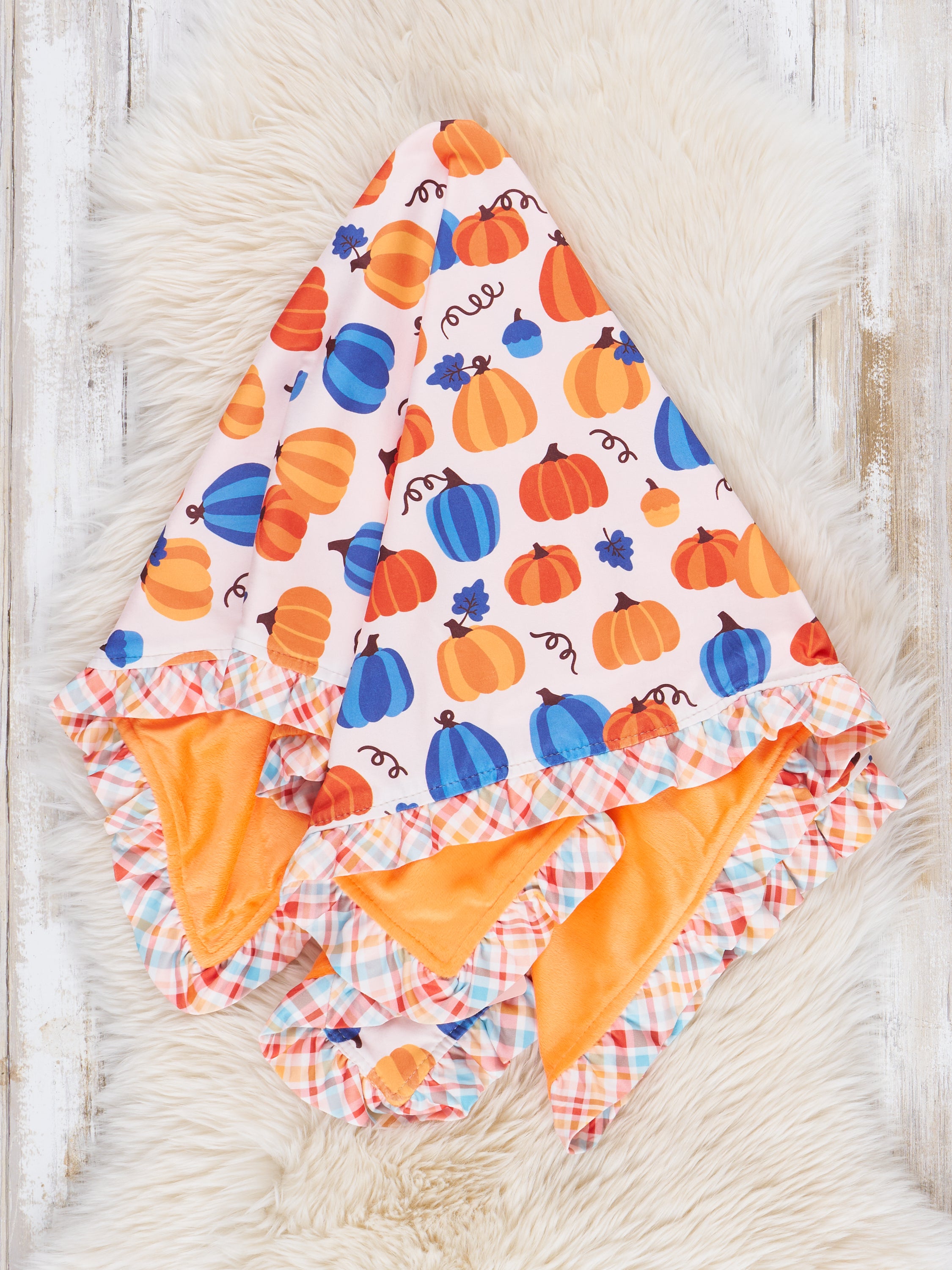 Orange Blooms & Blue Plaid Pumpkin Ruffle Minky Blanket