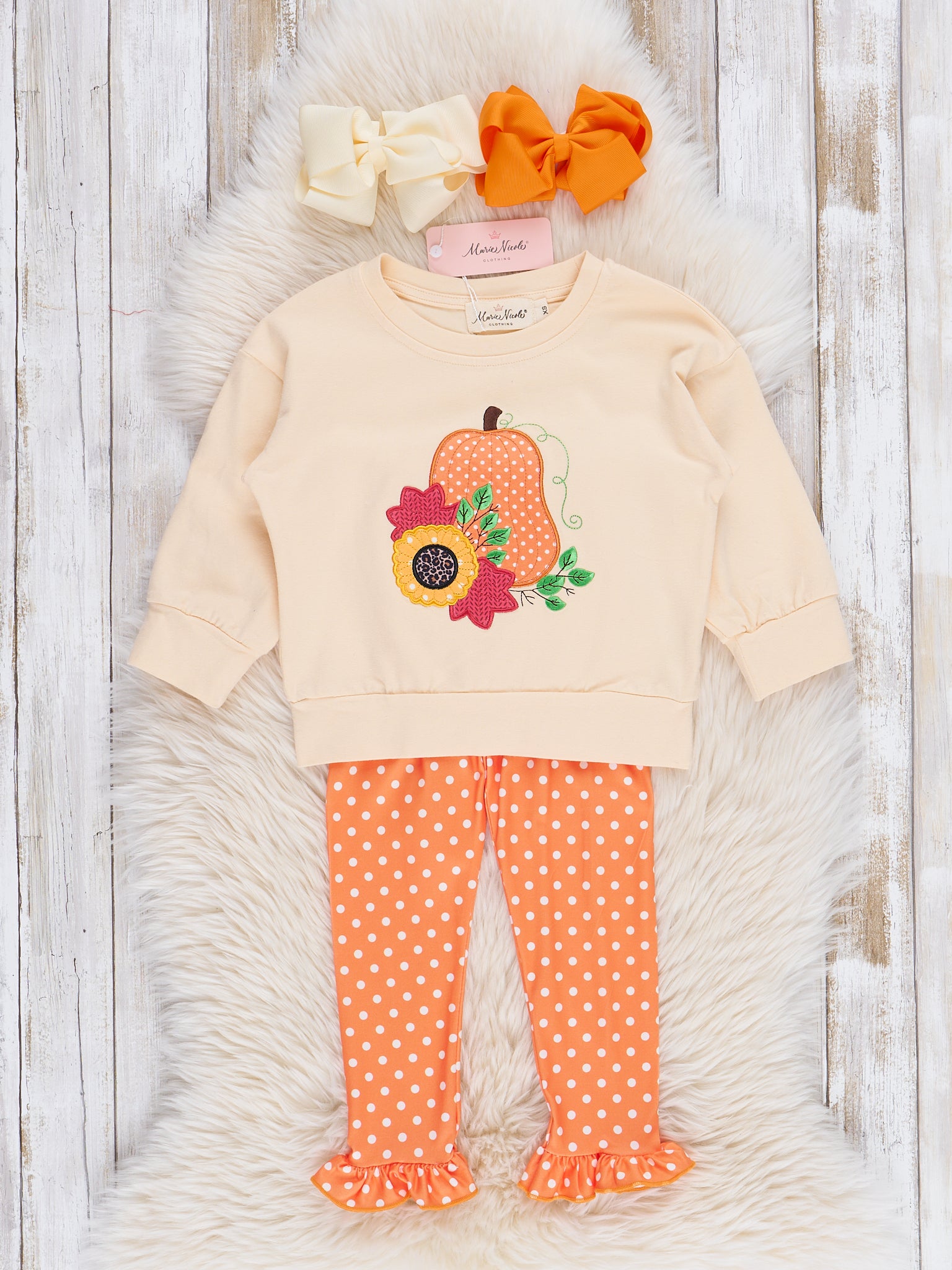 Get your little one ready for fall with this GOURD-eous sister set! The peach shirt features beautifully embroidered autumn gourds, while the orange polka dot ruffle hem pants add a playful touch. Perfect for any occasion, this outfit is sure to make your child stand out in style.