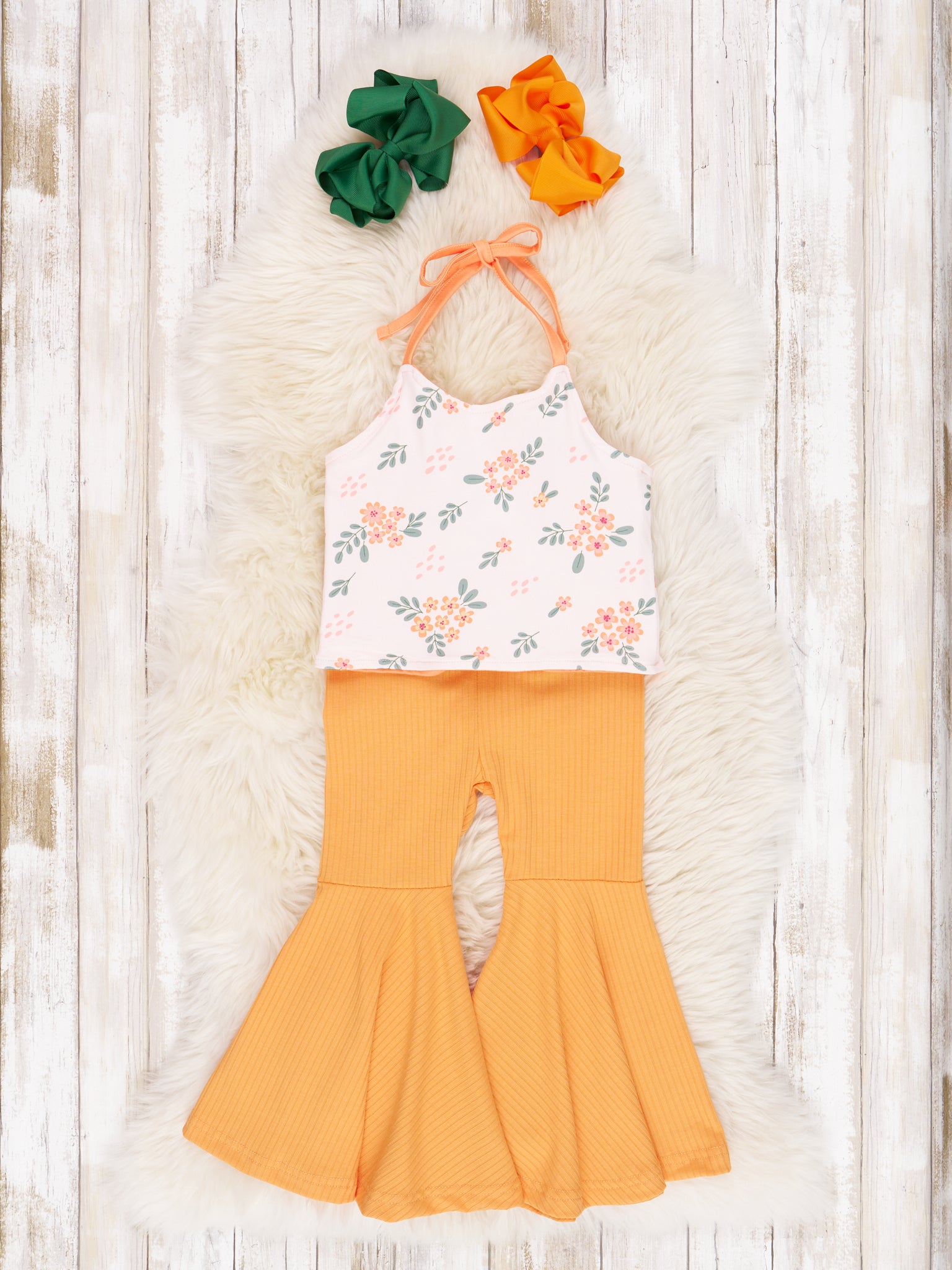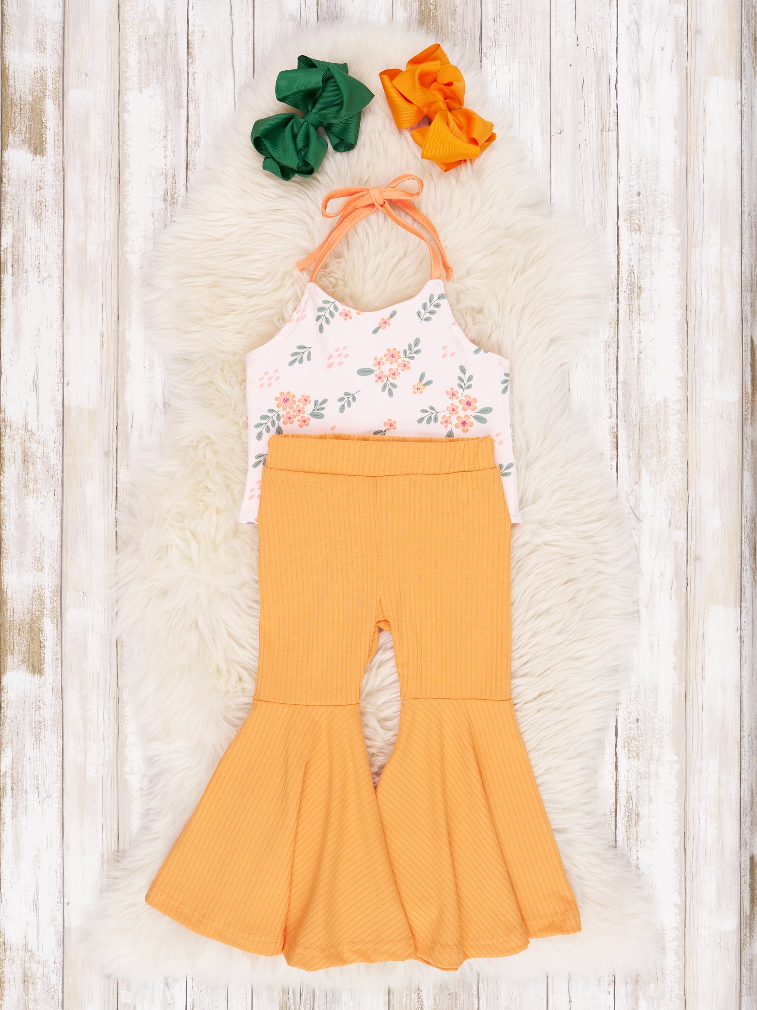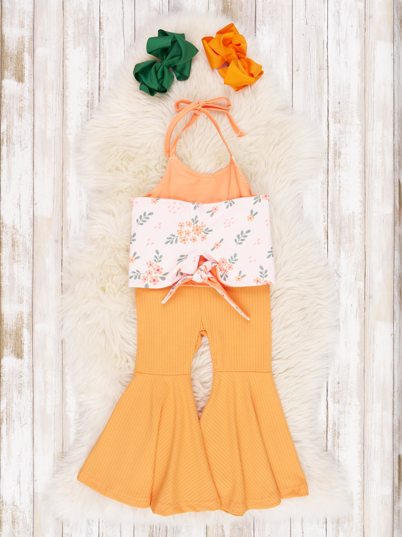 Dress up your mini-me in this eye-catching Orange Floral Tie Tank & Bell Bottoms Outfit! With its bold orange florals and fun bell bottoms, your mini-fashionista will be rocking this look. Plus, the elastic waistband makes for fuss-free fashion!