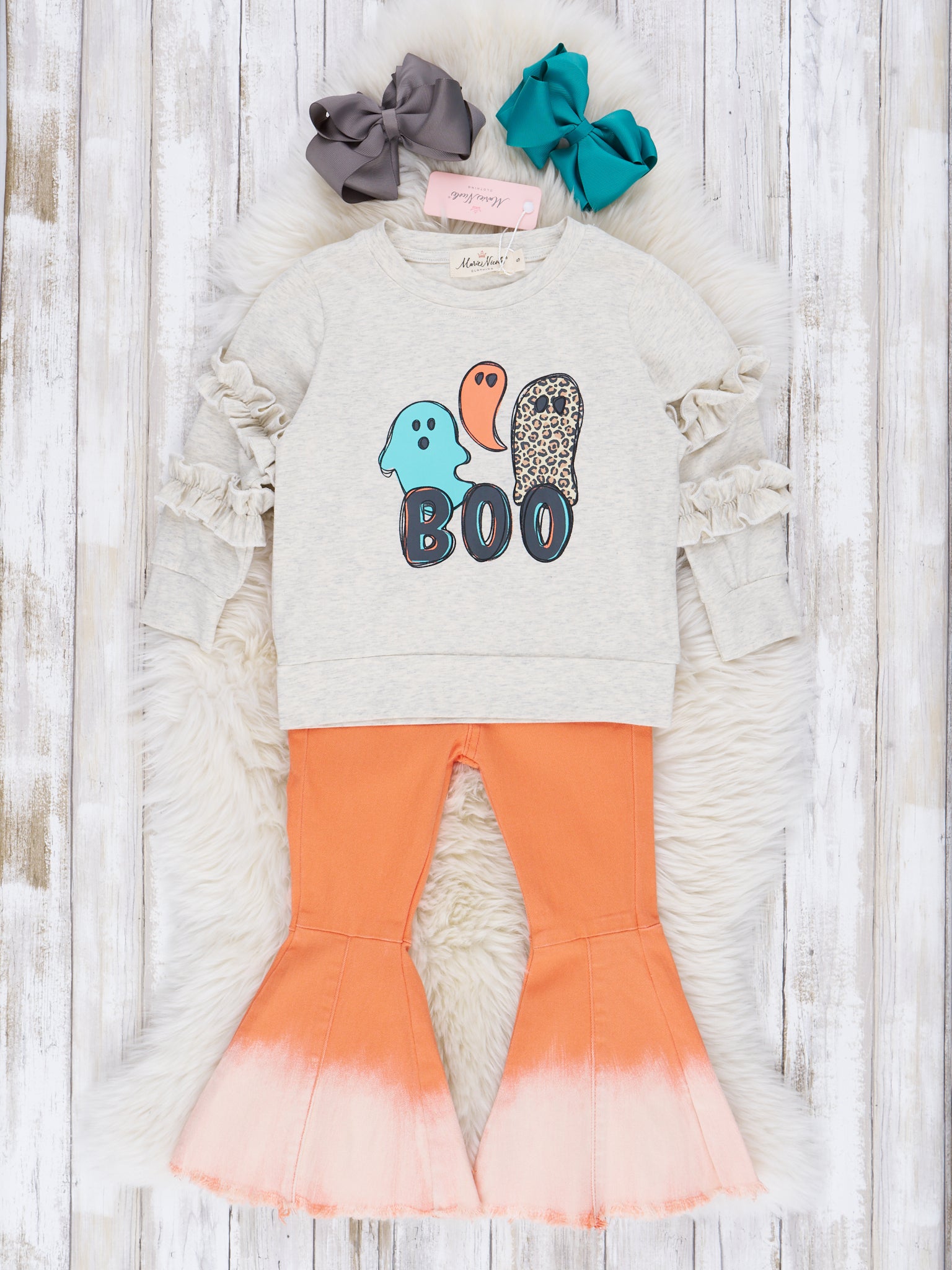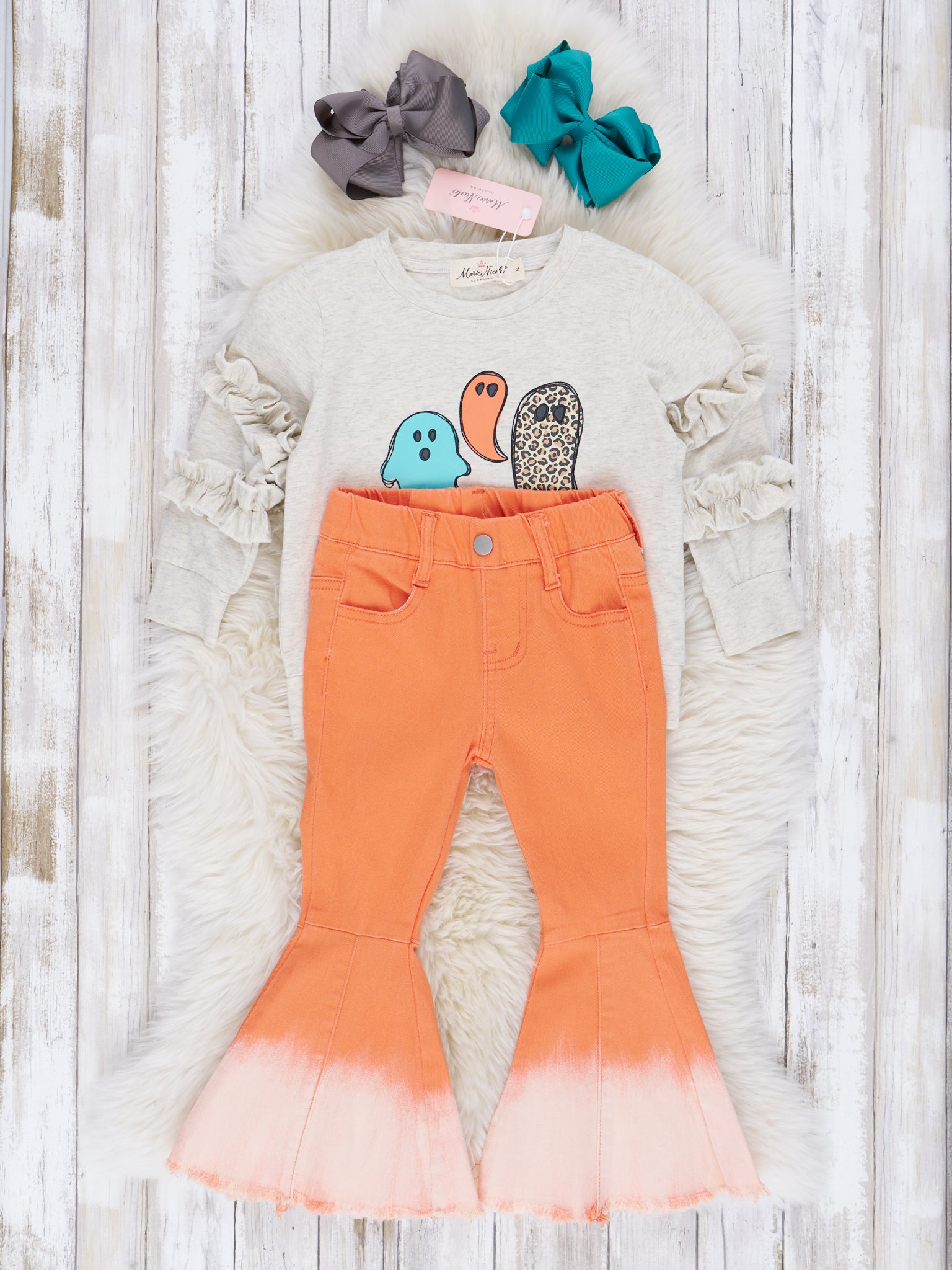 This Boo-tiful outfit features a ruffle sleeve top with an adorable ghost sublimation design. The ombre-dyed bell bottoms match perfectly, featuring a functioning button & zipper closure with an elastic waistband for comfort.