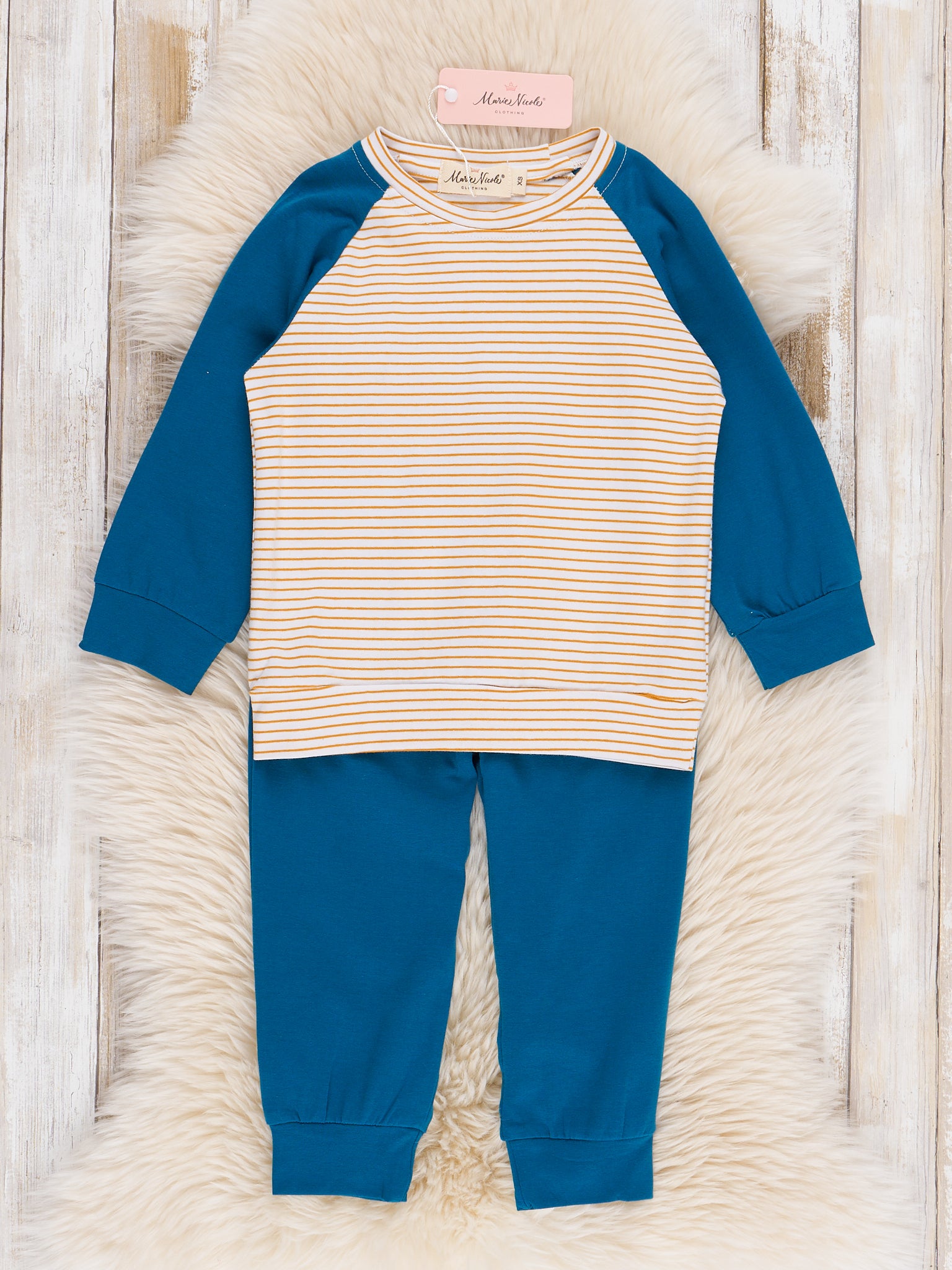 Get your littles ready to rock with our Out of the Blue Joggers Outfit. The tan top with blue raglan sleeves adds a touch of playful charm, while the blue joggers provide a comfortable and stylish look. This sibling set is perfect for any cold weather occasion.