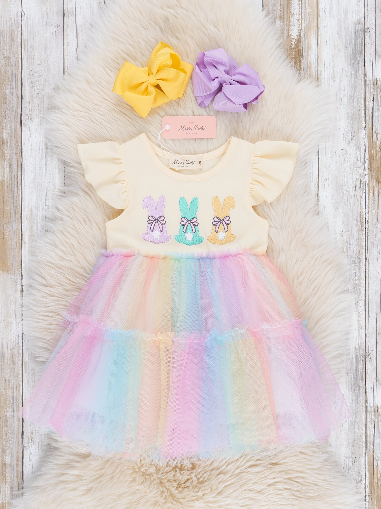 Get ready for Easter with our Pastel Bunnies Tiered Tulle Dress from Marie Nicole Clothing! This adorable girls dress boasts embroidered bunnies and flutter sleeves for a cute and playful touch. The pastel rainbow tiered tulle skirt adds a splash of color and whimsy. Pair with our matching sister set for a perfect Easter look!