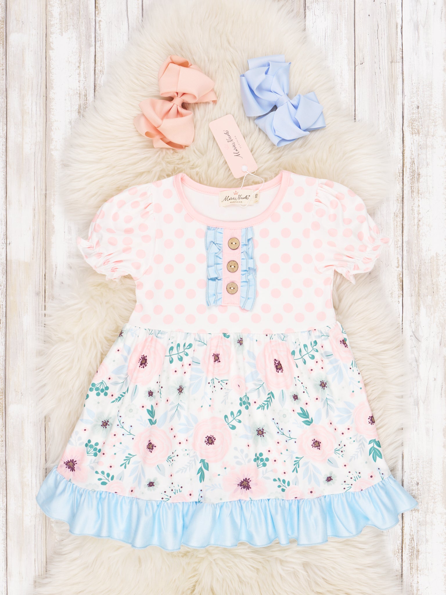 Put a little extra pep in your little one's step with this adorable Pastel Polka Dot Floral Ruffle Dress! Perfect for a birthday party, a day at the park, or any special occasion, this sweet ensemble will surely make any kiddo feel fancy-schmancy and twirl-worthy! The beautiful pastel polka dots, florals, and ruffles will certainly make them the most stylish ones at the party.