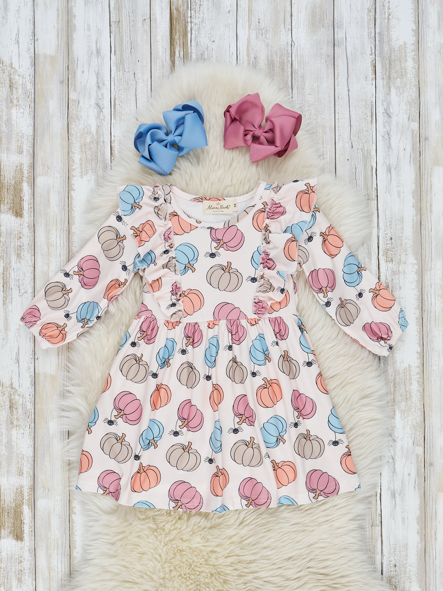 An adorable everyday dress to wear this autumn featuring a pastel pumpkin and spider print, ruffles down the front, cinched waist, and long sleeves.