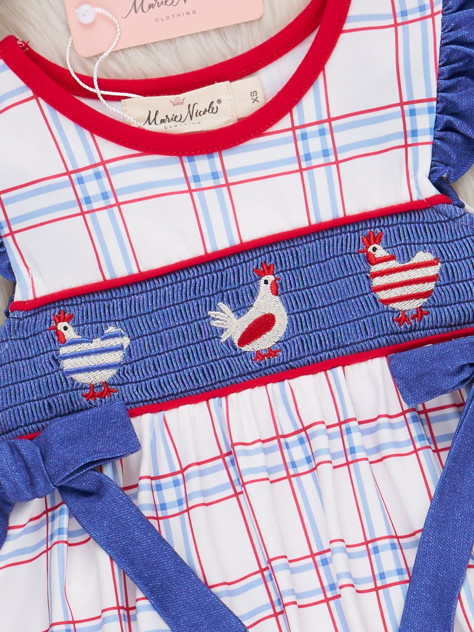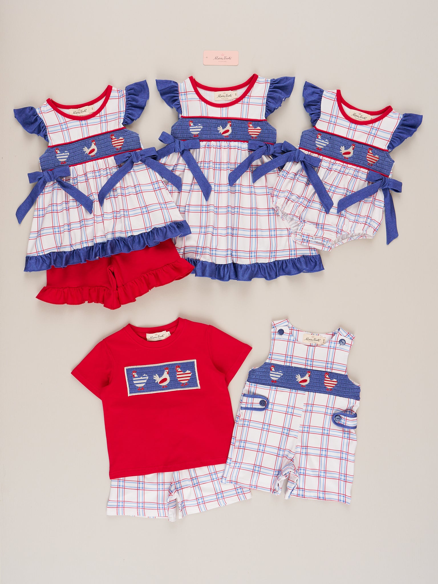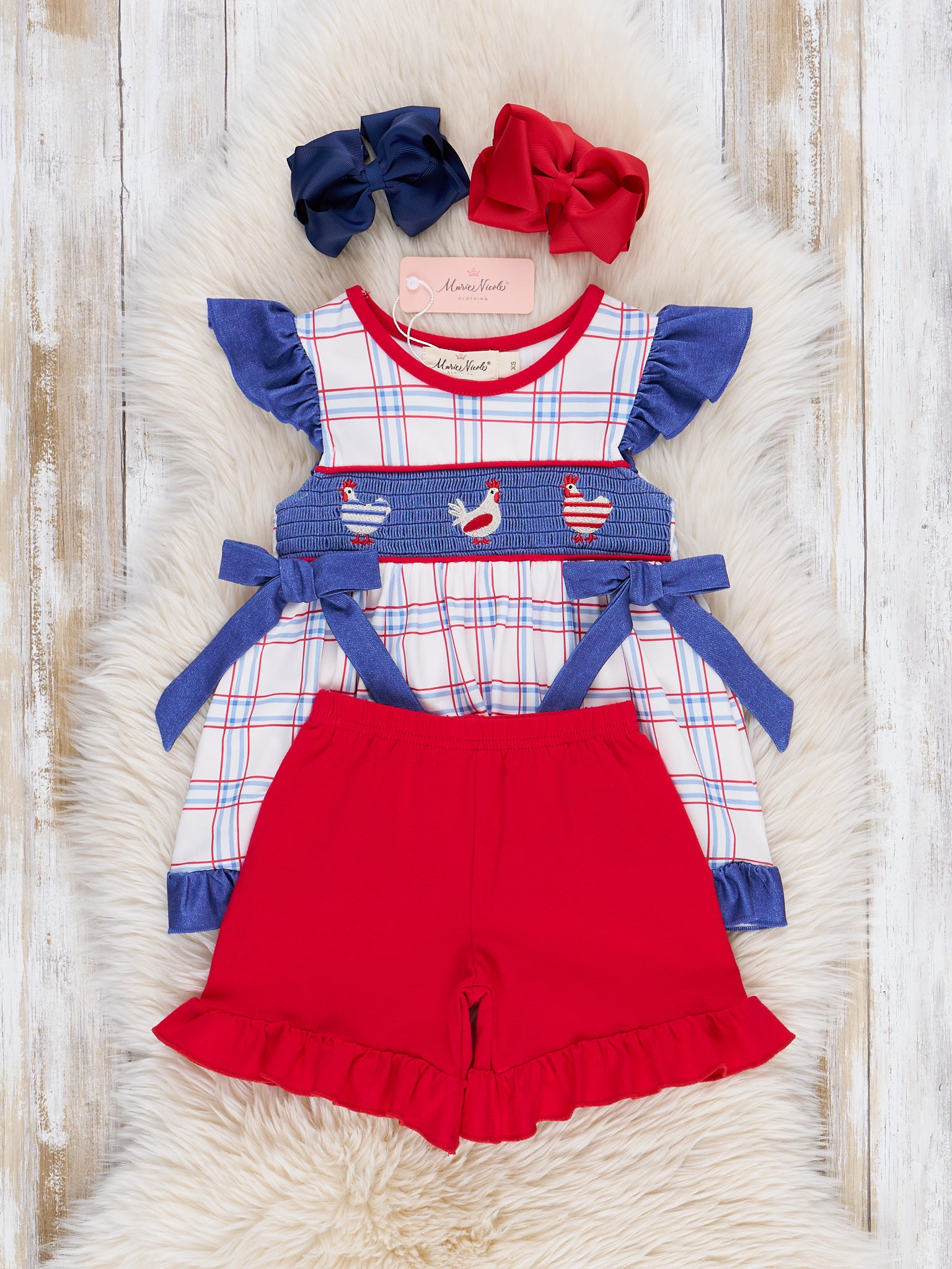 Get ready for some clucking cute style with our Patriotic Chickens Smocked Ruffle Outfit! Featuring a playful mix of patriotic plaid and embroidered chickens over smocked chambray paired with bright red ruffle hem shorts, this outfit is perfect for your little one's next celebration. Complete the look with the matching sibling set and watch your little chick strut their stuff! By Marie Nicole Clothing.