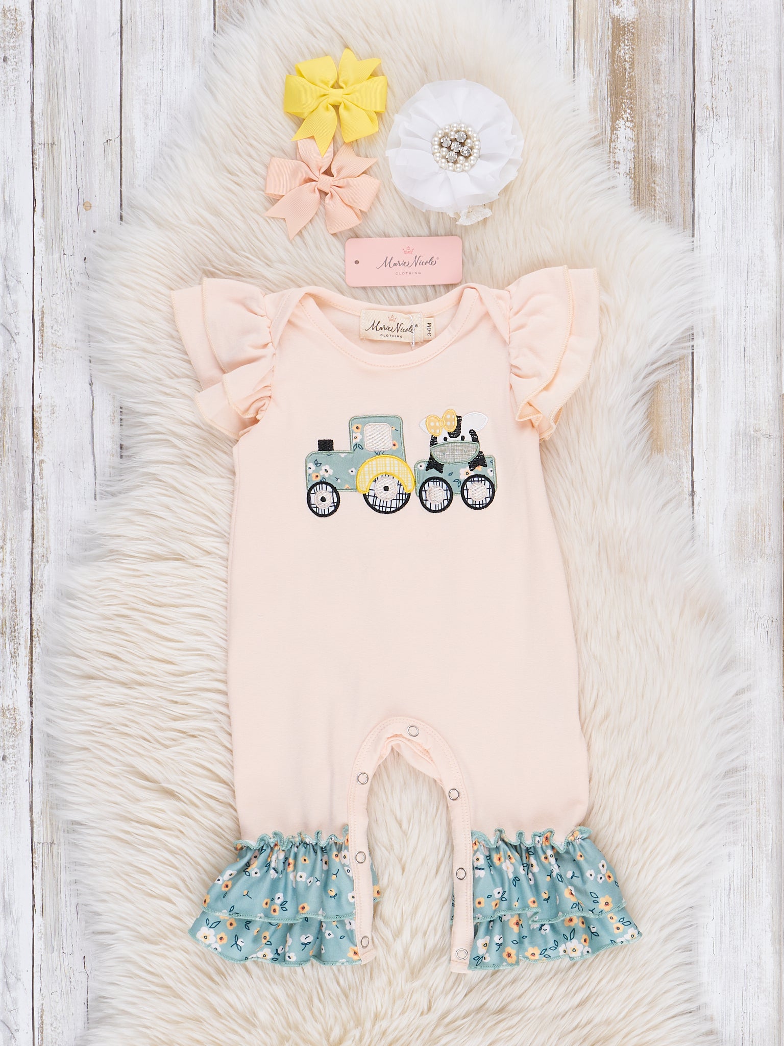 All aboard for adorable style with this sibling set! This romper by Marie Nicole Clothing features a charming embroidered train with a cow and playful ruffle ankles & sleeves, making it the perfect pick for your little conductor. Add a touch of whimsy to their wardrobe with this cute and comfy ruffle romper. Choo-choo-choose this romper for your little one today!