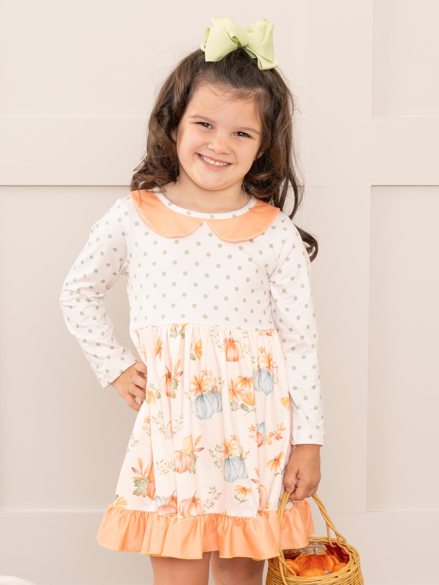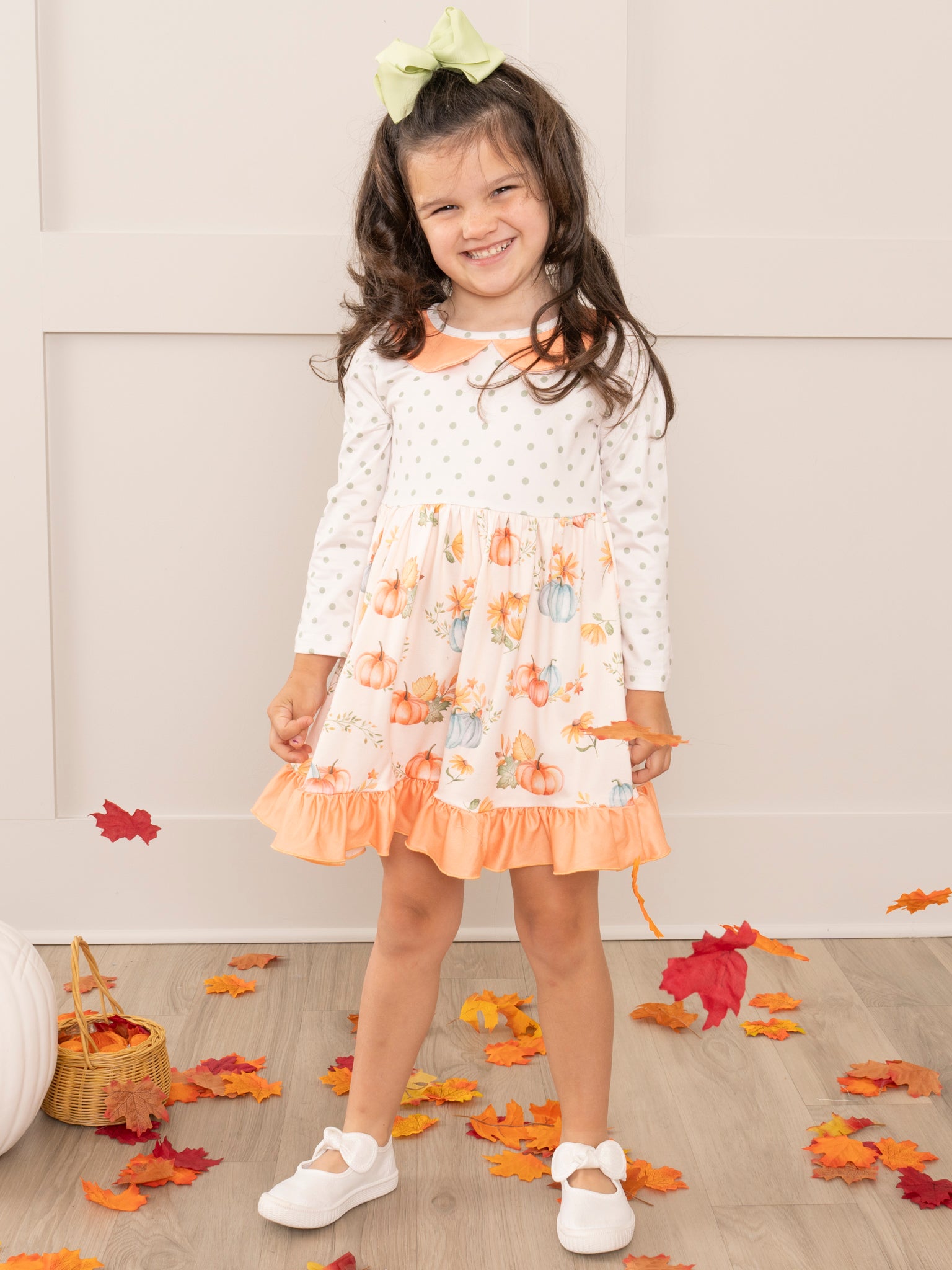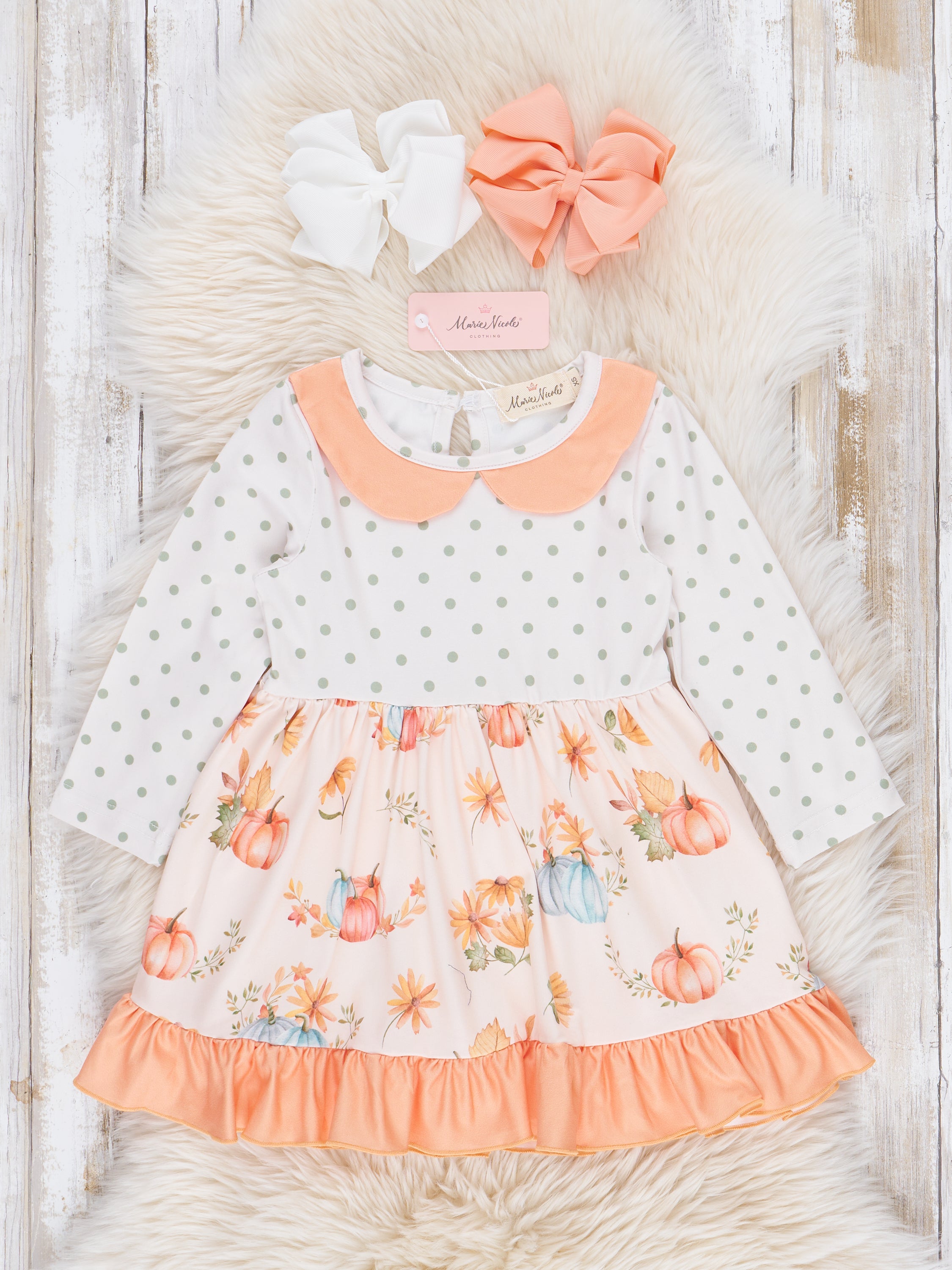 Twirl into fall with our Peach & Green Dots Floral Pumpkins Ruffle Dress! This dress features a playful polka dot bodice and charming peach collar and ruffle hem detail. The floral skirt adds a touch of whimsy. A fun sister set for the autumn season!