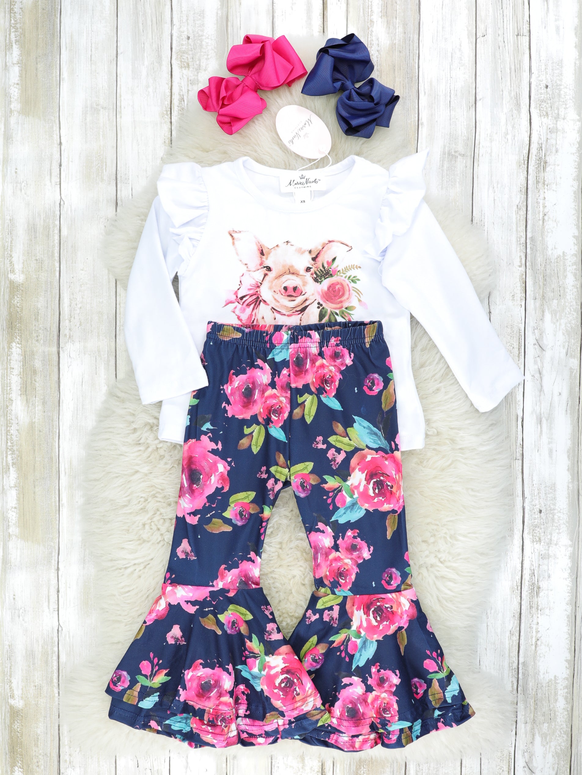 This adorable outfit is pig-ture perfect! This outfit features a white top with a cupcake pig, flutter trim, & floral bell bottoms.