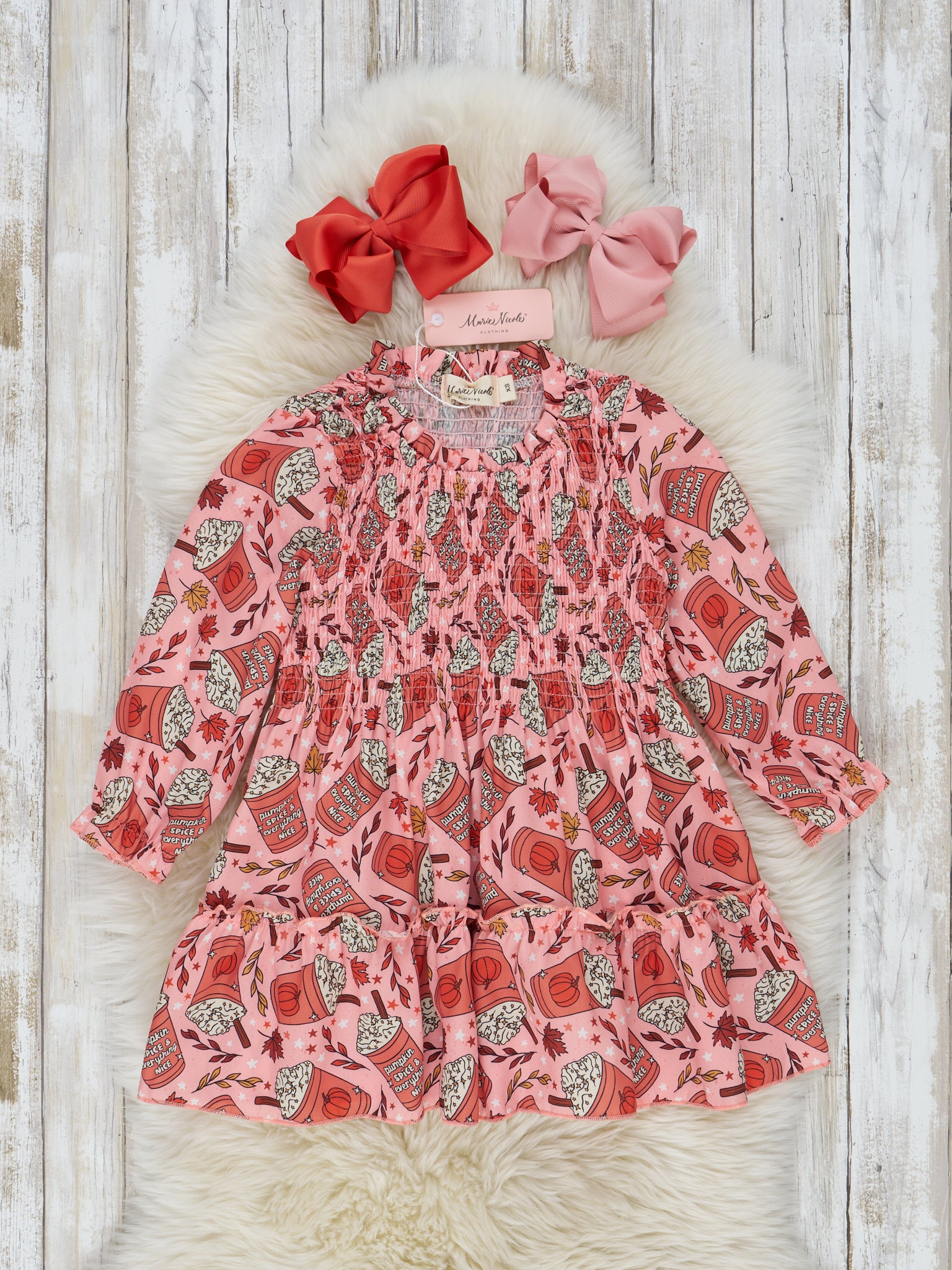 Swing into fall with this gorgeous smocked ruffle dress featuring tiered ruffle skirt and cinched sleeves all over a fall pumpkin drinks background.