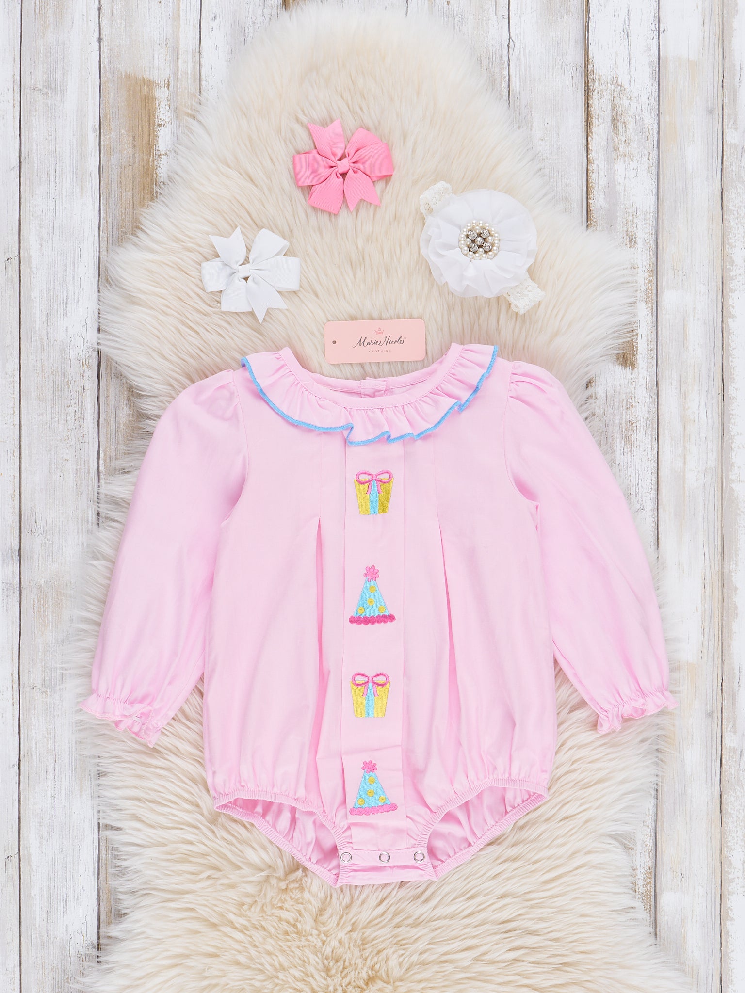 Get the party started with our Pink Cotton Birthday Party Bubble ! Made with 100% cotton, this girls bubble features an embroidered birthday party motif and a cute ruffle trim collar. With a button back closure for easy dressing and a sister set option, this bubble is perfect for any birthday celebration. Let your little one stand out in style and comfort!