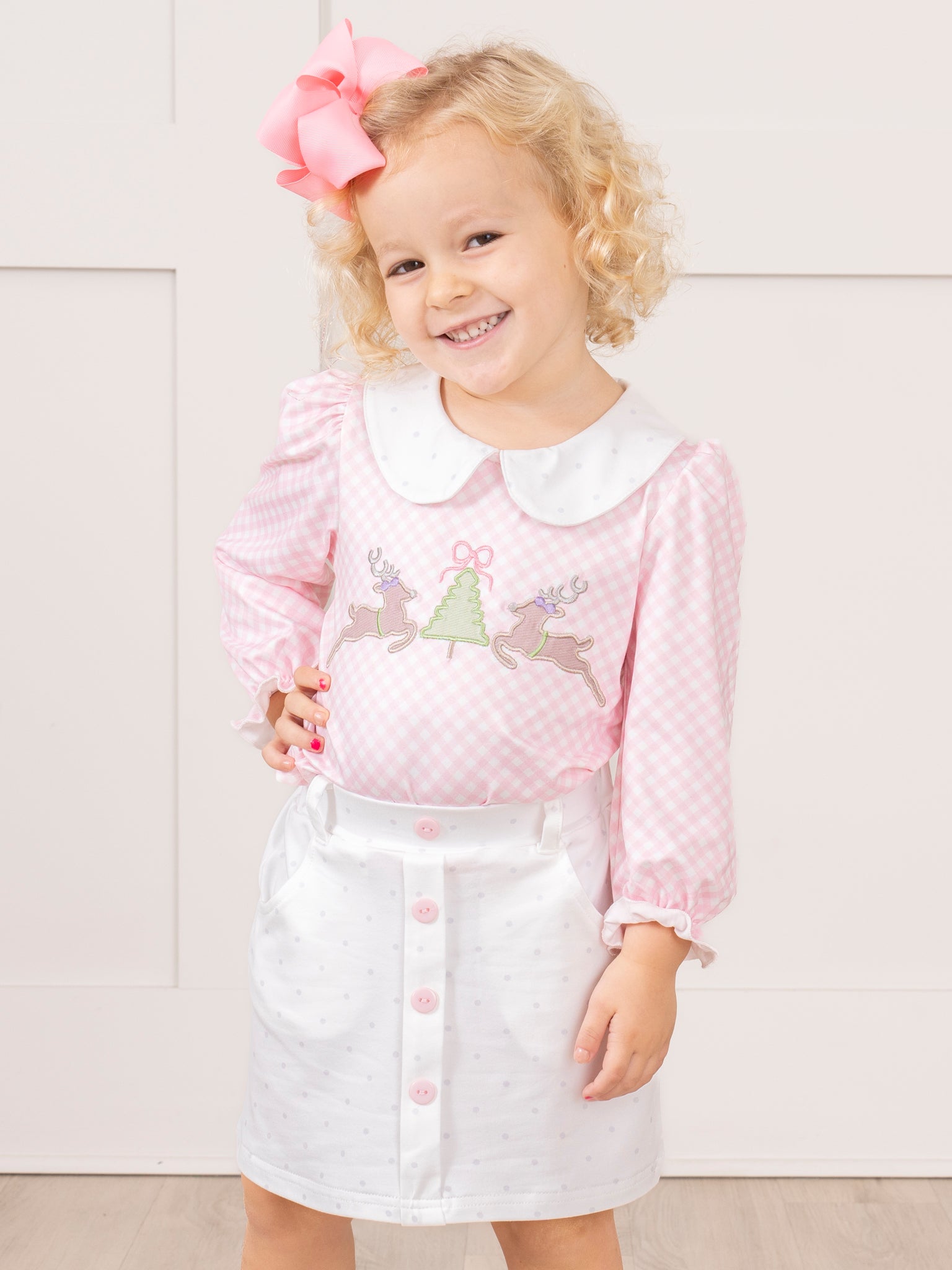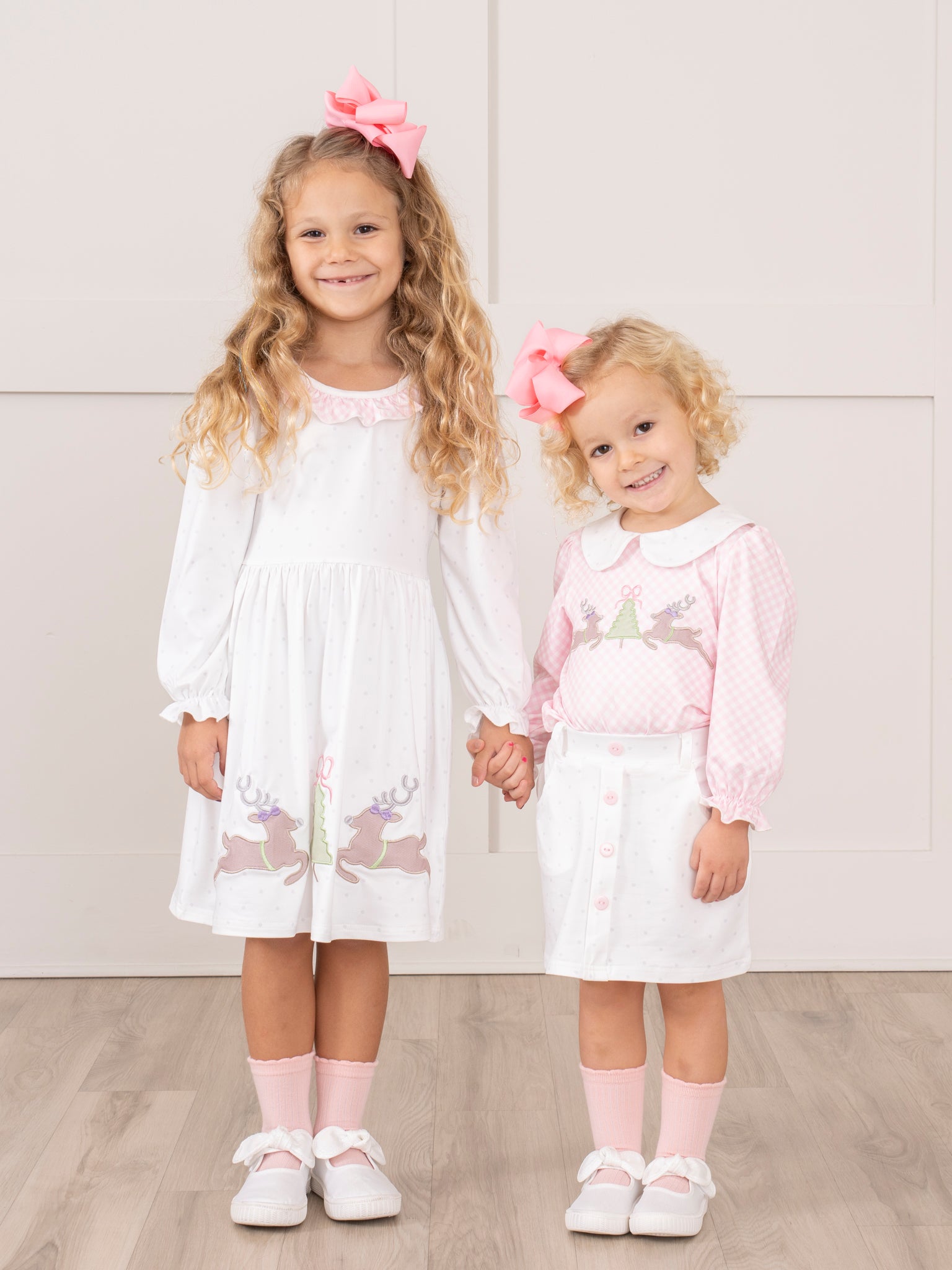 Make your little one the star of the holiday season with our Pink Reindeer Prancing Reindeer Outfit w/ Skirt! This adorable girls outfit features a top with an embroidered prancing reindeer design and a playful pink ruffle trim collar and is paired with a polka dot button front skirt. Part of a sweet holiday Christmas sister set, this outfit is sure to bring smiles and festive fun.