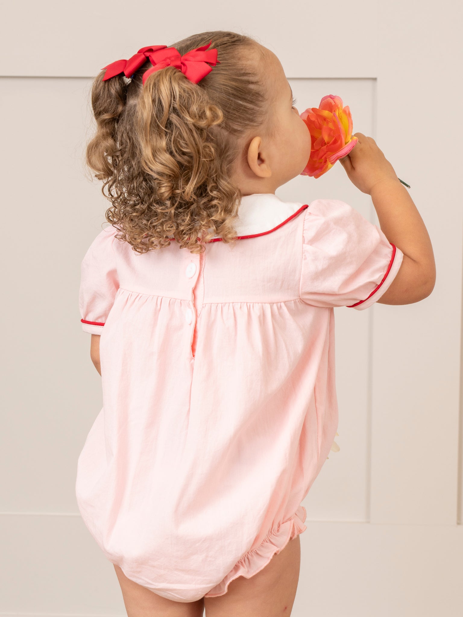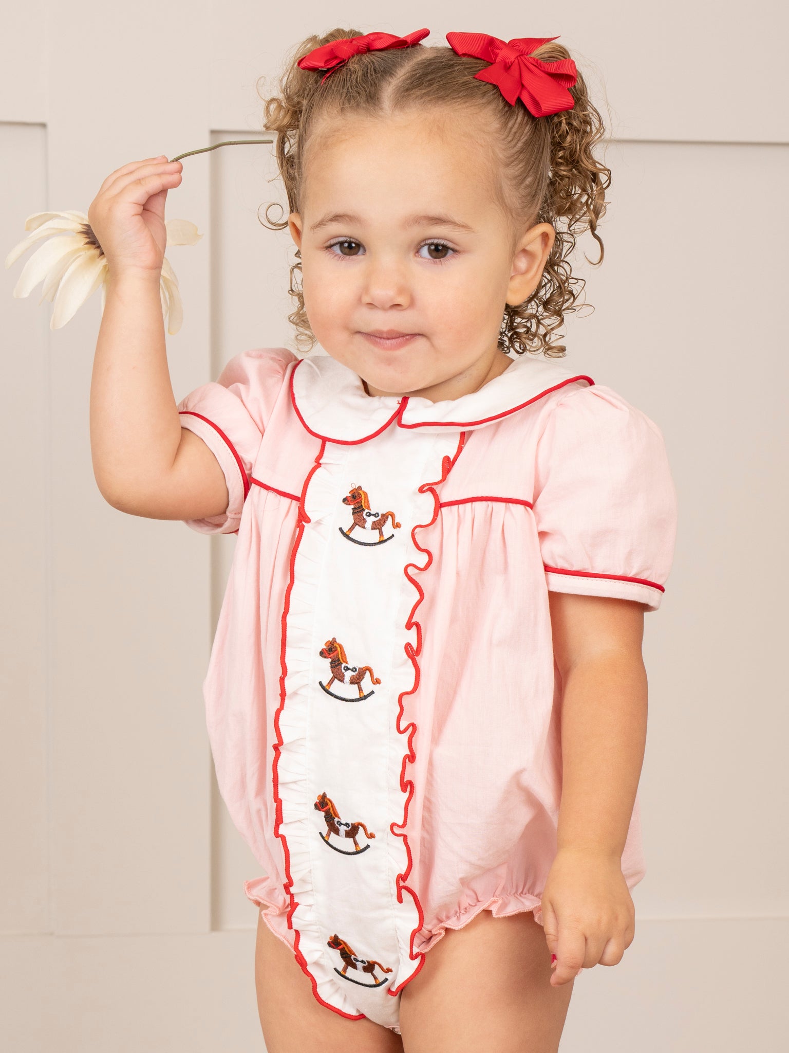 Rock your little ones' style with this sister set! Featuring an embroidered rocking horse design, peter pan collar, and red trim with ruffle detailing, this bubble is both playful and chic. Your child will surely stand out in this unique and adorable piece.