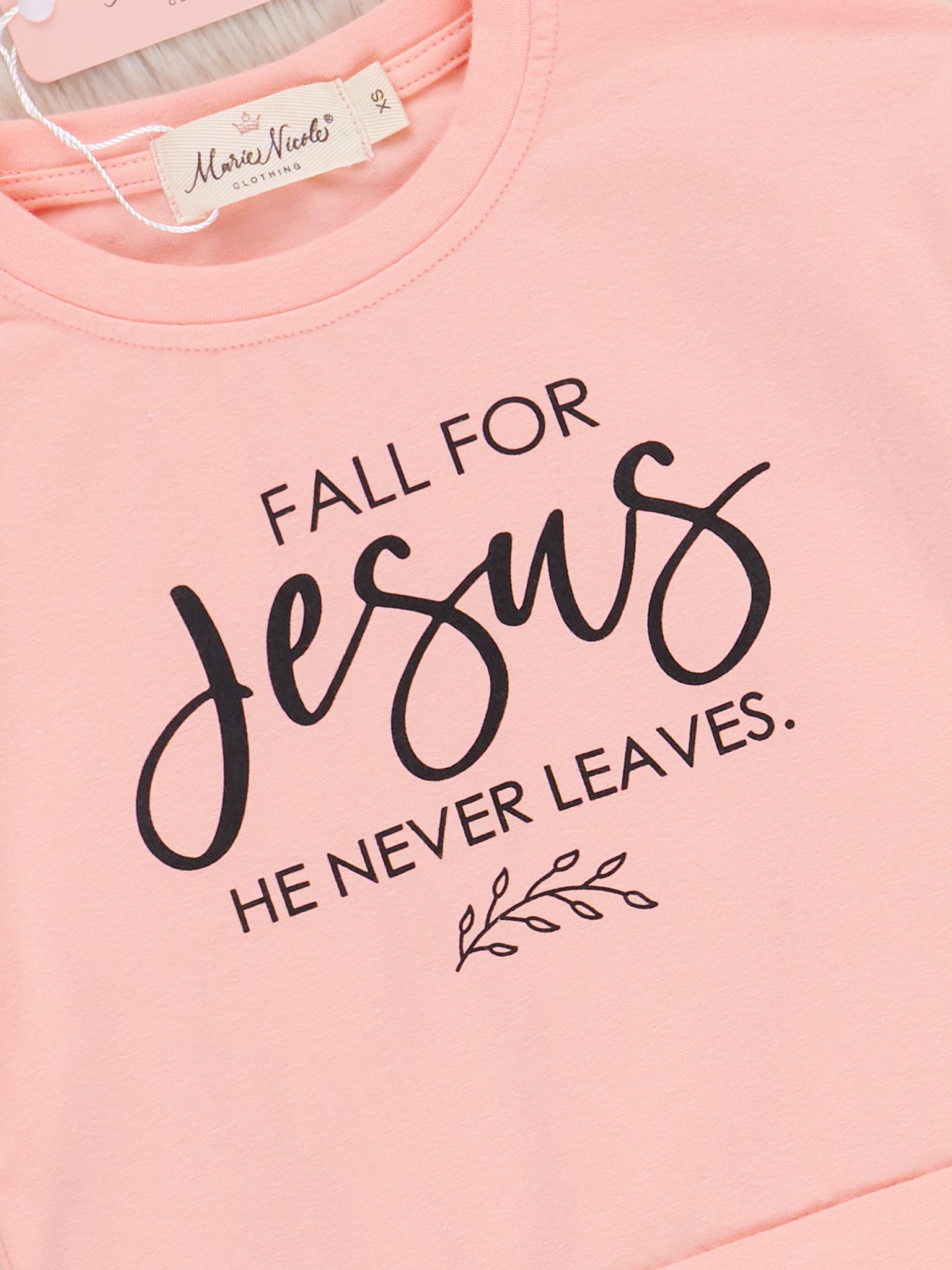 Spread love and faith with our Pink Floral "Jesus Never Leaves" Bell Bottom Outfit for girls. The playful pink ruffle top and leaves pattern bell bottoms add a touch of whimsy to this faith-inspired ensemble. With the reminder that Jesus is always by our side, your little one will radiate positivity and style.