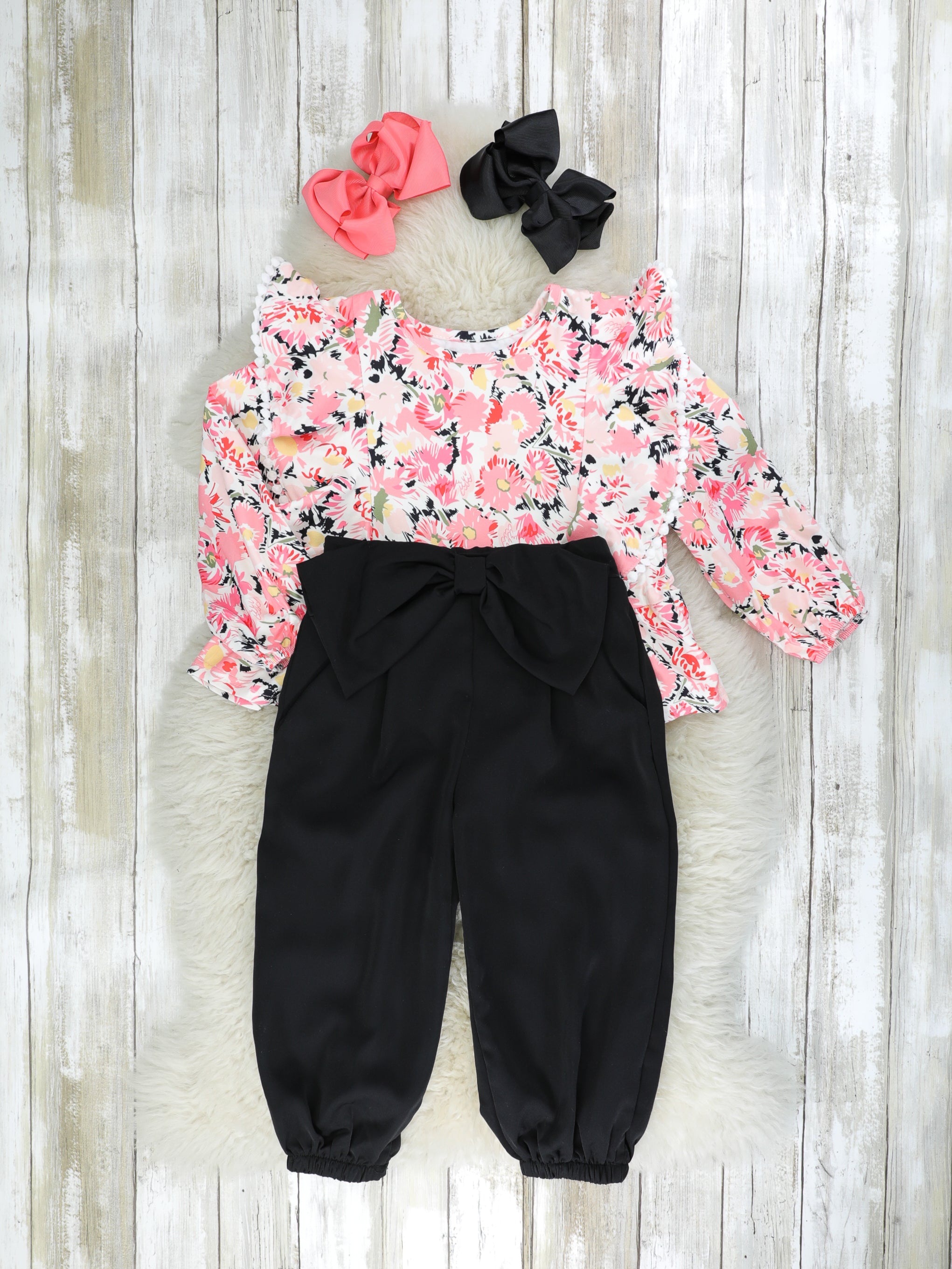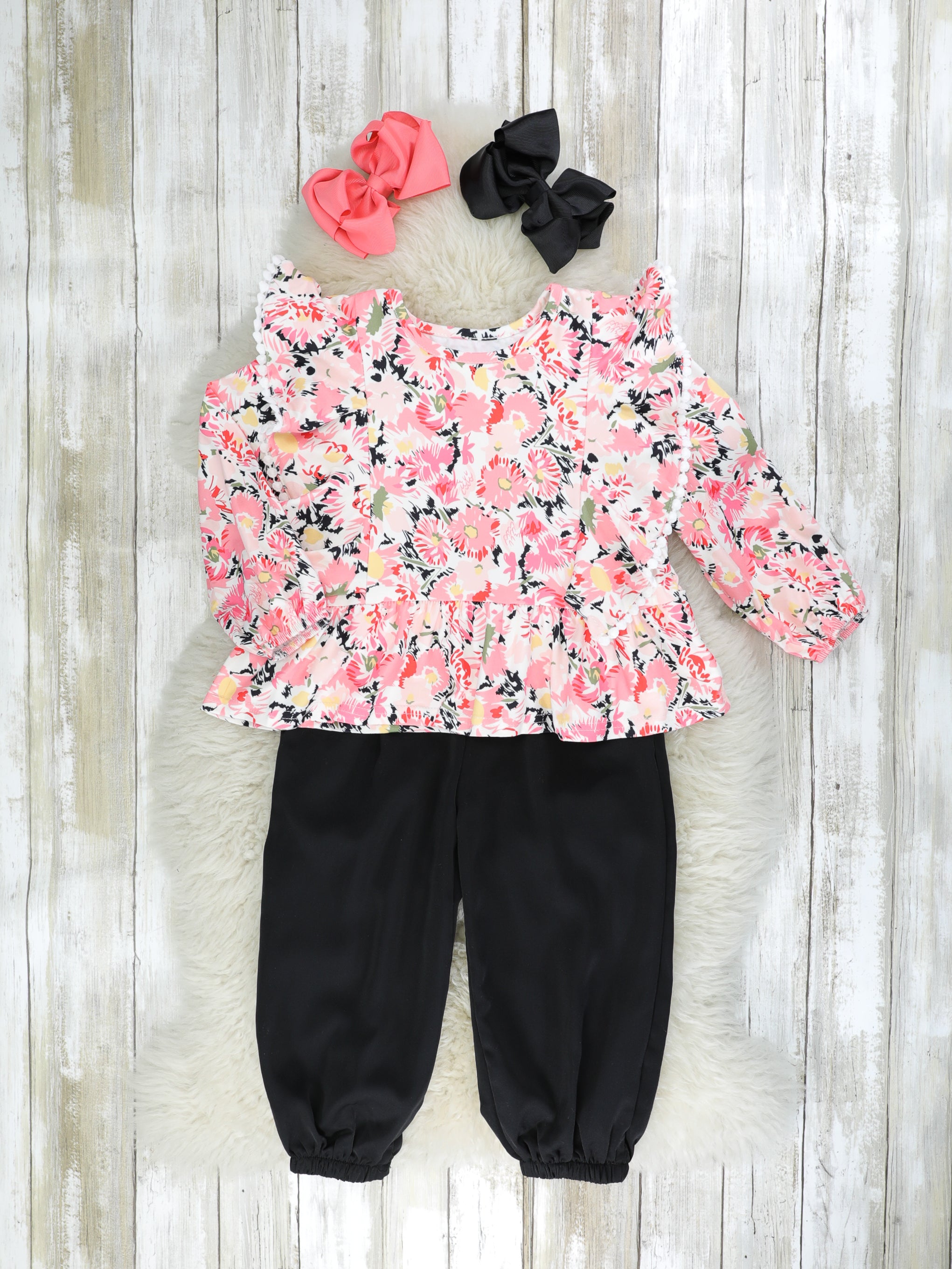 A sweet pink outfit for your little flower child! This outfit features a pink peplum top with flutter trim, pretty florals, & the softest black joggers.