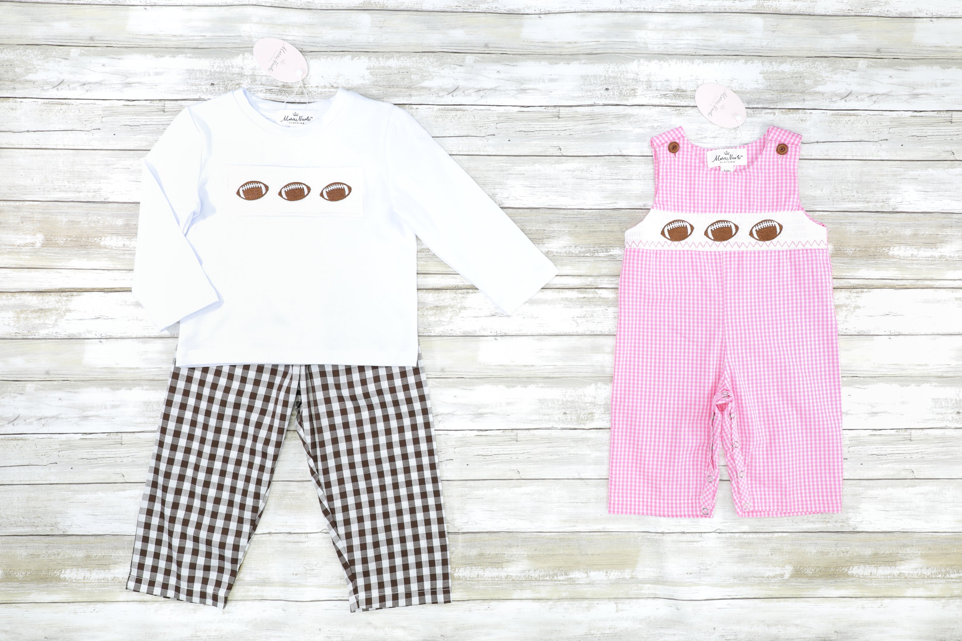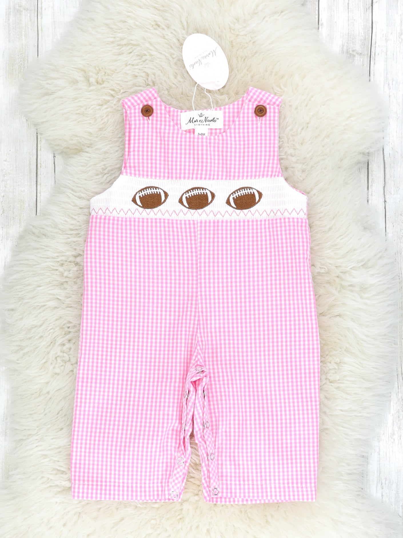 Ready? Set... HIKE! This fabulous football set has something for all the players of your team! This pink gingham johnny features smocking, embroidered footballs, & functional buttons for easy changing.