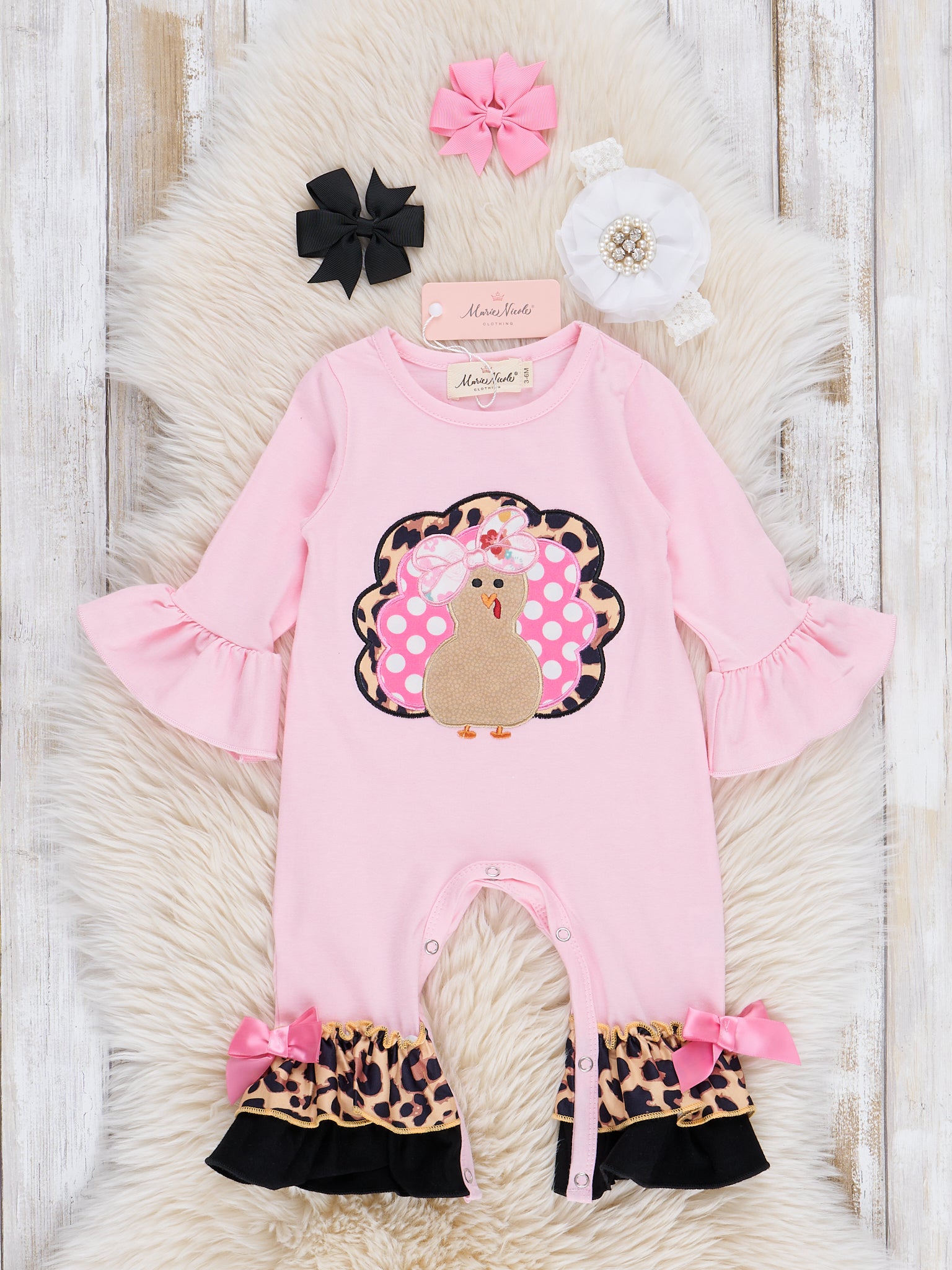 All your girls will feel pretty in pink with this sassy sister set! This pink romper features a turkey appliqué, bell sleeves, leopard ruffle details, & bow details at the ankles.