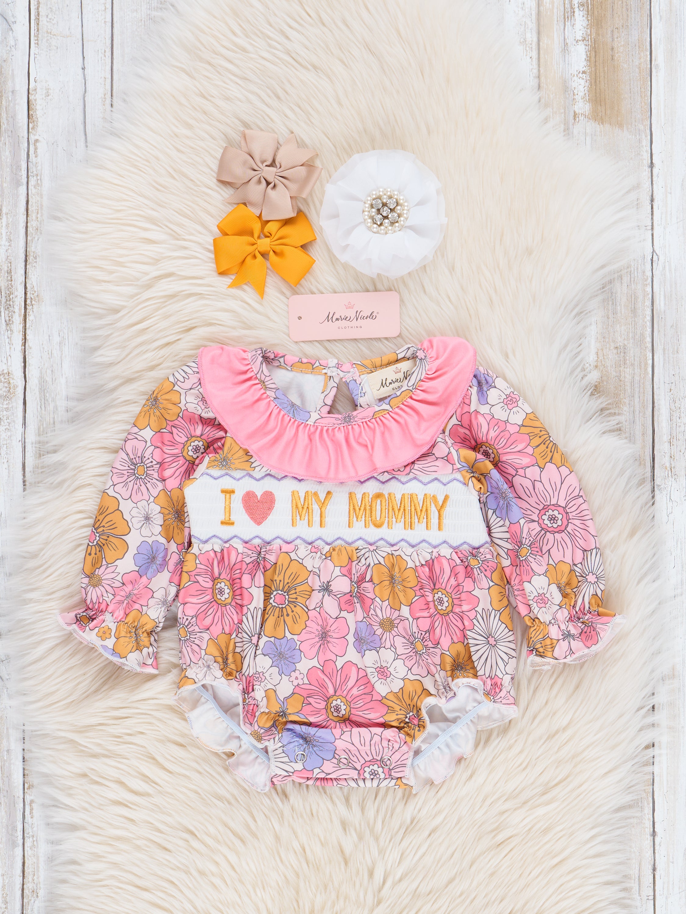 This playful girls bubble features colorful pink and purple marigolds and stylish smocking, perfect for any little one who loves to stand out. With an adorable "I ❤️ My Mommy" design and coordinating sibling set options, this bubble is sure to be a favorite for both kids and parents alike!