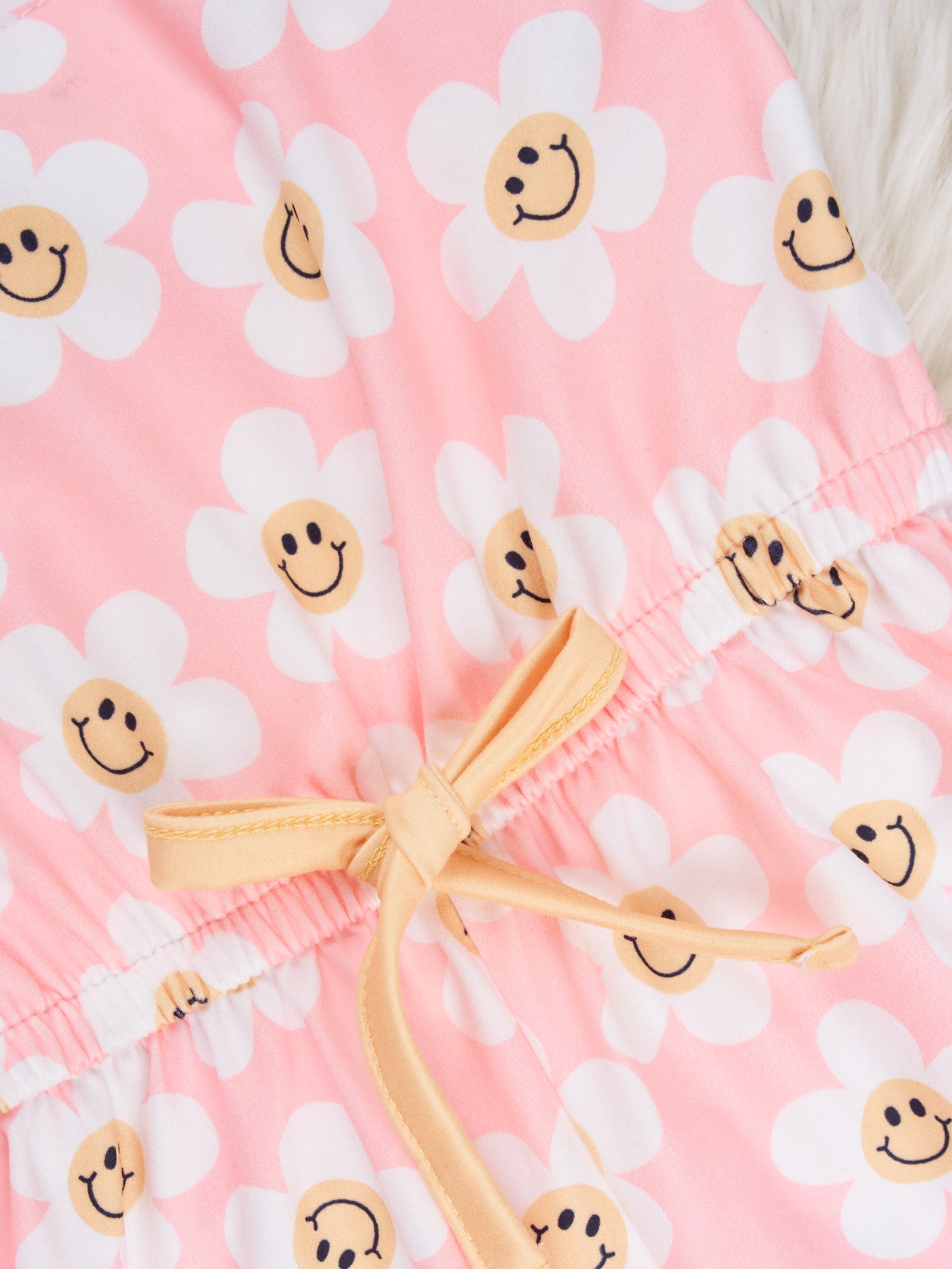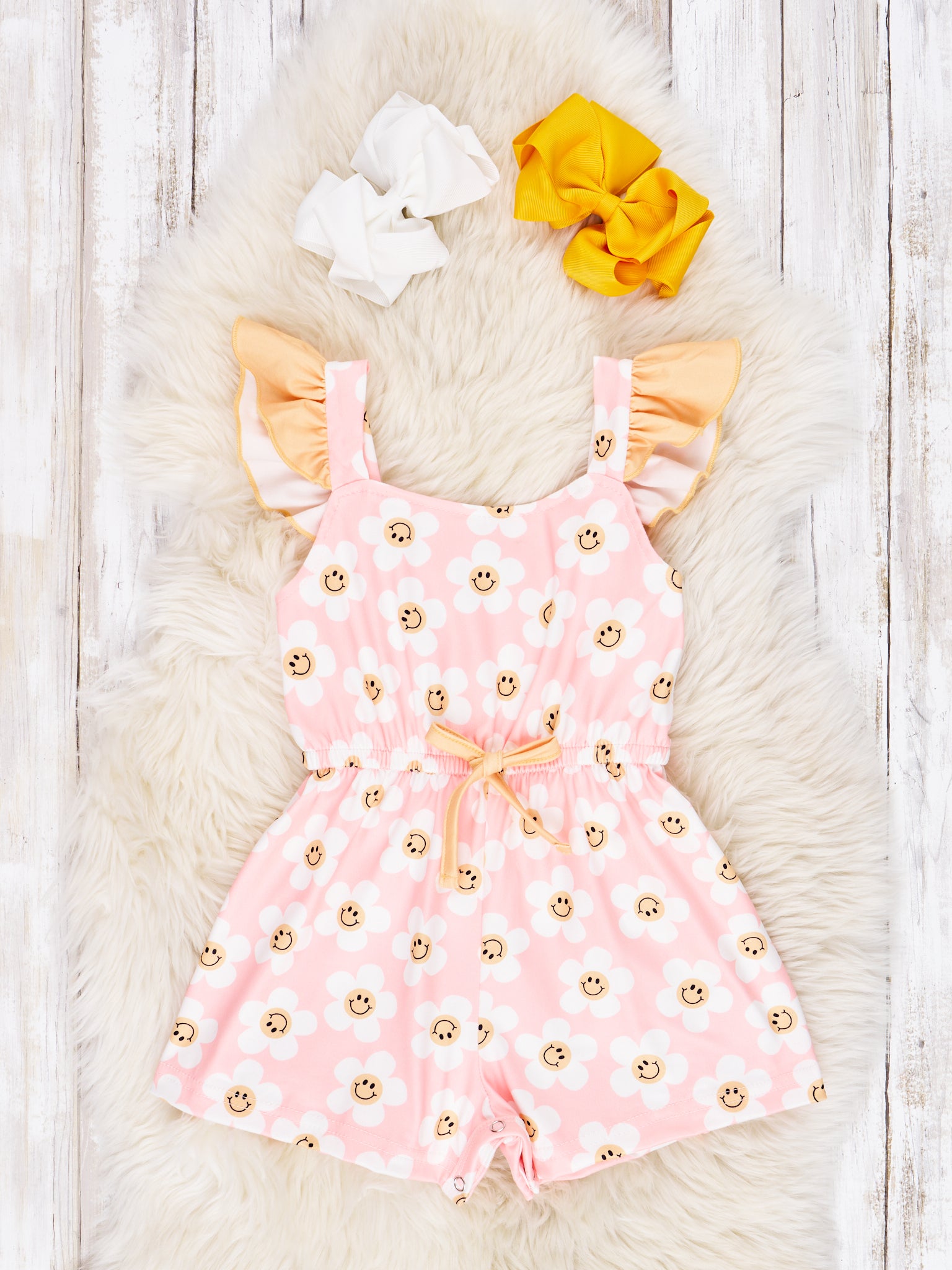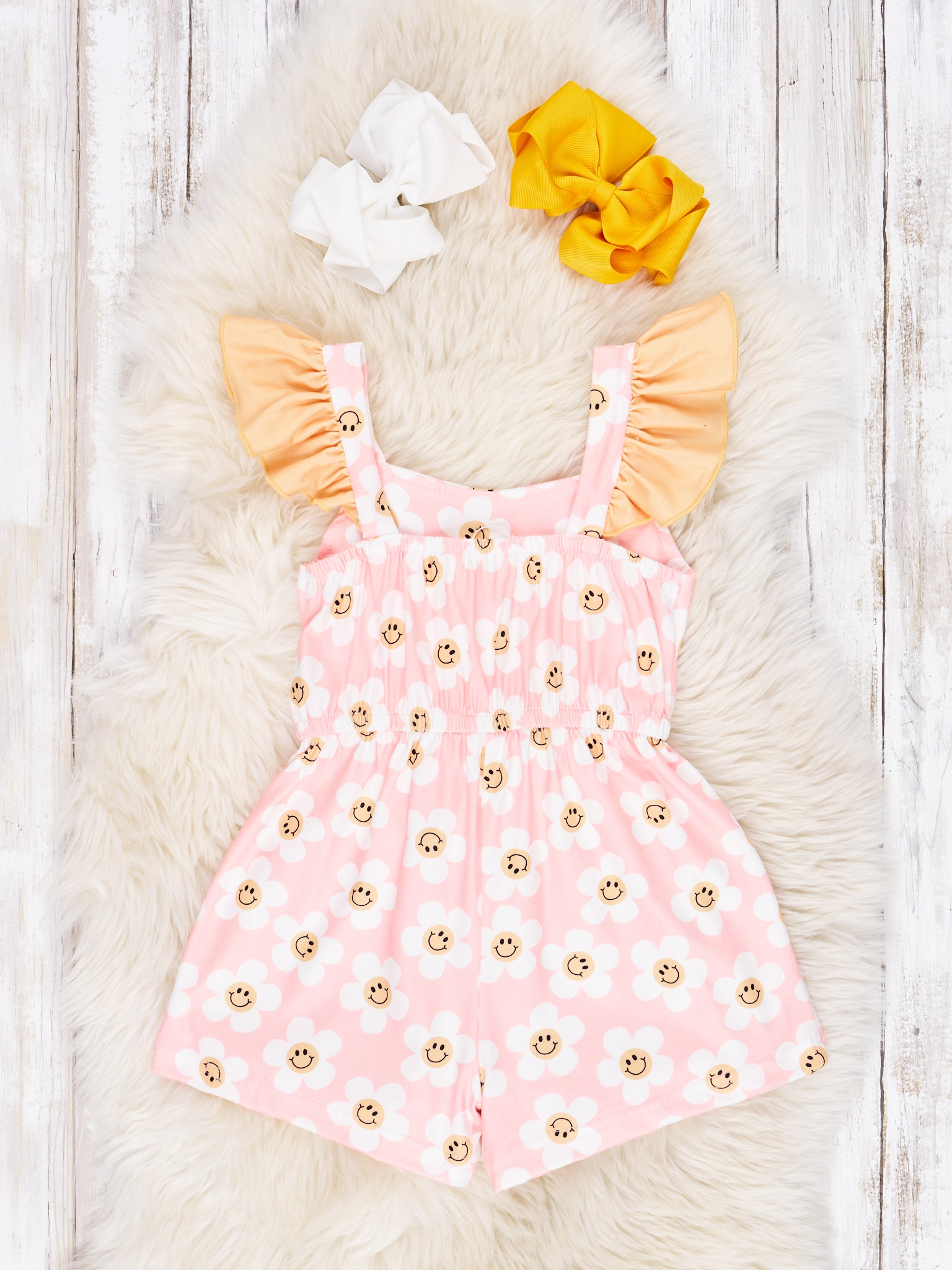 This awesome Pink Smiley Daisy Ruffle Jumpsuit is perfect for all the little fashionistas out there! It's soft and comfy, with an adorable daisy print and frilly ruffles, sure to make any kid smile. Jump into style!
