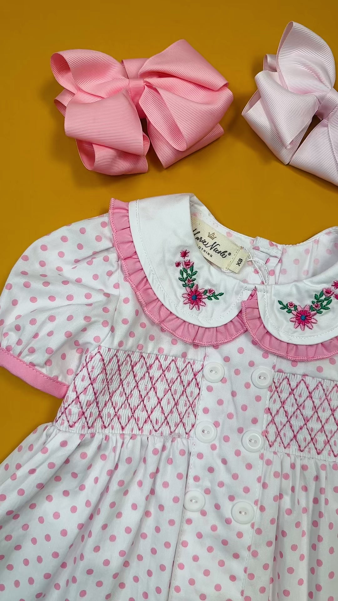 Get ready to bloom in style with our Pink Smocked Blooms Ruffle Bubble! This playful bubble features pink polka dots, a smocked bodice, and a peter pan collar adorned with embroidered flowers and a pink ruffle trim. Perfect for sisters who want to match in style!