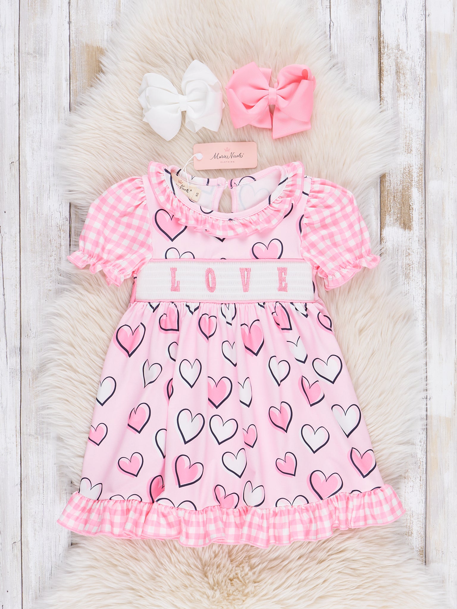 Spread the love this Valentine's Day with our Pink Smocked Love Hearts Ruffle Dress. Featuring a heart print bodice, pink gingham sleeves, and embroidered "LOVE" over smocking, this girls ruffle dress is perfect for a sister set. Get ready to steal hearts with this sweet and playful dress!