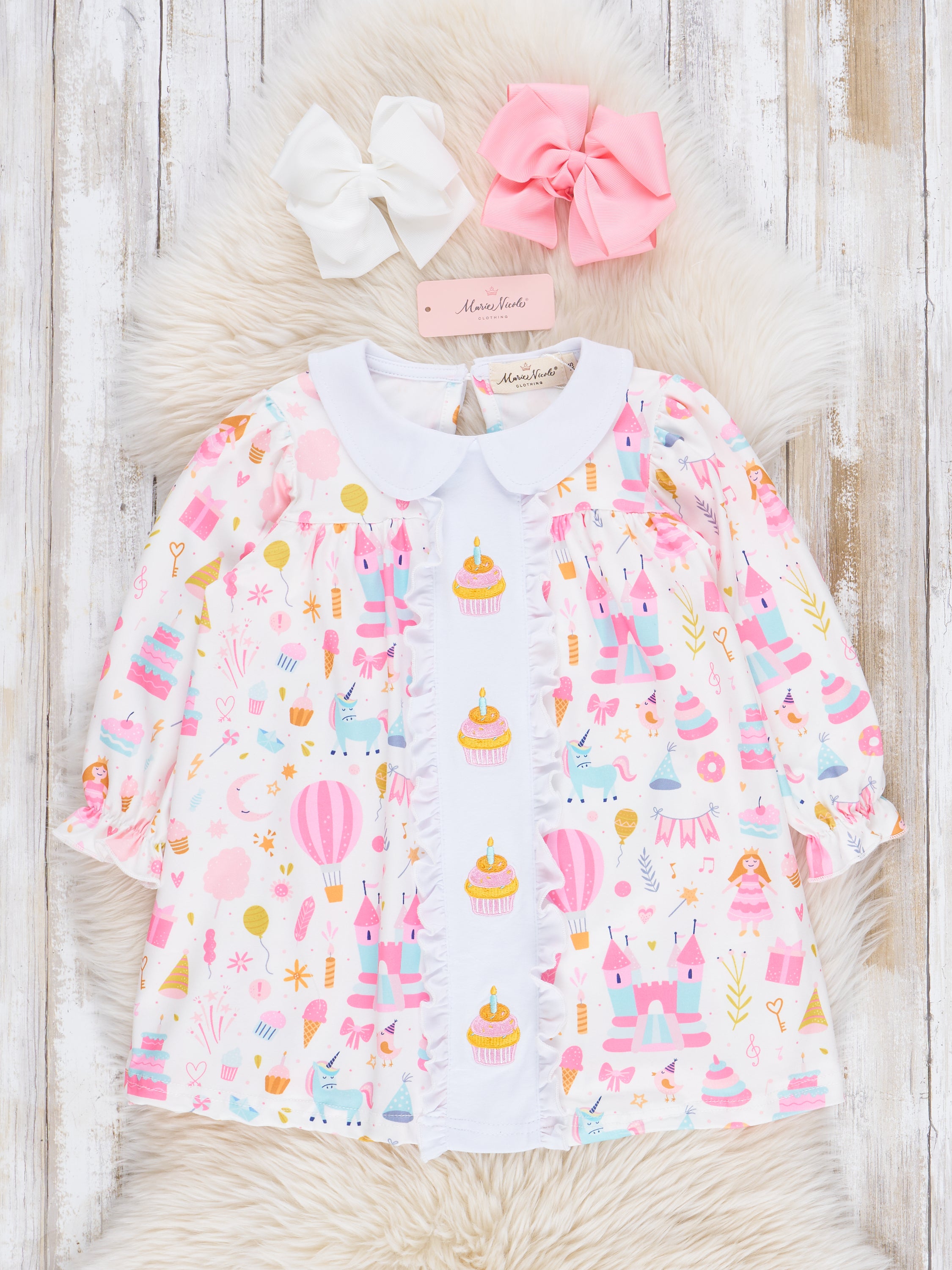 Make her birthday extra sweet with our Pink & White Embroidered Birthday Cake Dress. This playful girls dress features a party print and charming embroidered cake, perfect for celebrations. Complete with a cute peter pan collar and matching sister set. Don't miss out on the fun! 🎂