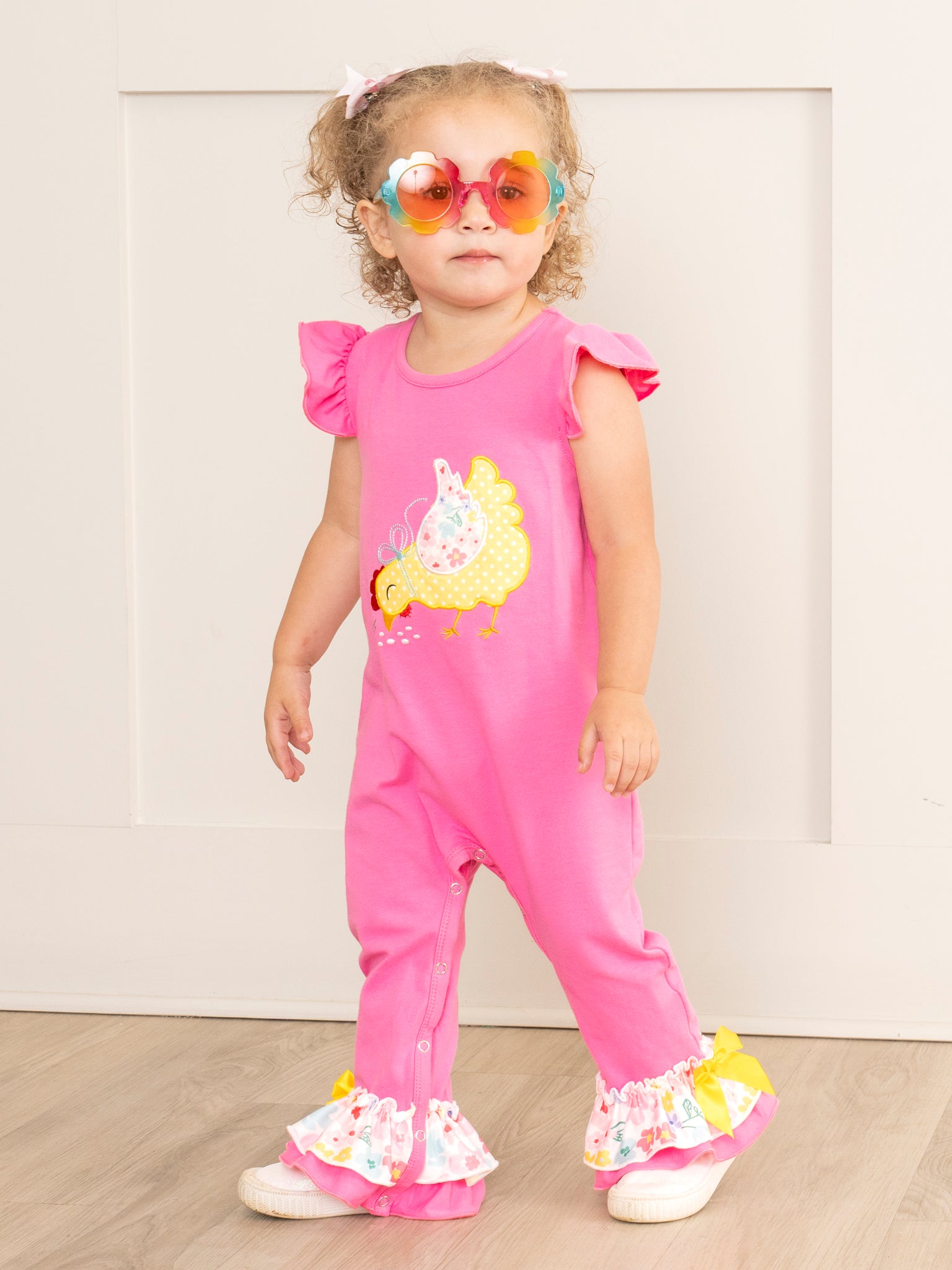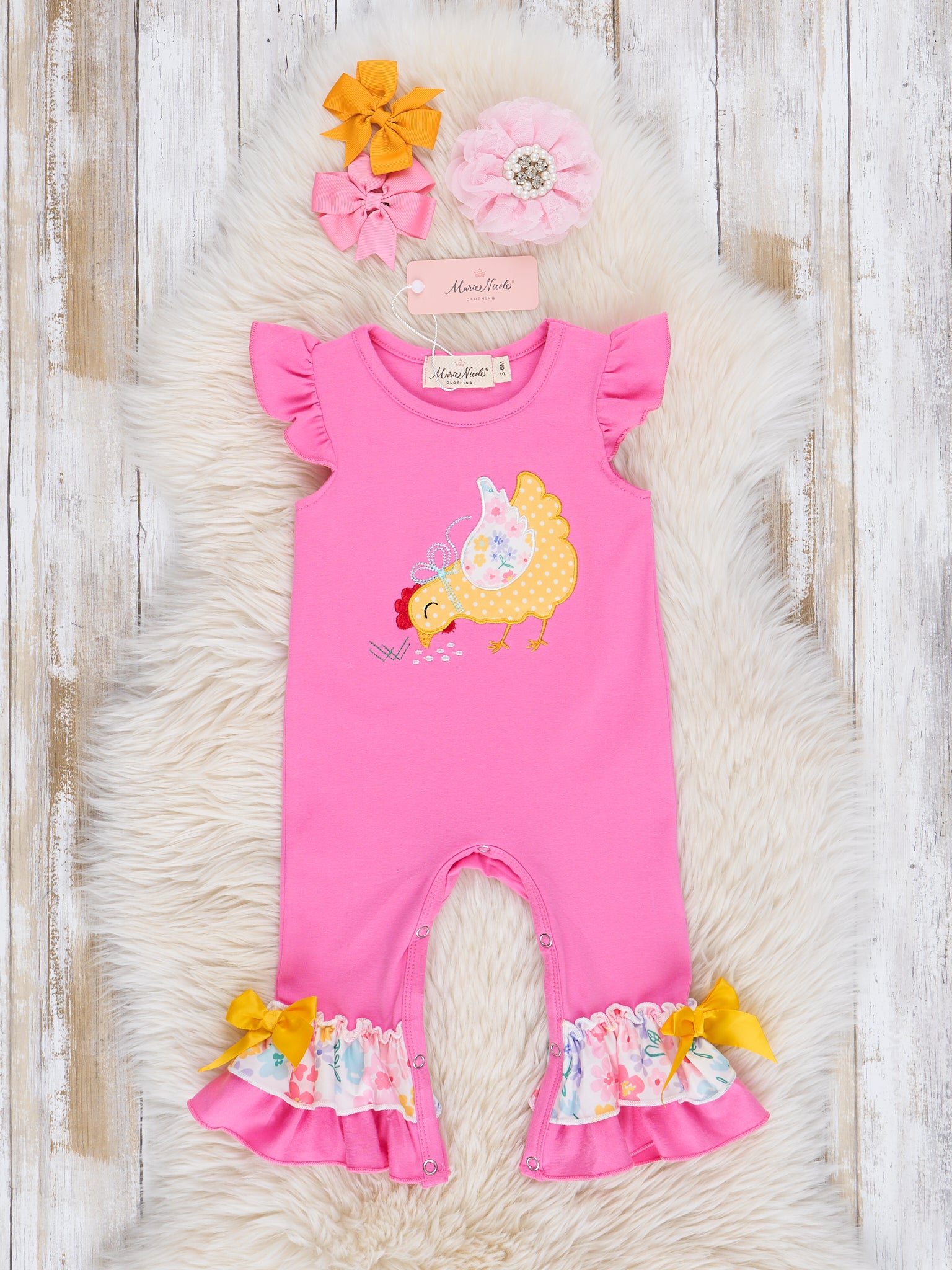 Dress up your little one in this "peck"-fect romper featuring an embroidered hen design in playful pink and yellow. With its matching sister set and adorable ruffles, this romper is sure to make your baby stand out in style and cuteness!