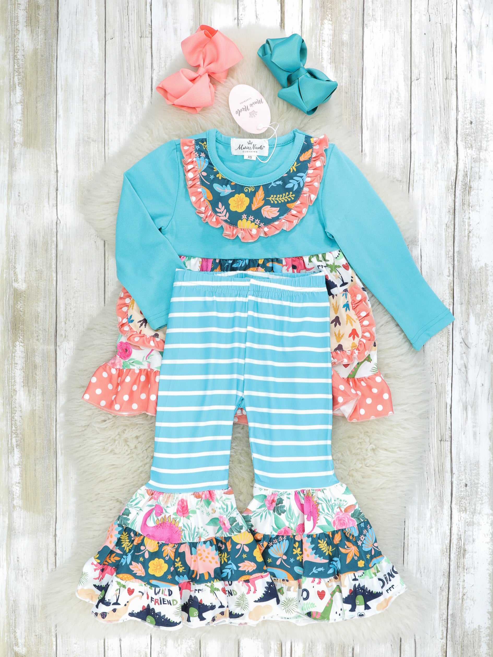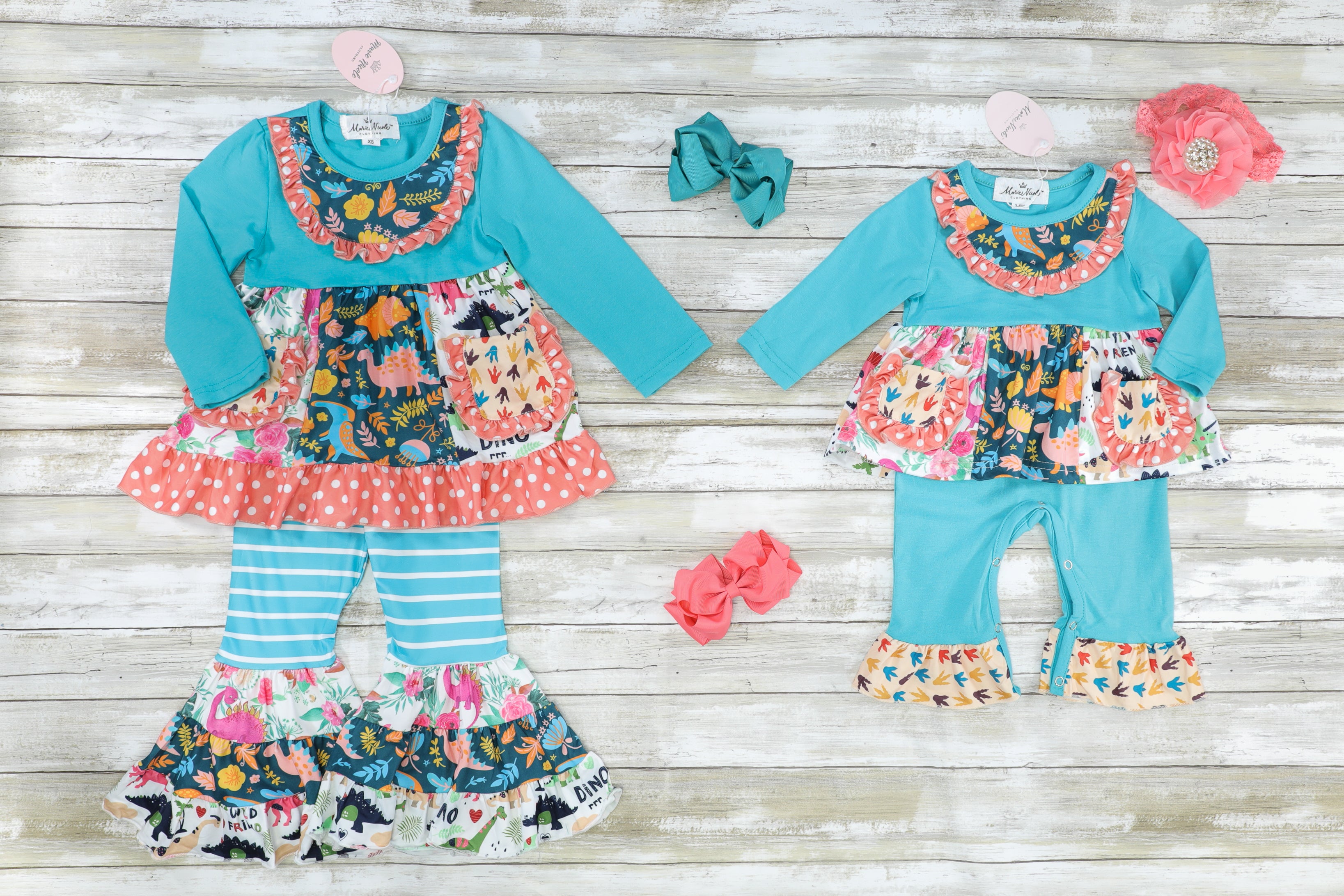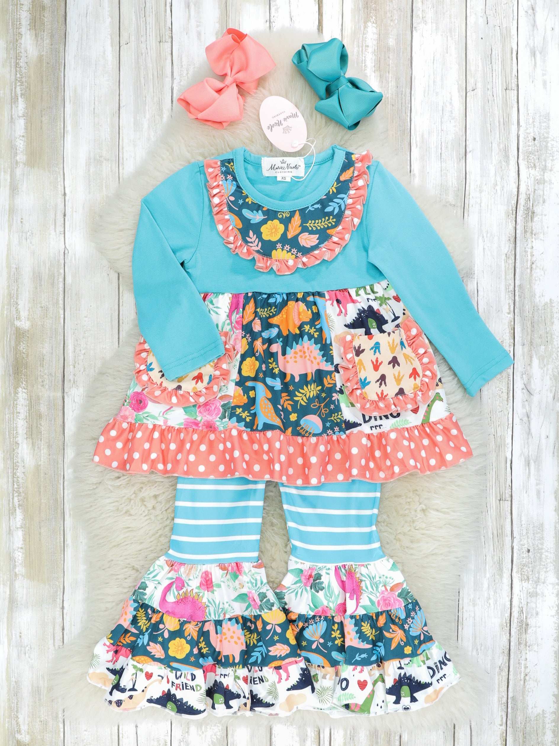 The sweetest sister set for your rawr-some gals! This outfit features a blue tunic with gorgeous florals, the cutest dinosaurs, polka dots, ruffles, pockets, & adorable striped bell bottoms.