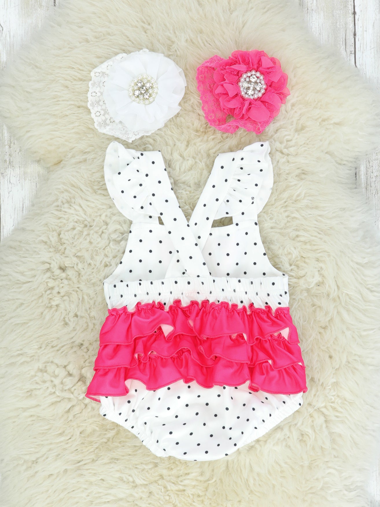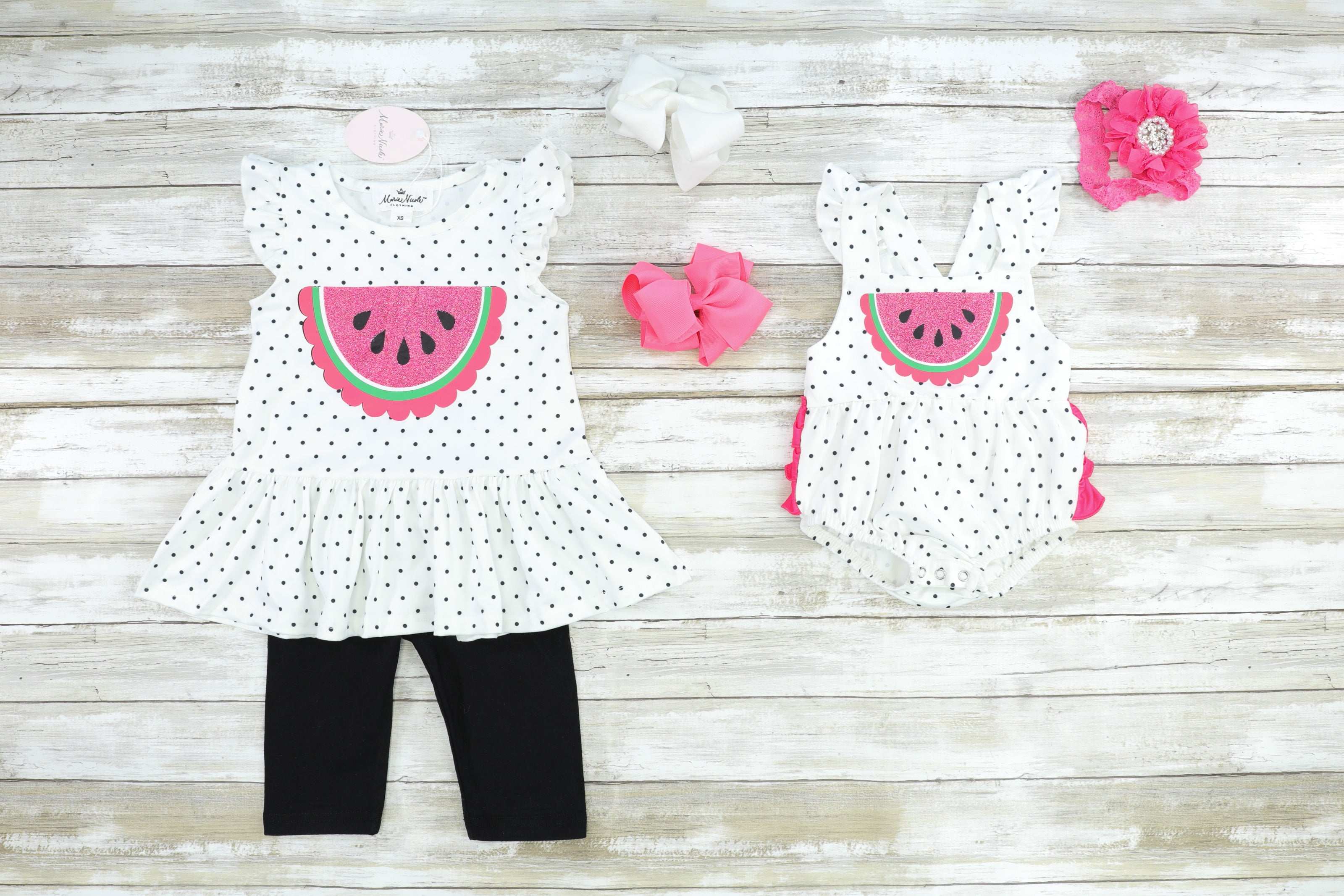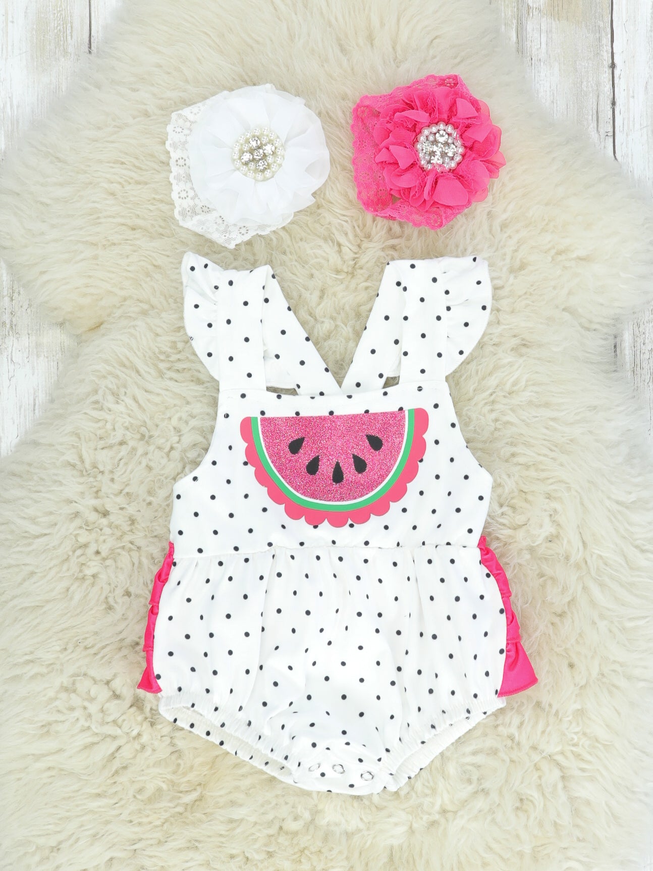 The sweetest watermelon sister set! This white bubble features black polka dots, flutter sleeves, a pink glittery watermelon detail, pretty pink ruffles lining the back, a criss cross back detail, and snap buttons making for easy diaper changes.