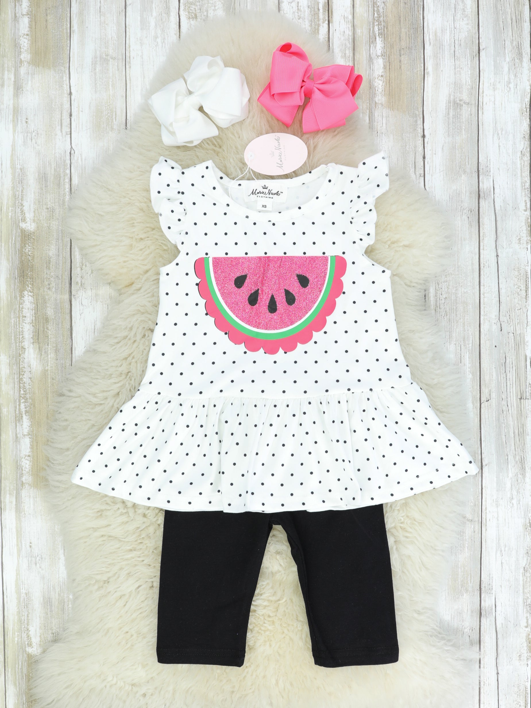 The sweetest watermelon sister set! This white peplum top features black polka dots, flutter sleeves, and a pink glittery watermelon detail. The comfy black bottoms are capri length.