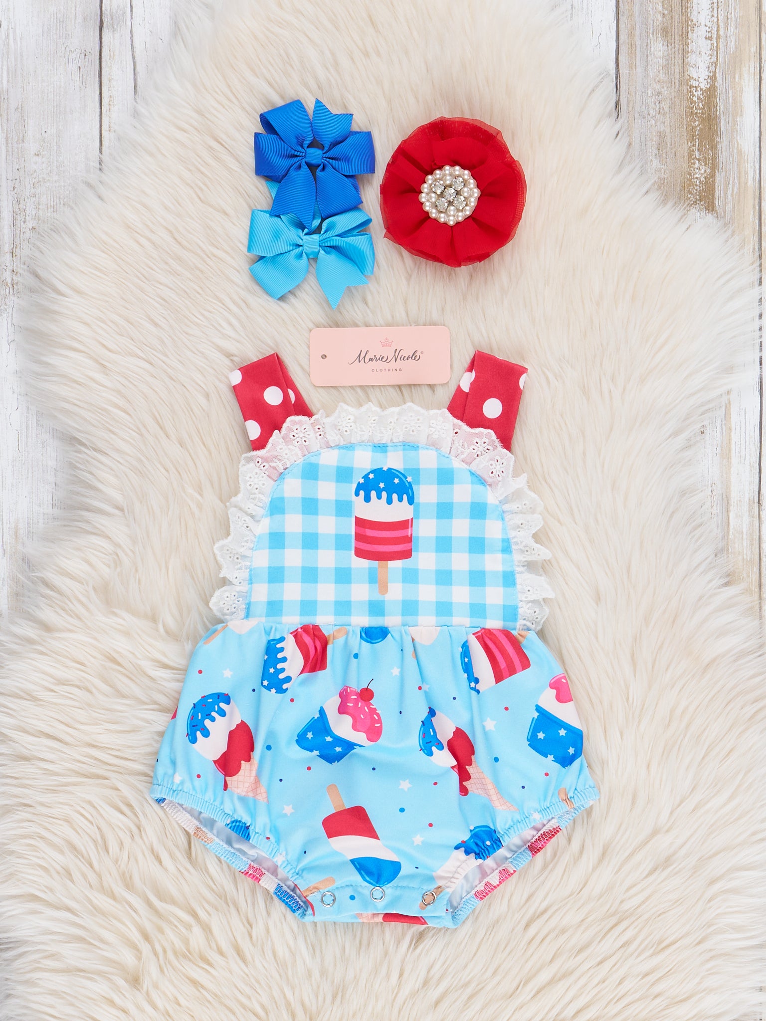 Call up your national pride with this fun and flavorful sibling set! This bubble by Marie Nicole Clothing features classic blue gingham fabric, stylishly patriotic popsicle print, and an oh-so-chic ruffle detail. Perfect for photos, parades, and playdates!