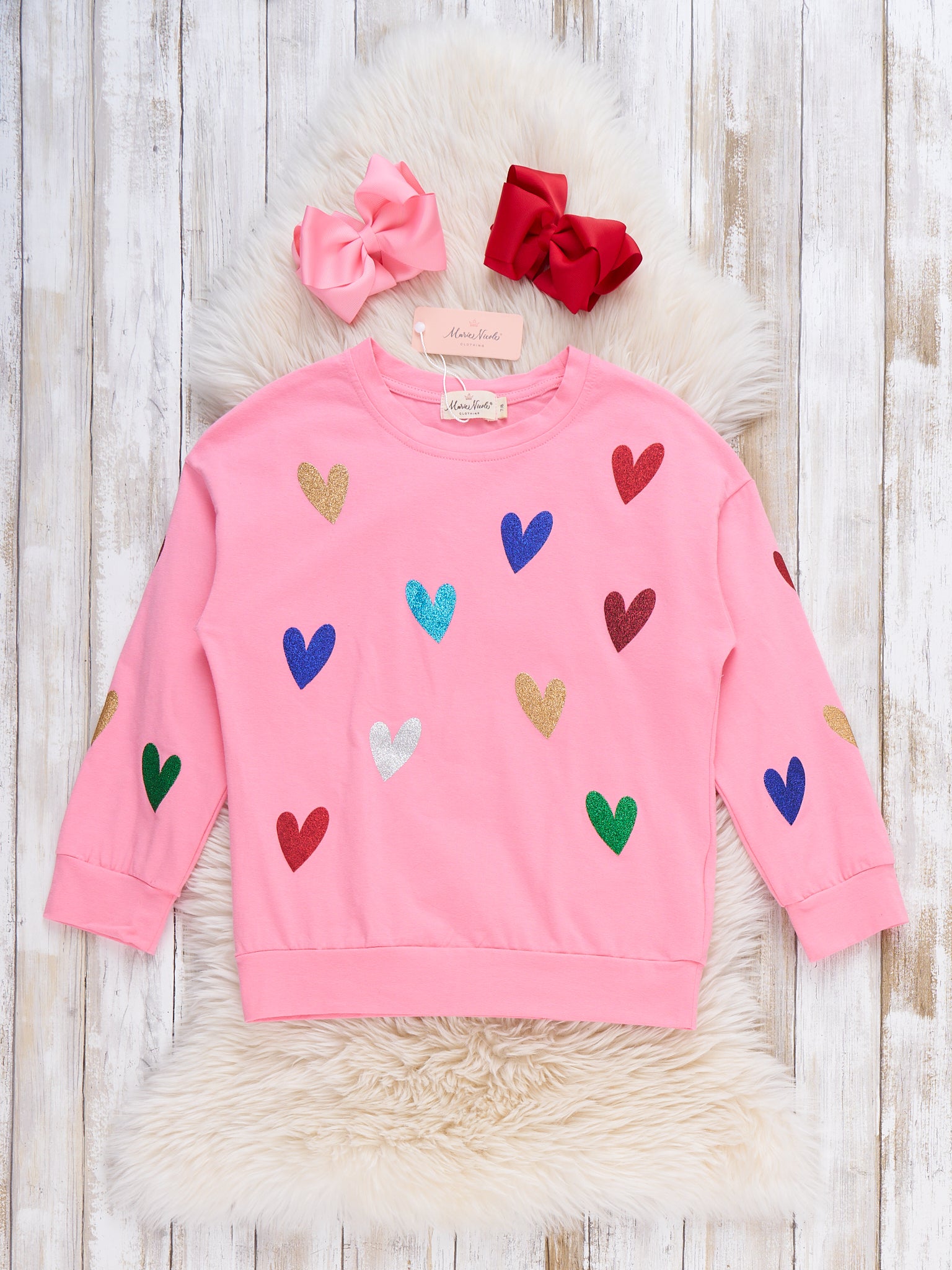 Spread cheer with the Pre-Teen Rainbow Hearts T-Shirt by Marie Nicole Clothing, featuring a playful arrangement of scattered hearts in a lively, all-over pattern. Designed for comfort and fun, this pullover is perfect for everyday wear or adding a festive touch to special occasions like Valentine's Day or birthdays—celebrating love, smiles, and vibrant personality in every outfit.