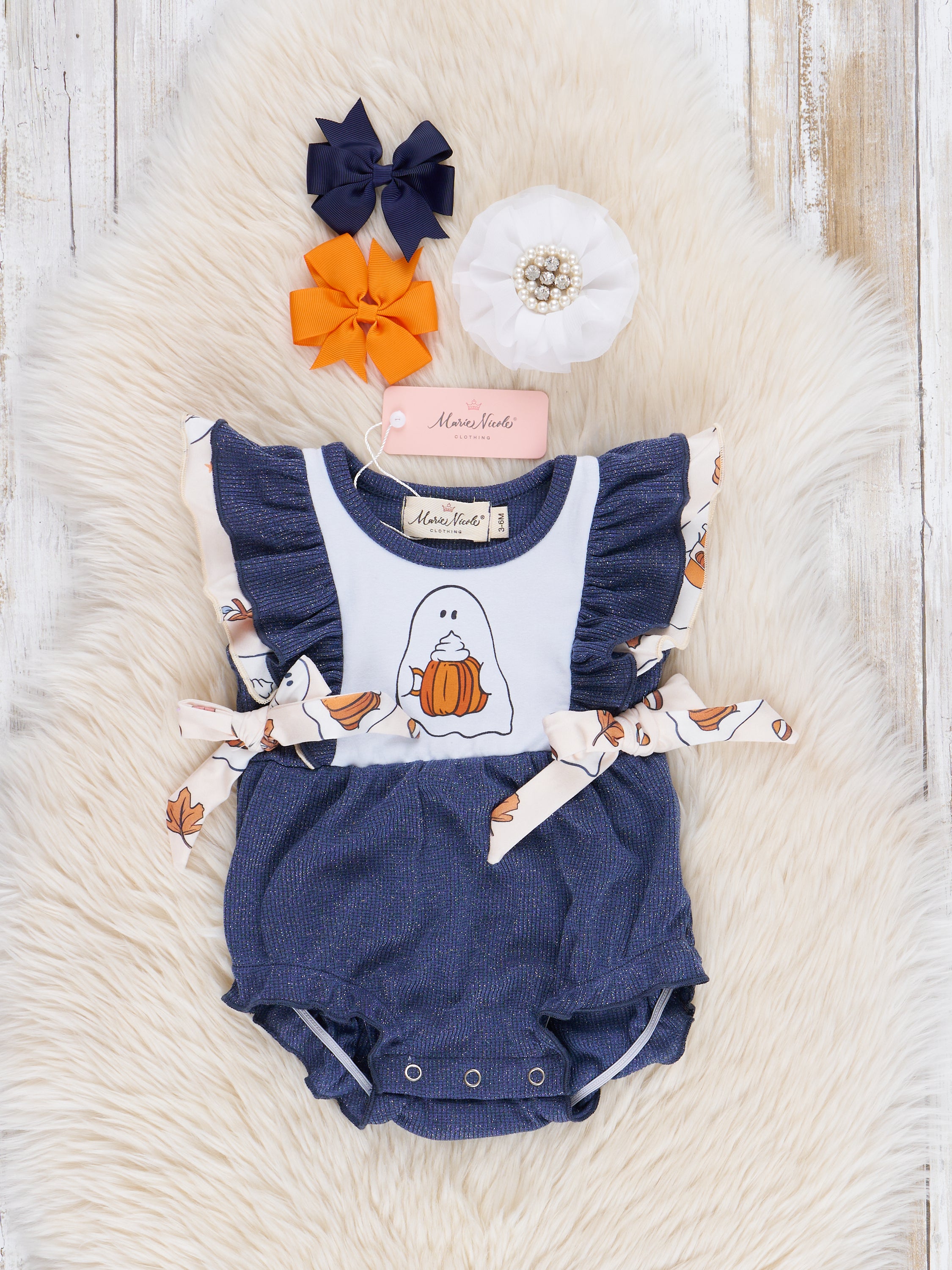 Get ready for Halloween with our Pumpkin Spice Ghost sister set! This ruffle bubble is made from soft chambray and features adorable ghost design. Perfect for your little girl to enjoy the spooky season in style.