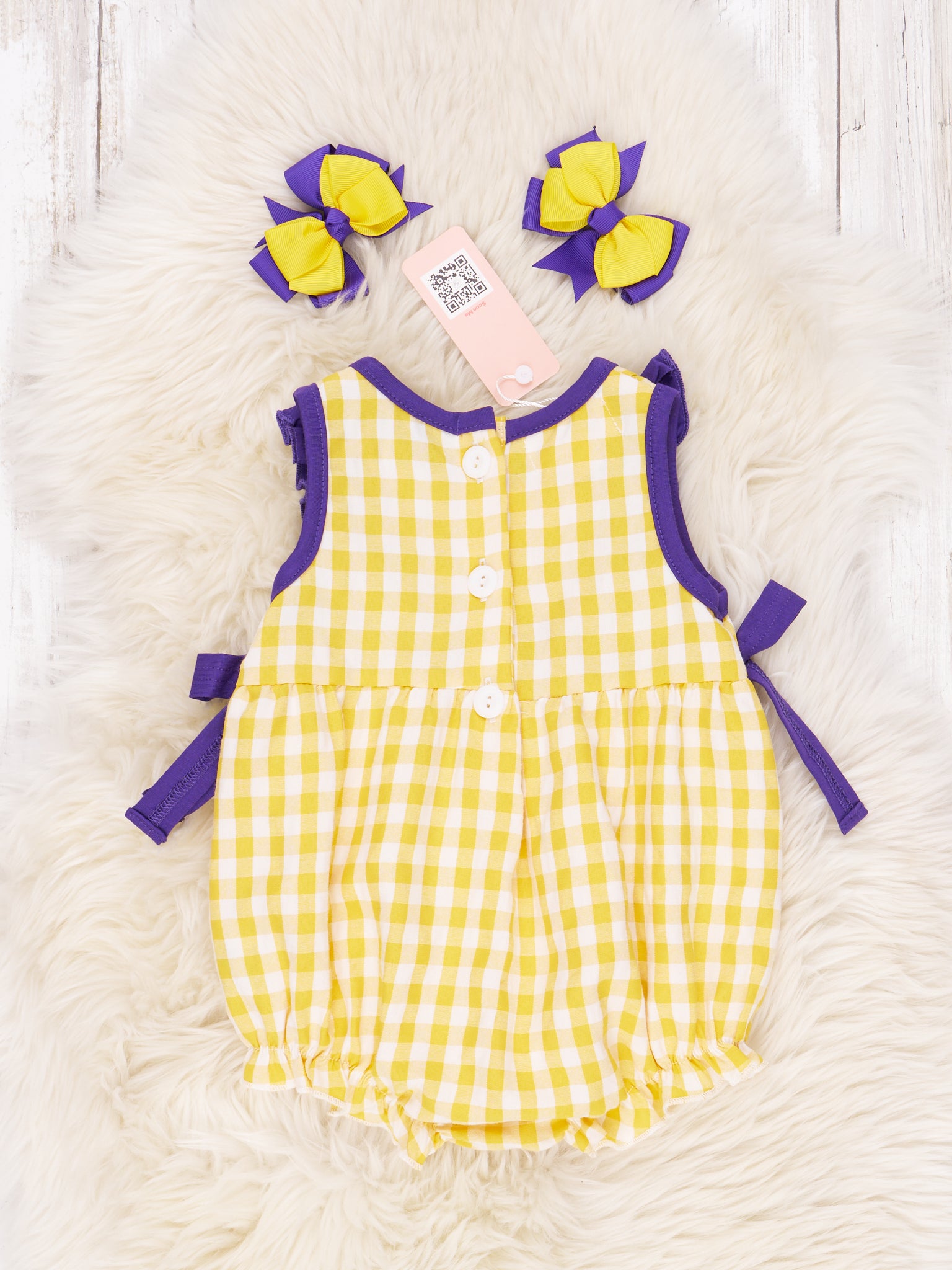 Stay stylish with this family-friendly collegiate set! This Purple & Gold Romper comes in a fresh gingham design and is perfect for any family outing. Get your matching set now and show your sports-themed pride!