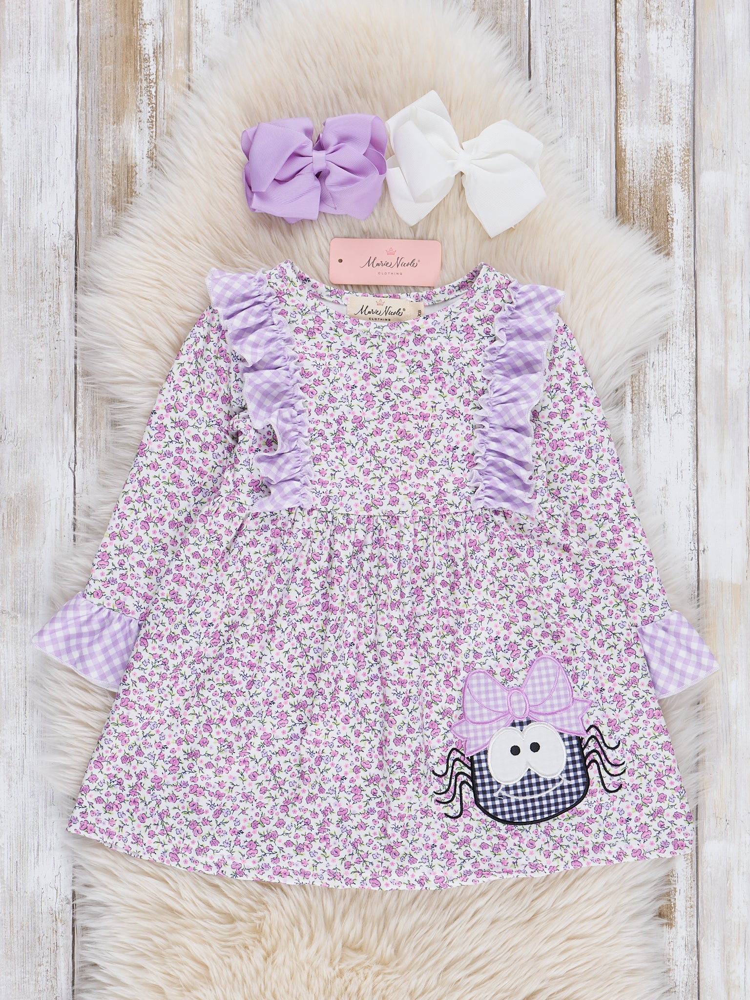 This dress will leave you stuck in it's web! This vintage floral dress features a sassy spider appliqué with purple gingham ruffles.