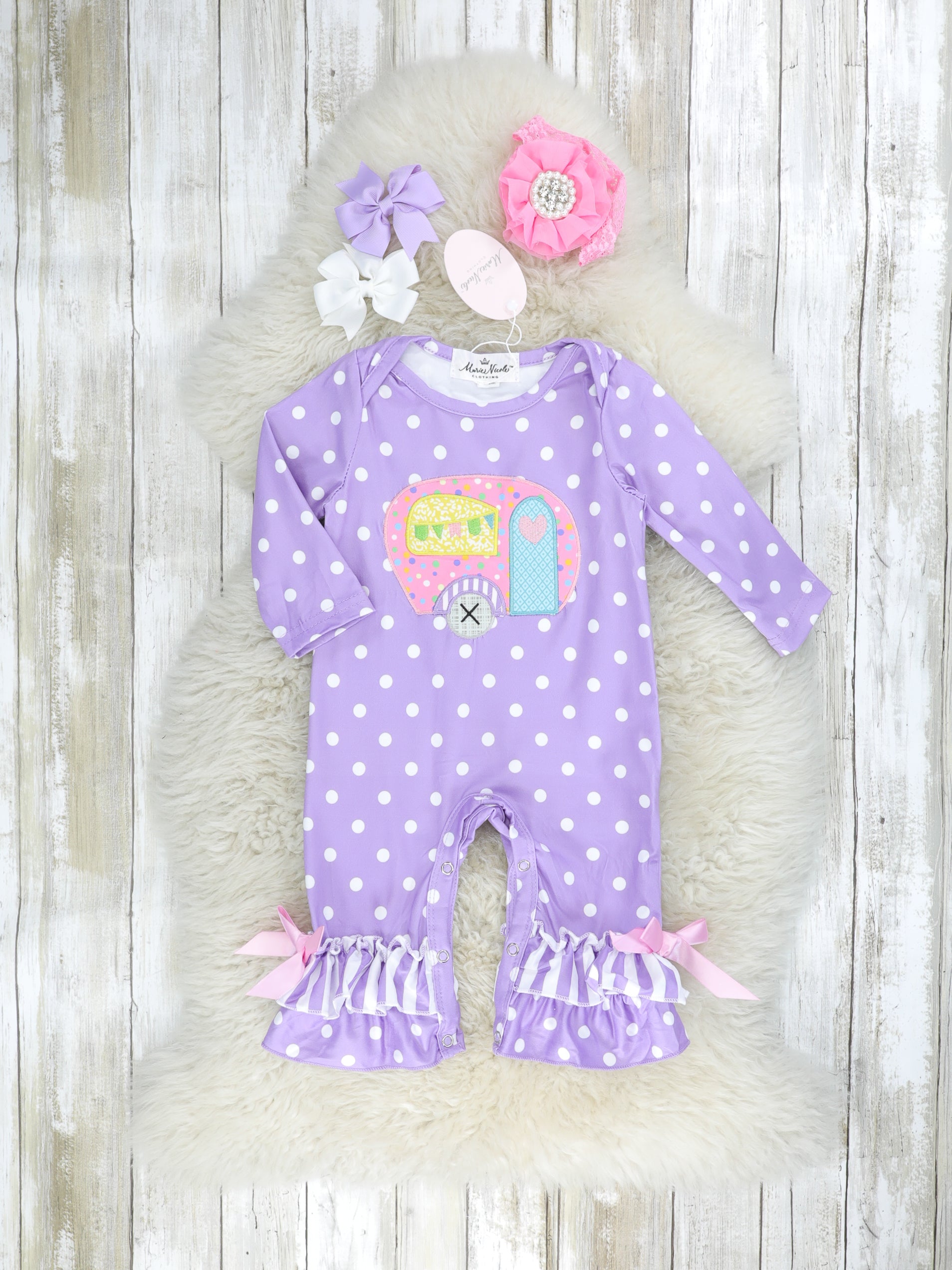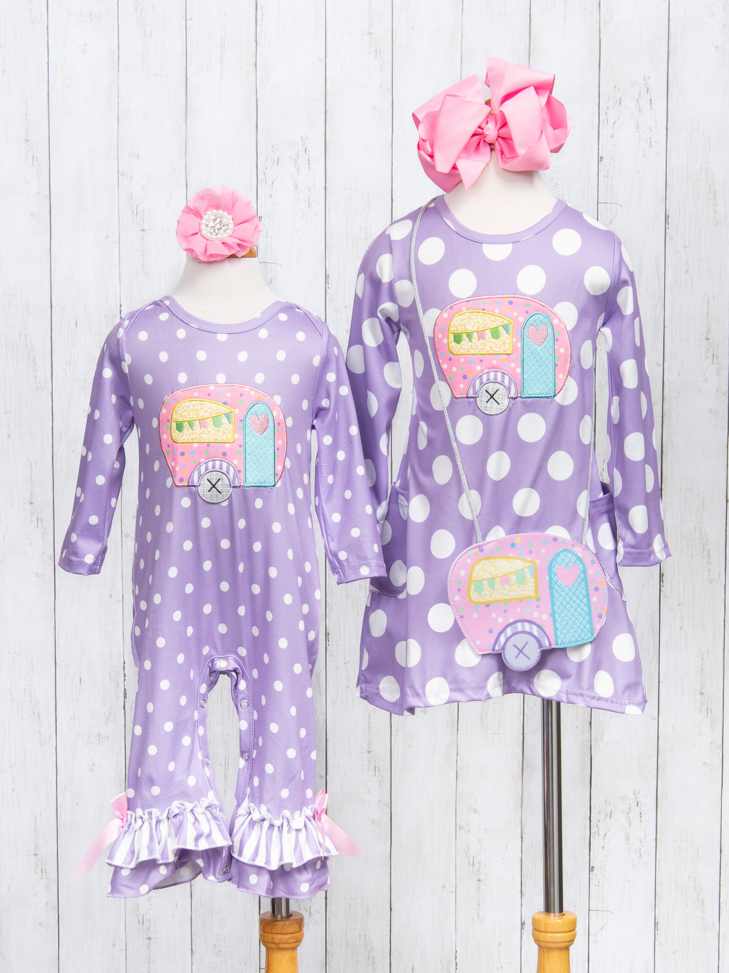 Take your sweet girls on an adVANture in this gorgeous sister set! This purple romper features polka dots, striped ruffles, a darling camper appliqué, & bow details at the ankles.