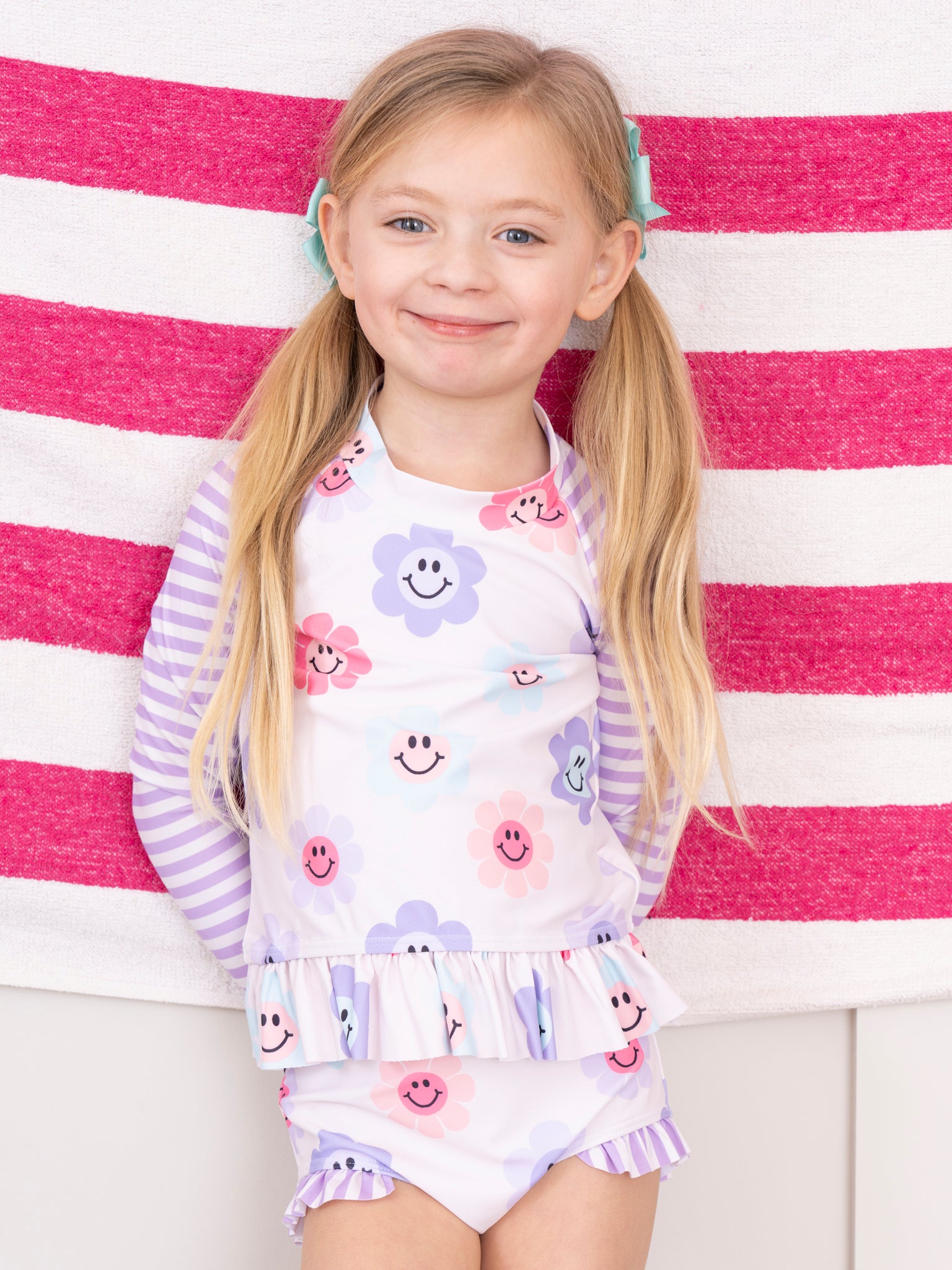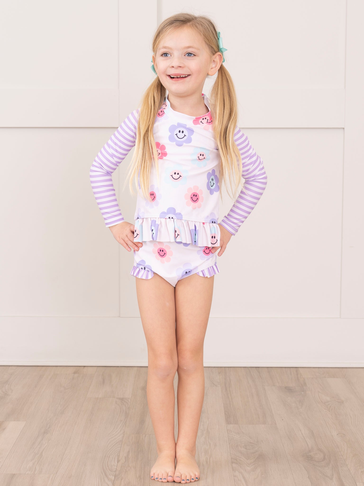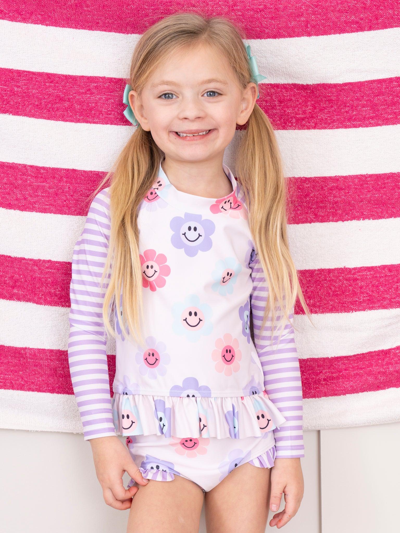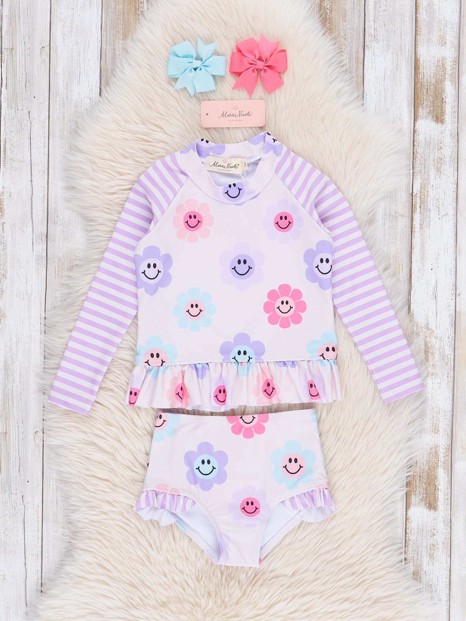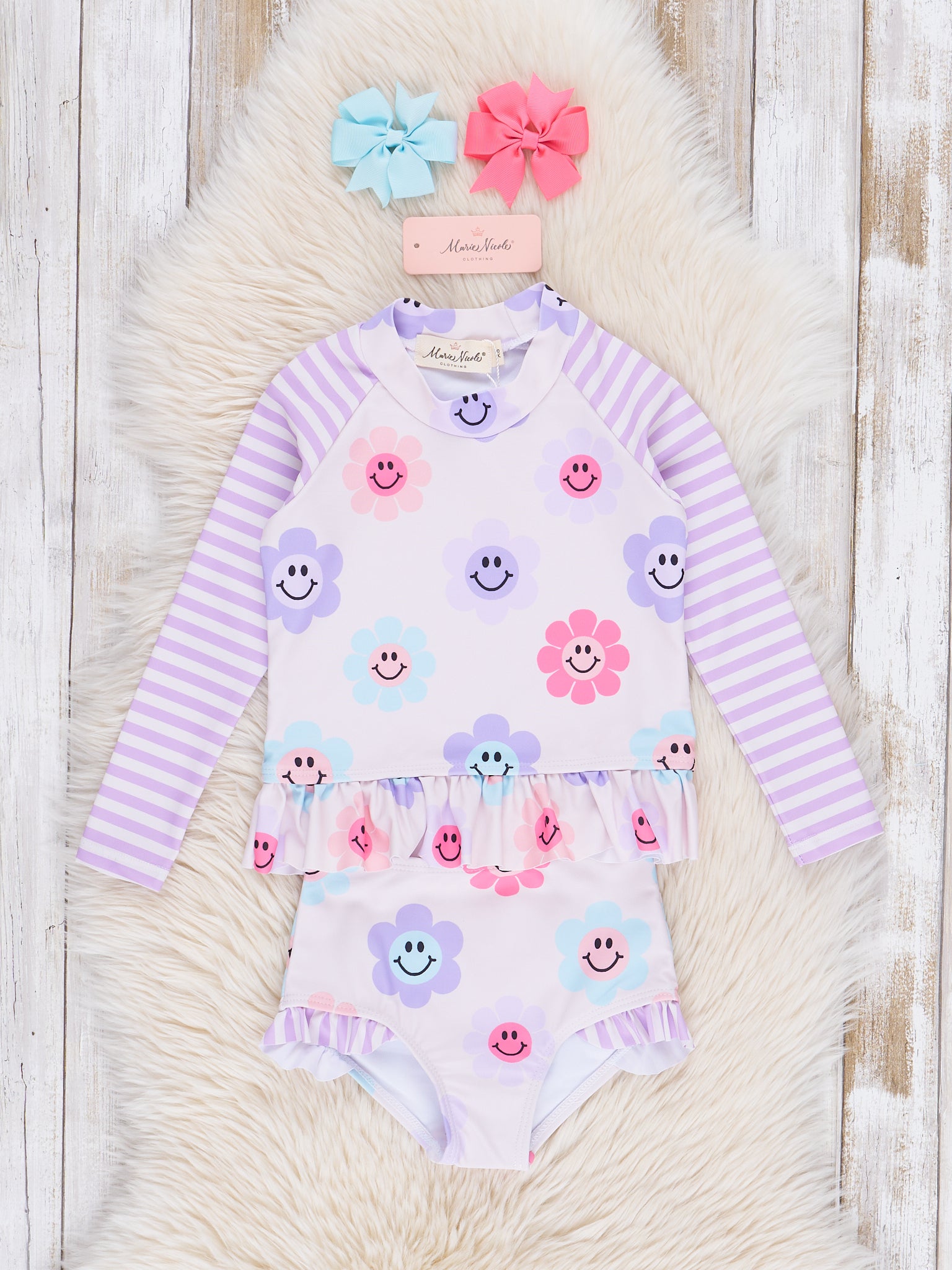 Add a pop of personality to your little one's swimwear collection with our Purple Smiley Daisies Two Piece Rashguard. This girls swimsuit features a playful smiley face print and striped raglan sleeves, perfect for a fun day at the pool or beach. From summer adventures to pool parties, this swimsuit from Marie Nicole Clothing has got them covered.