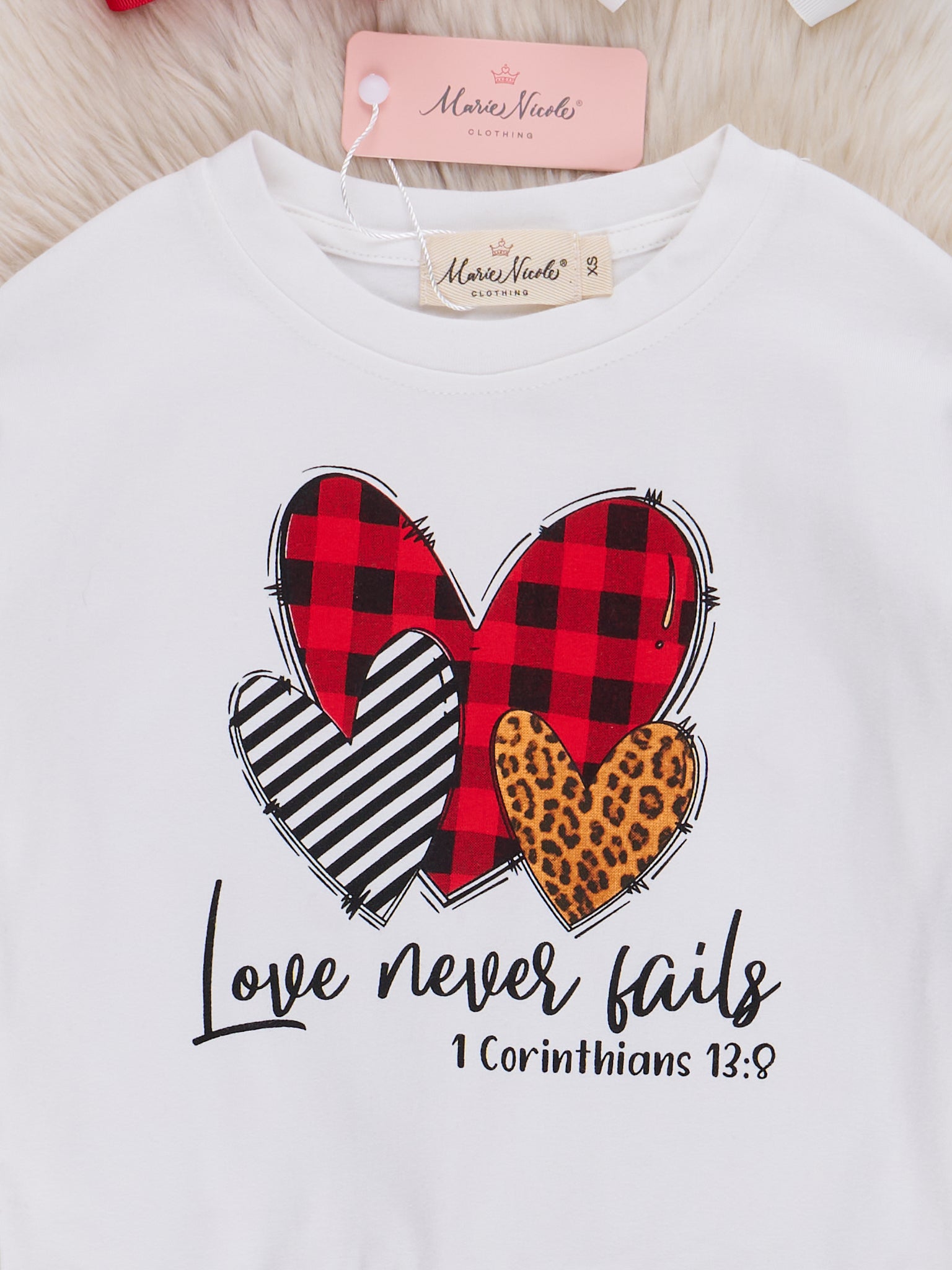 Get ready to be adorably chic in our Red & Black Plaid Hearts Bell Bottoms Outfit! With a cute "Love Never Fails" top and playful red & black plaid bell bottoms, your little girl will be the star of Valentine's Day. Spread love and style in this must-have outfit!