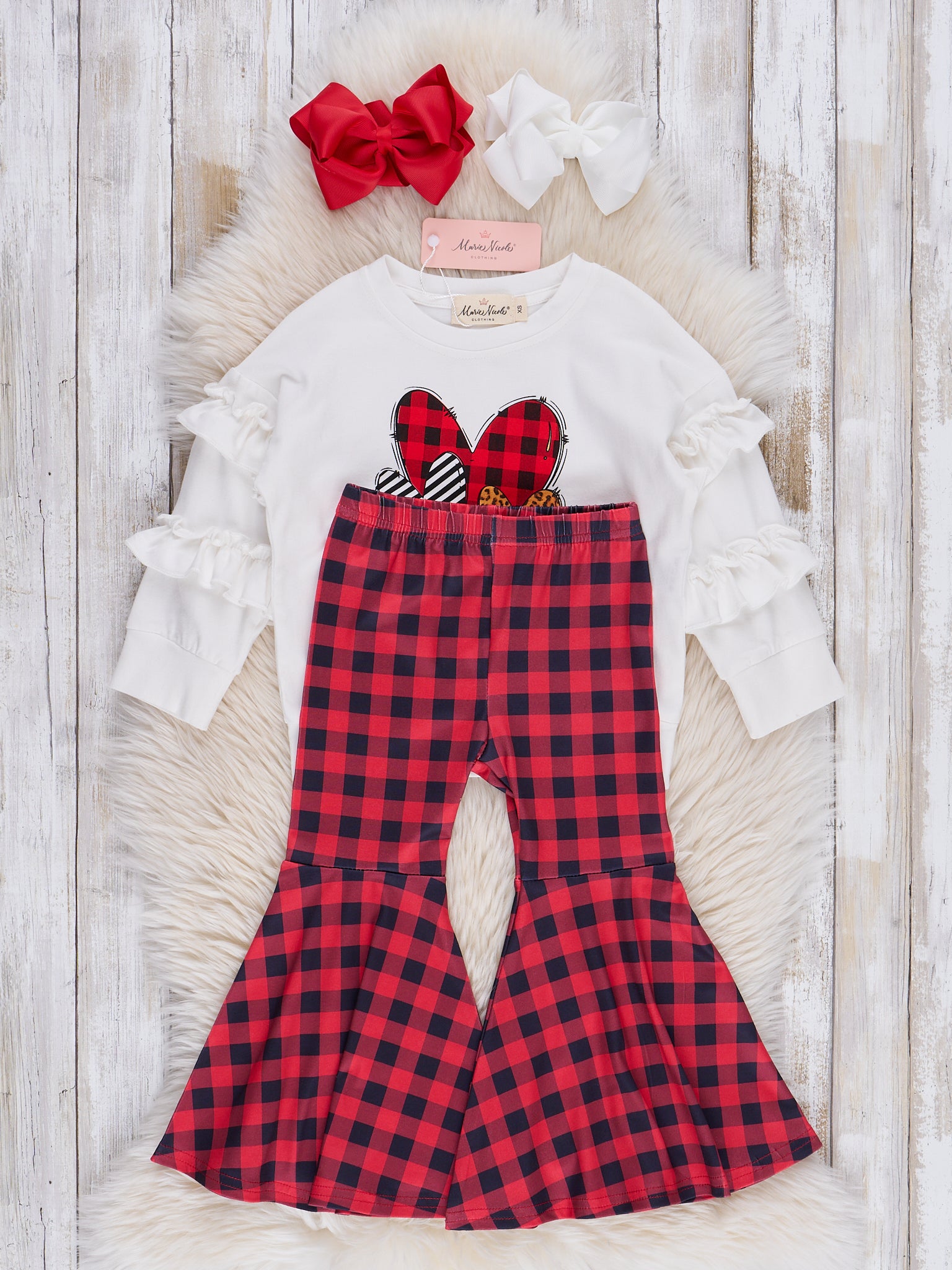 Red & Black Plaid Hearts Bell Bottoms Outfit